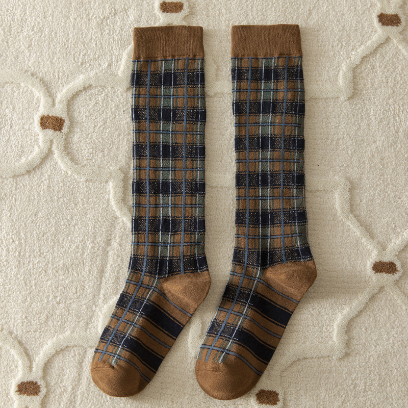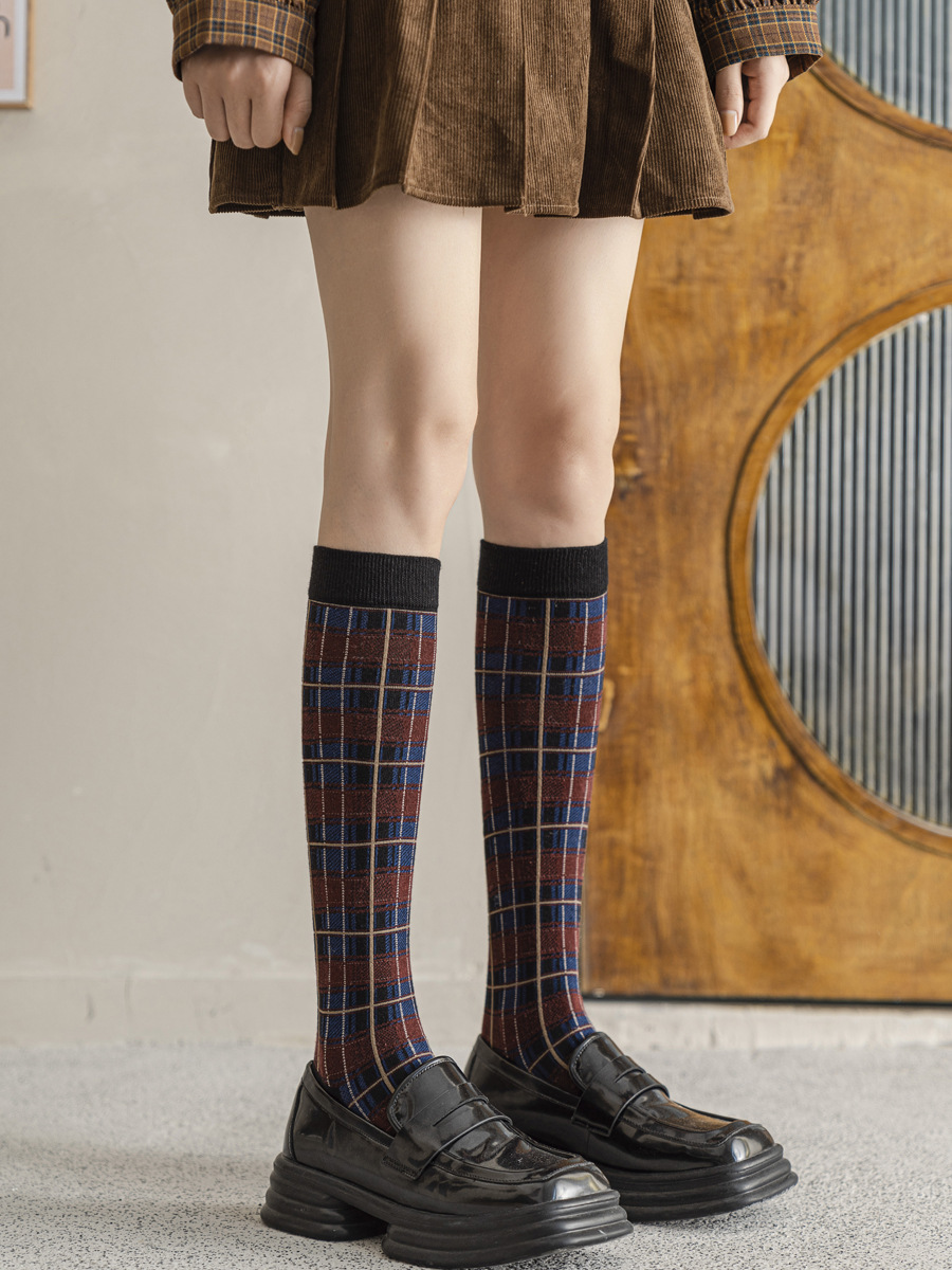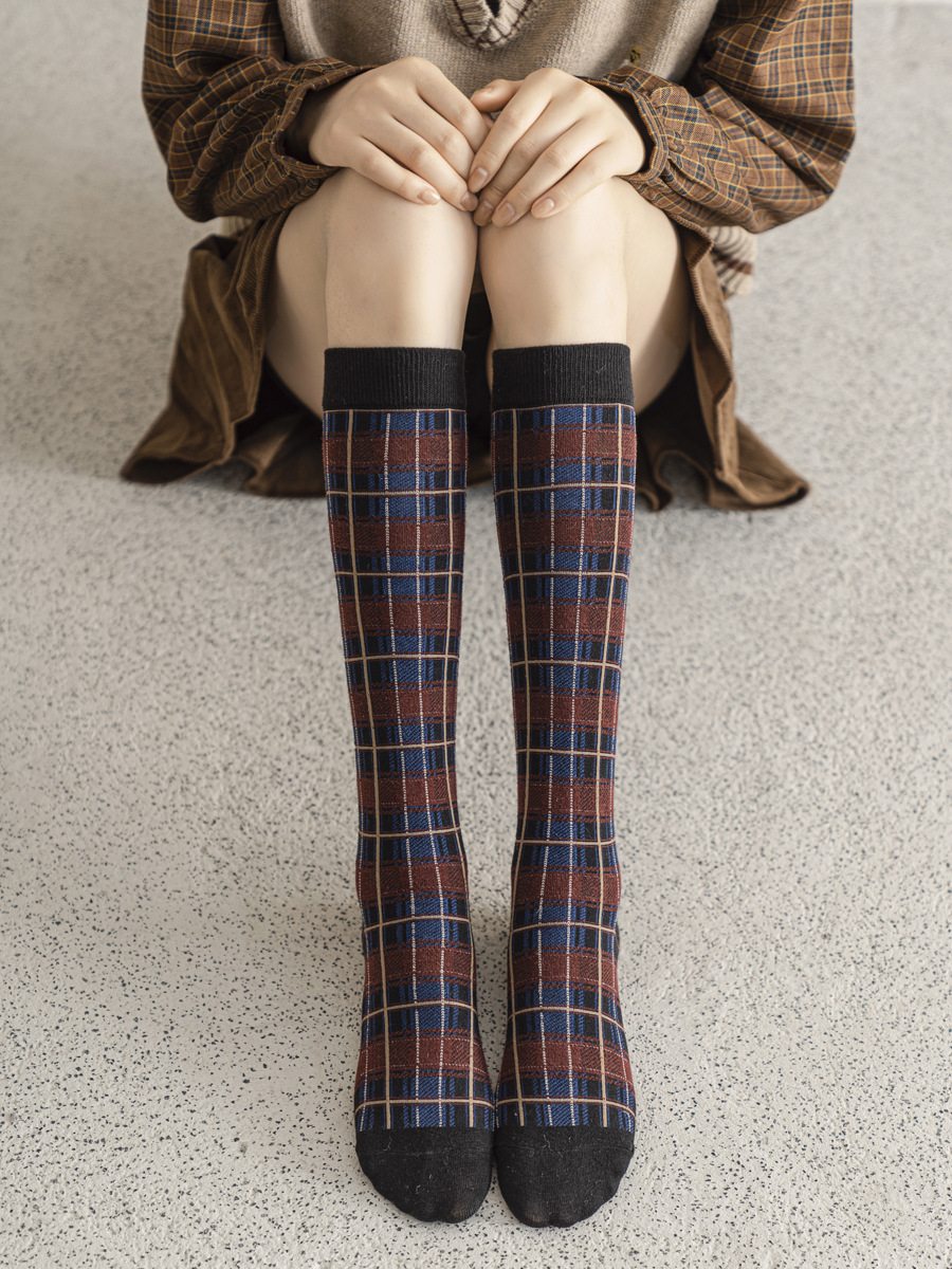 가을과 겨울 일본과 한국 스타일 레트로 얕은 양말 영국 아카데미 스타일 격자 무늬 슬리밍 다목적 높은 양말 면 여성 양말 배치스토어 가기
