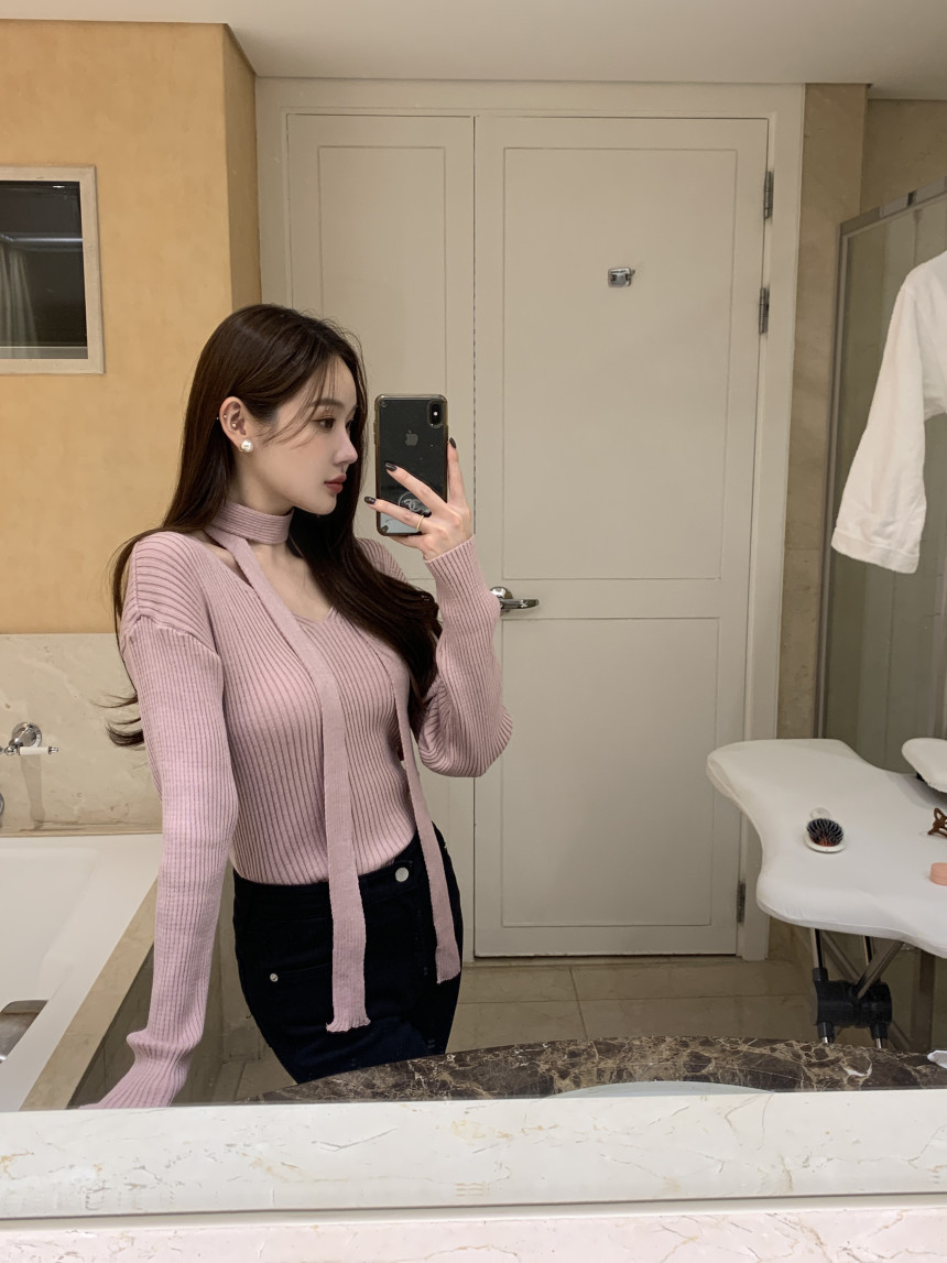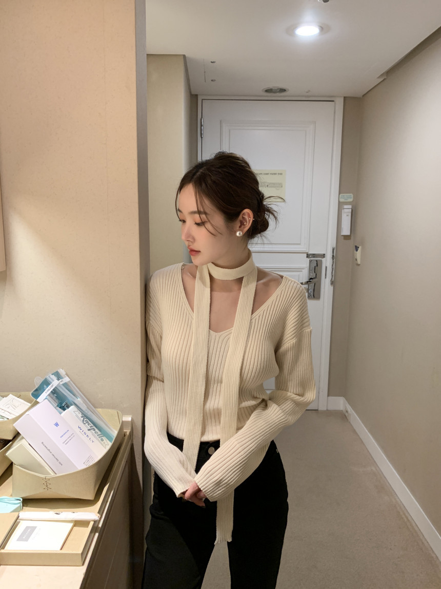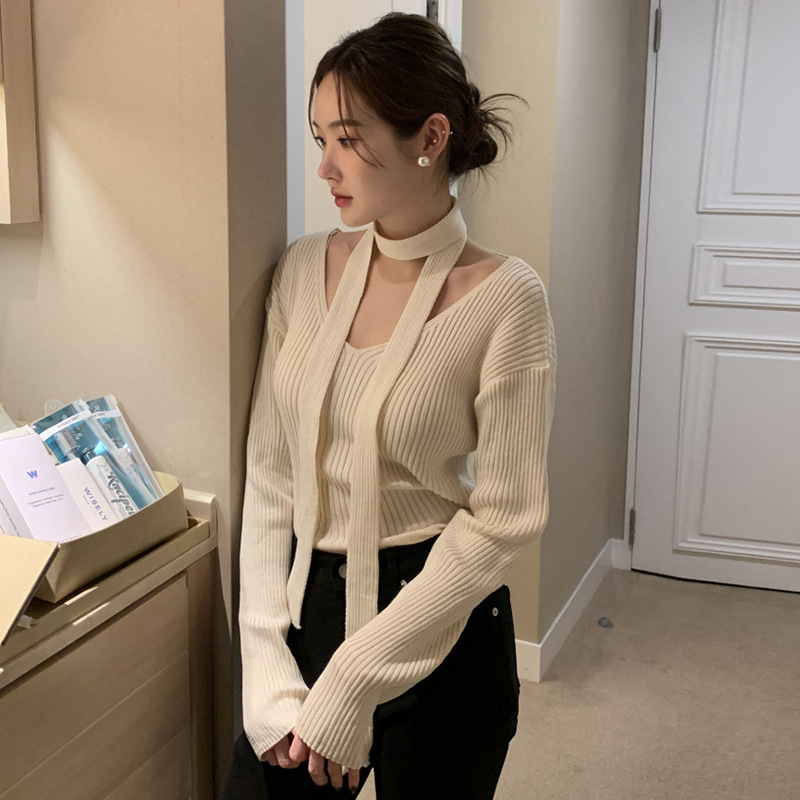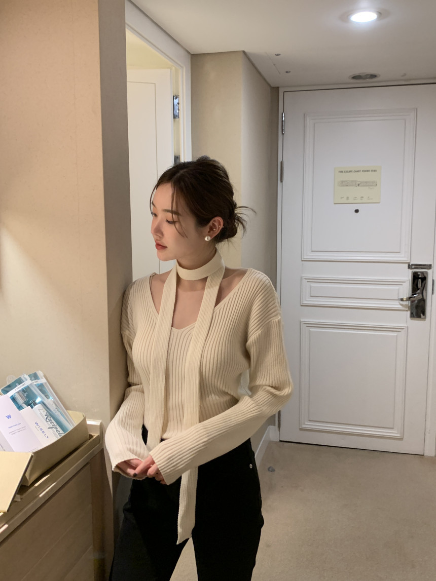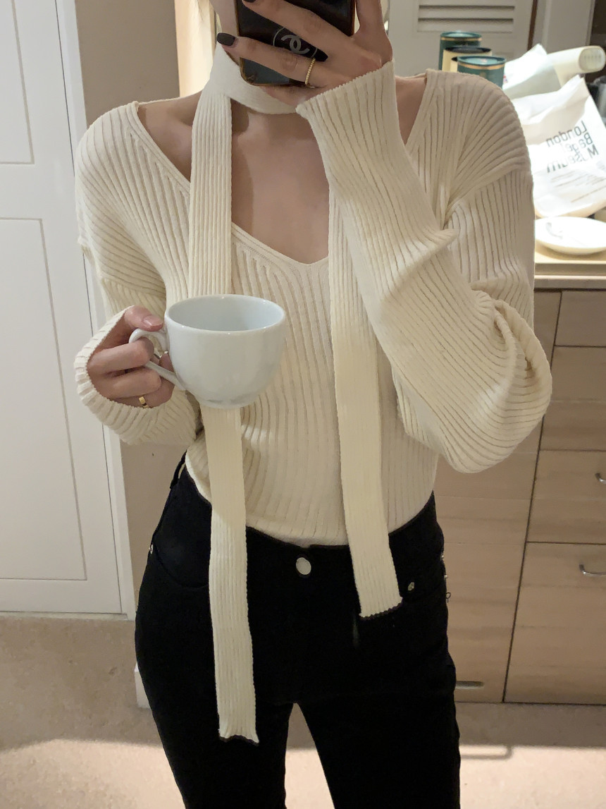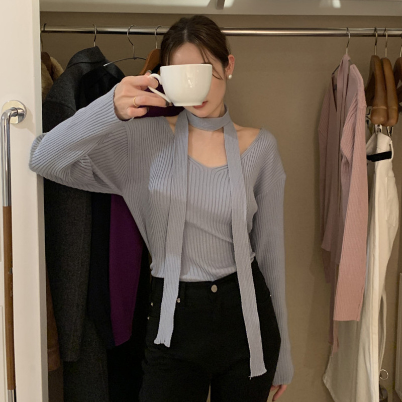 한국 스타일의 세련된 가을과 겨울 프랑스 스타일 우아한 V 넥 홀터 피트 슬림 핏 슬리밍 다목적 긴 소매 스웨터 스웨터스토어 가기