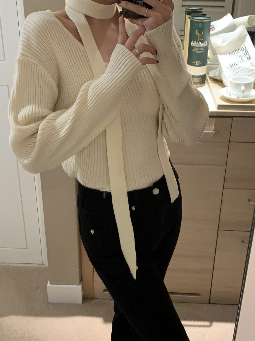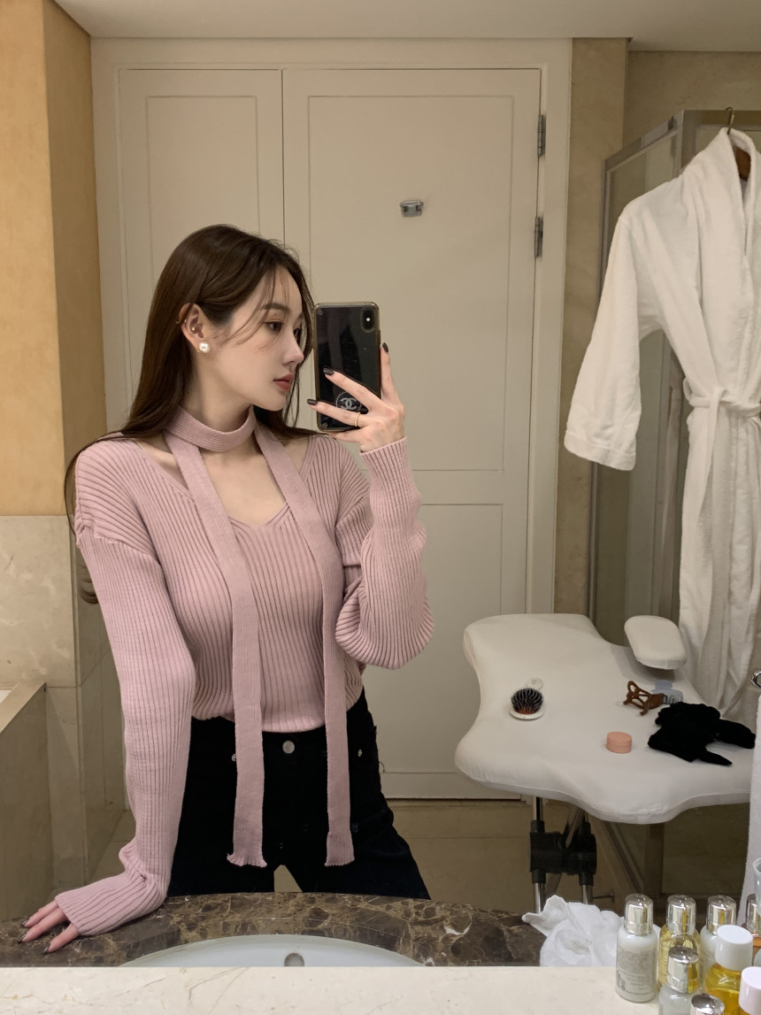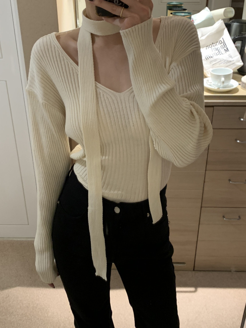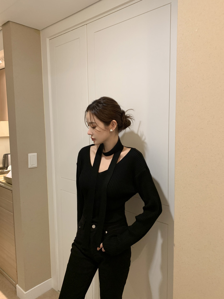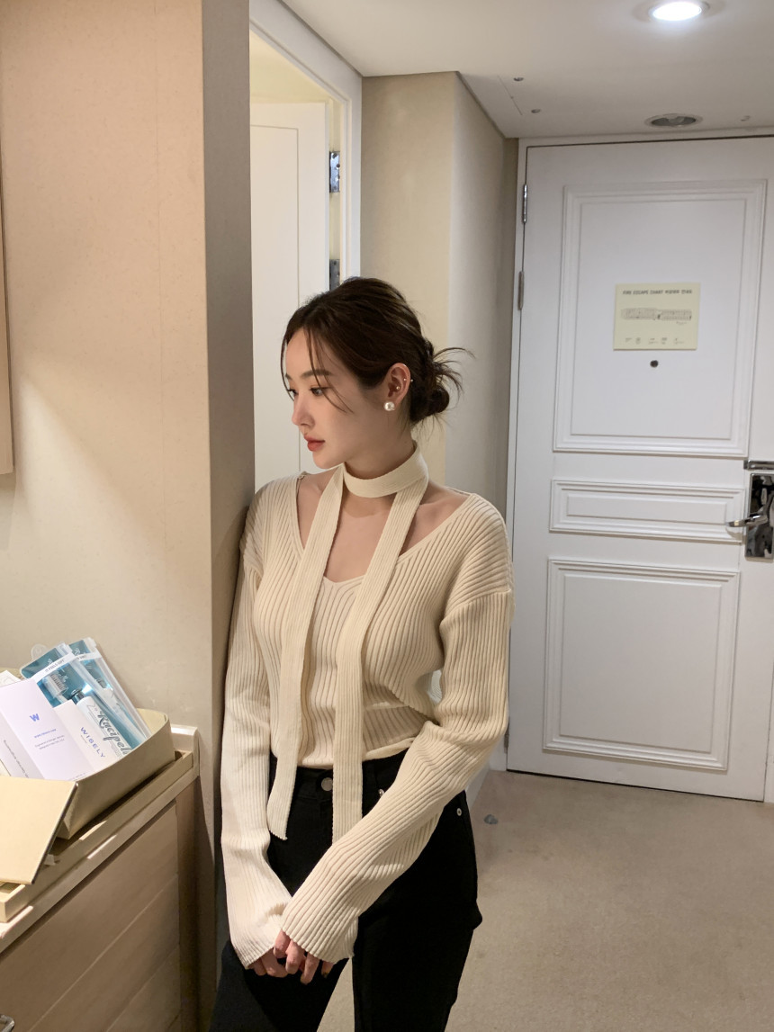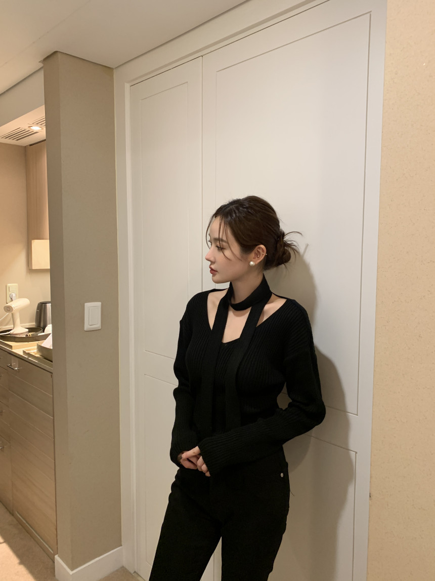 한국 스타일의 세련된 가을과 겨울 프랑스 스타일 우아한 V 넥 홀터 피트 슬림 핏 슬리밍 다목적 긴 소매 스웨터 스웨터스토어 가기