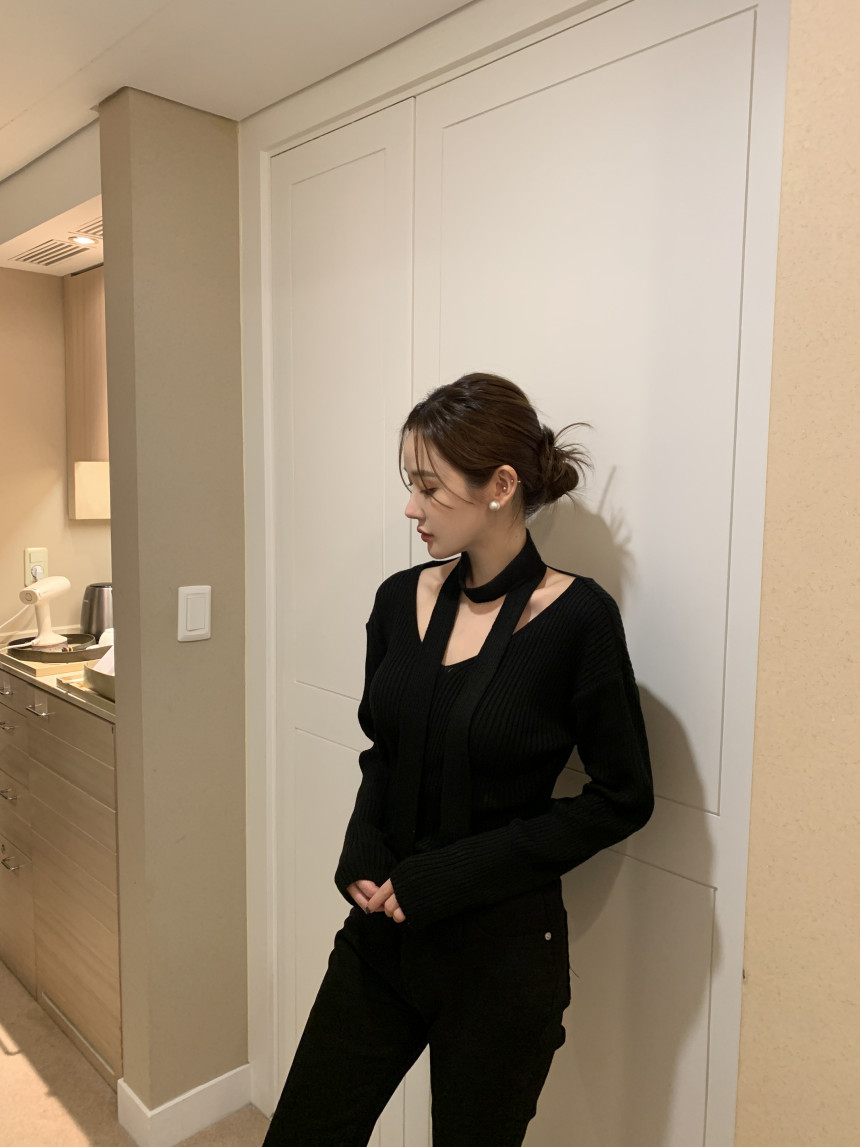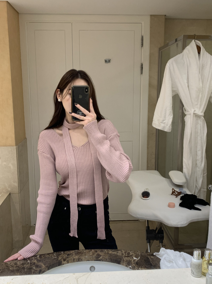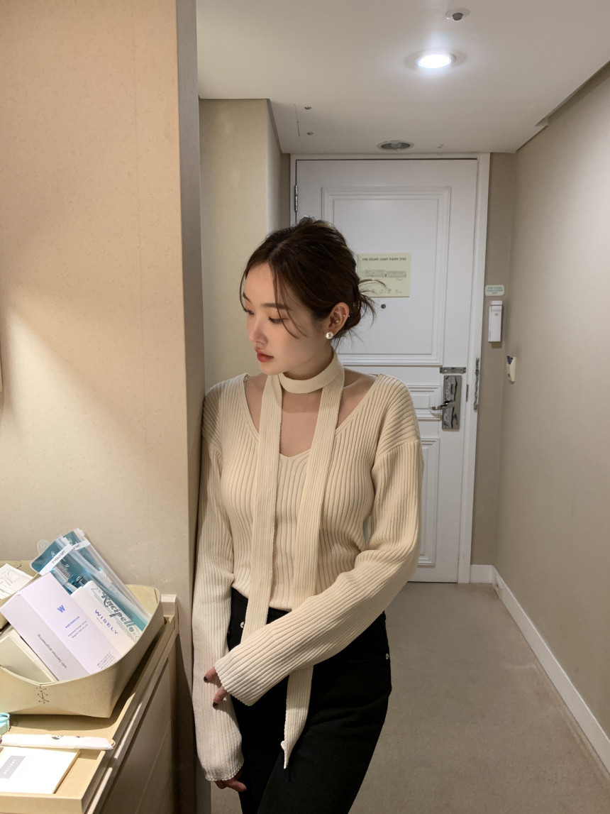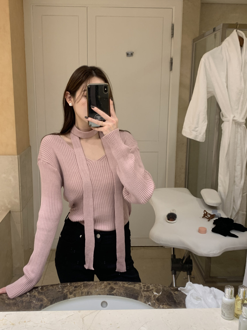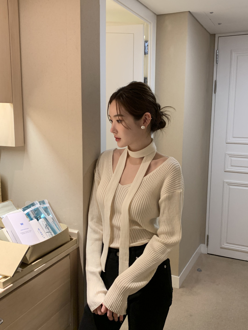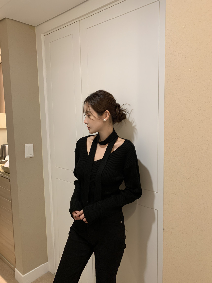 한국 스타일의 세련된 가을과 겨울 프랑스 스타일 우아한 V 넥 홀터 피트 슬림 핏 슬리밍 다목적 긴 소매 스웨터 스웨터스토어 가기
