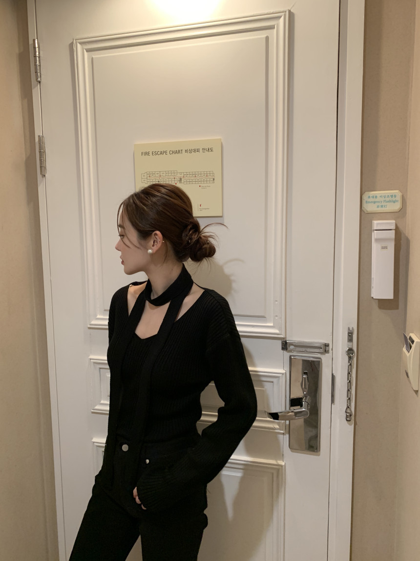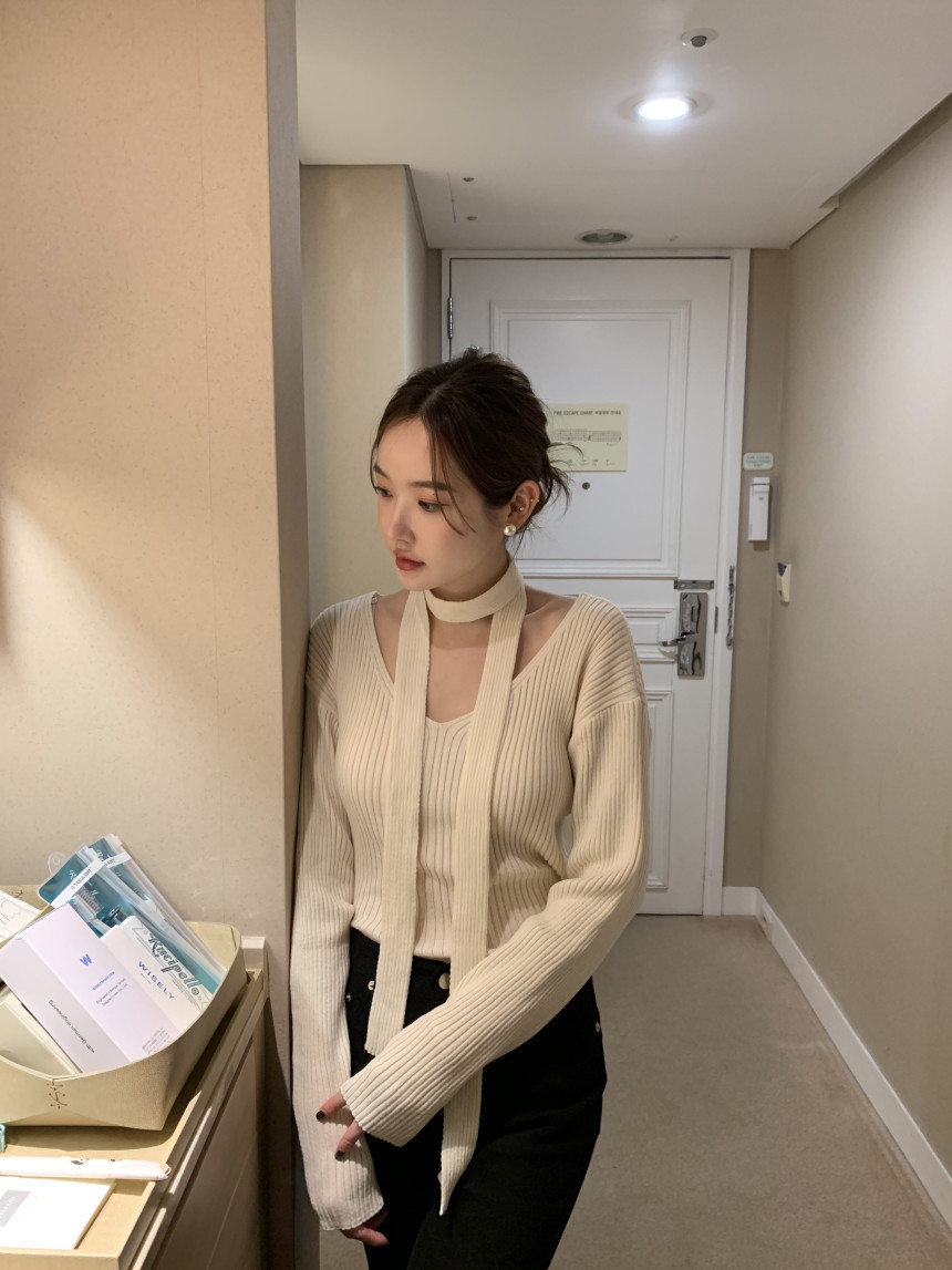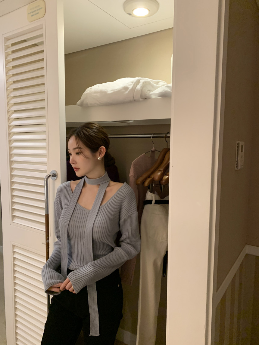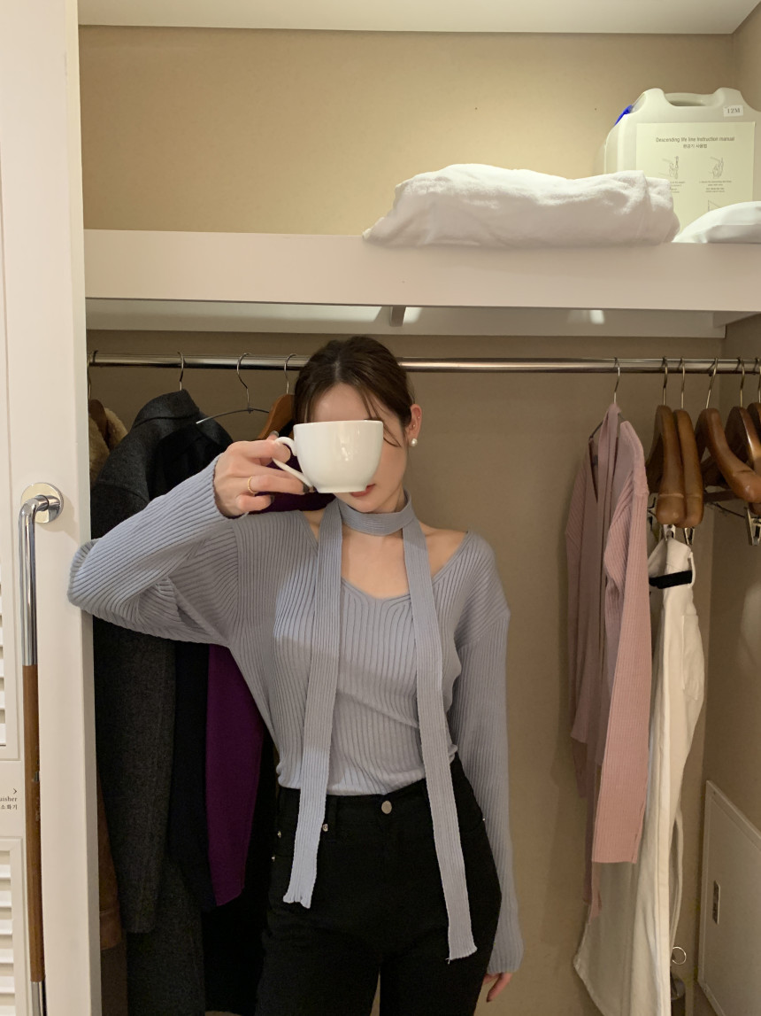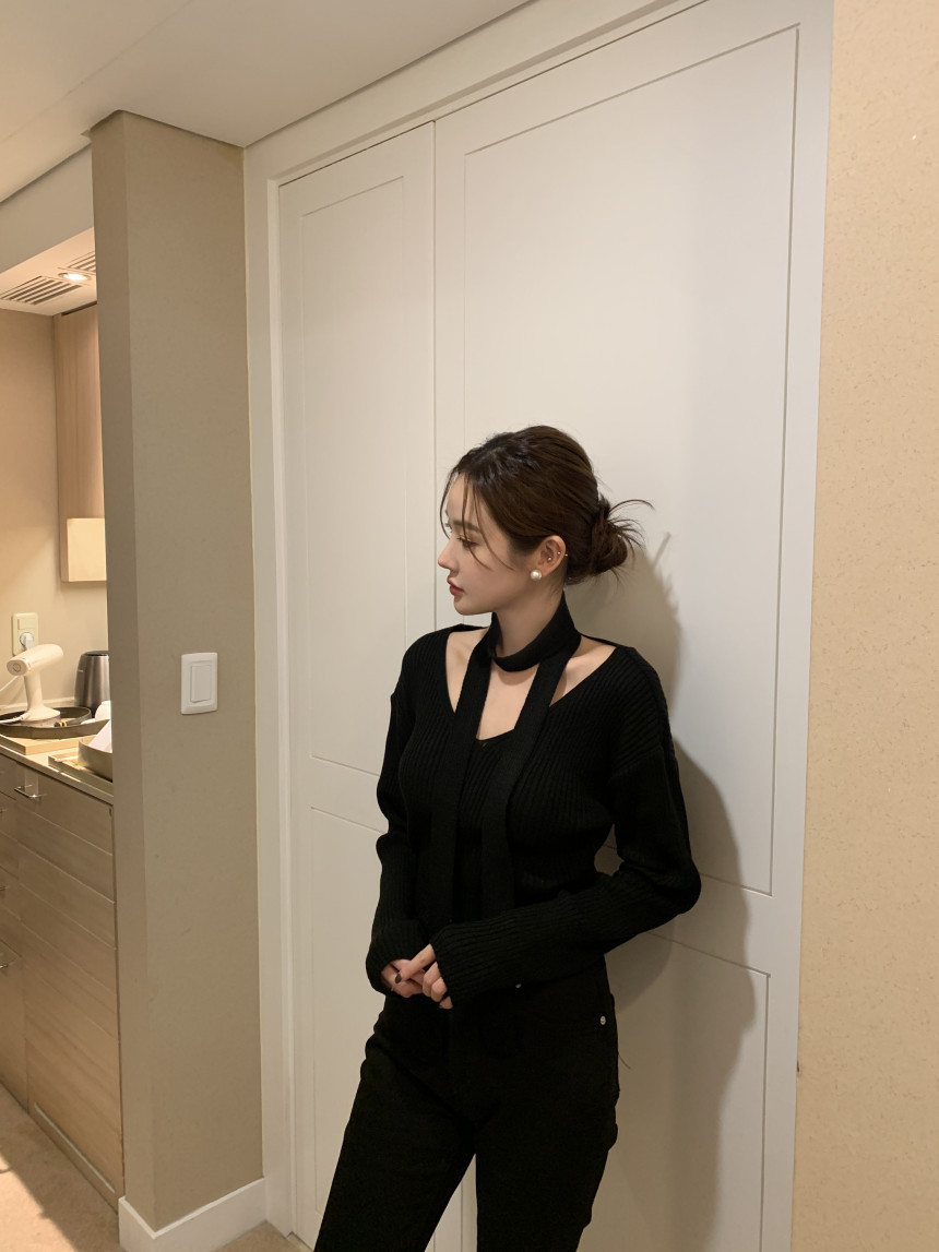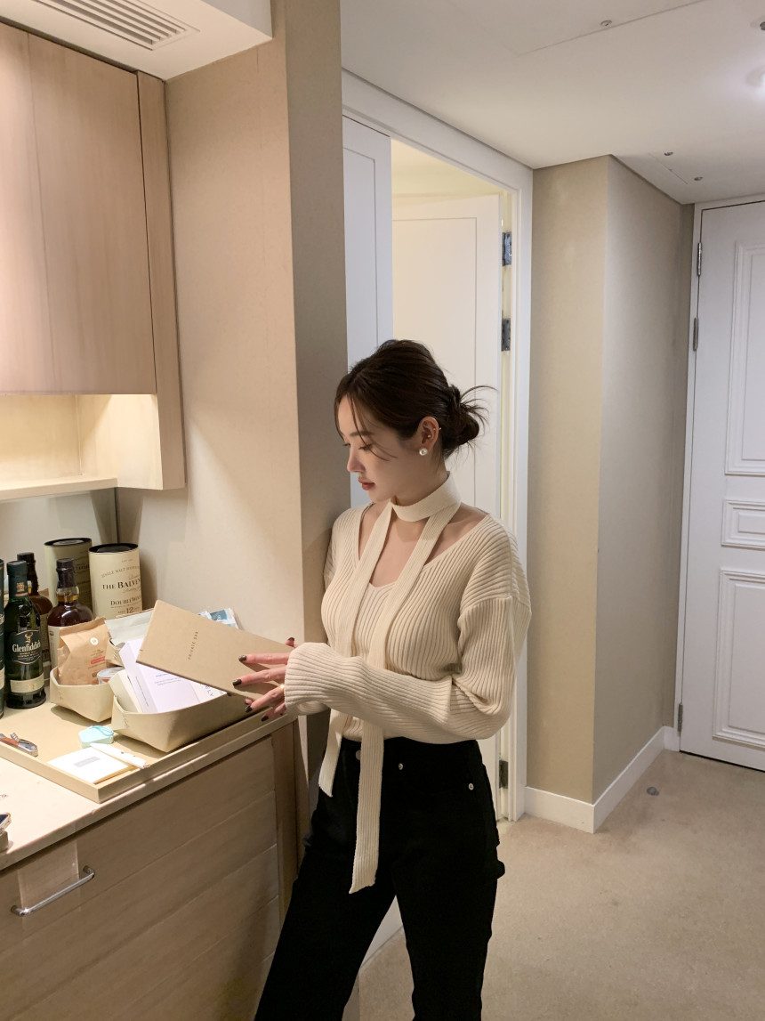 한국 스타일의 세련된 가을과 겨울 프랑스 스타일 우아한 V 넥 홀터 피트 슬림 핏 슬리밍 다목적 긴 소매 스웨터 스웨터스토어 가기