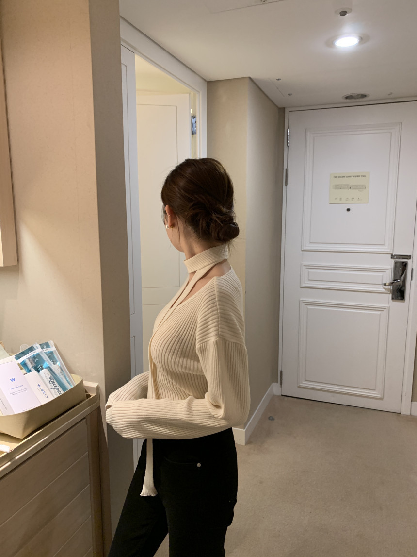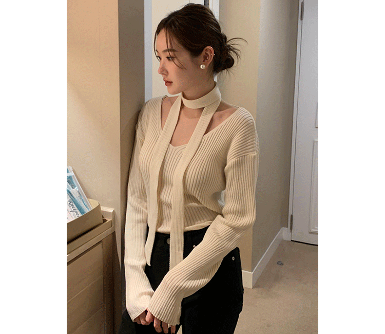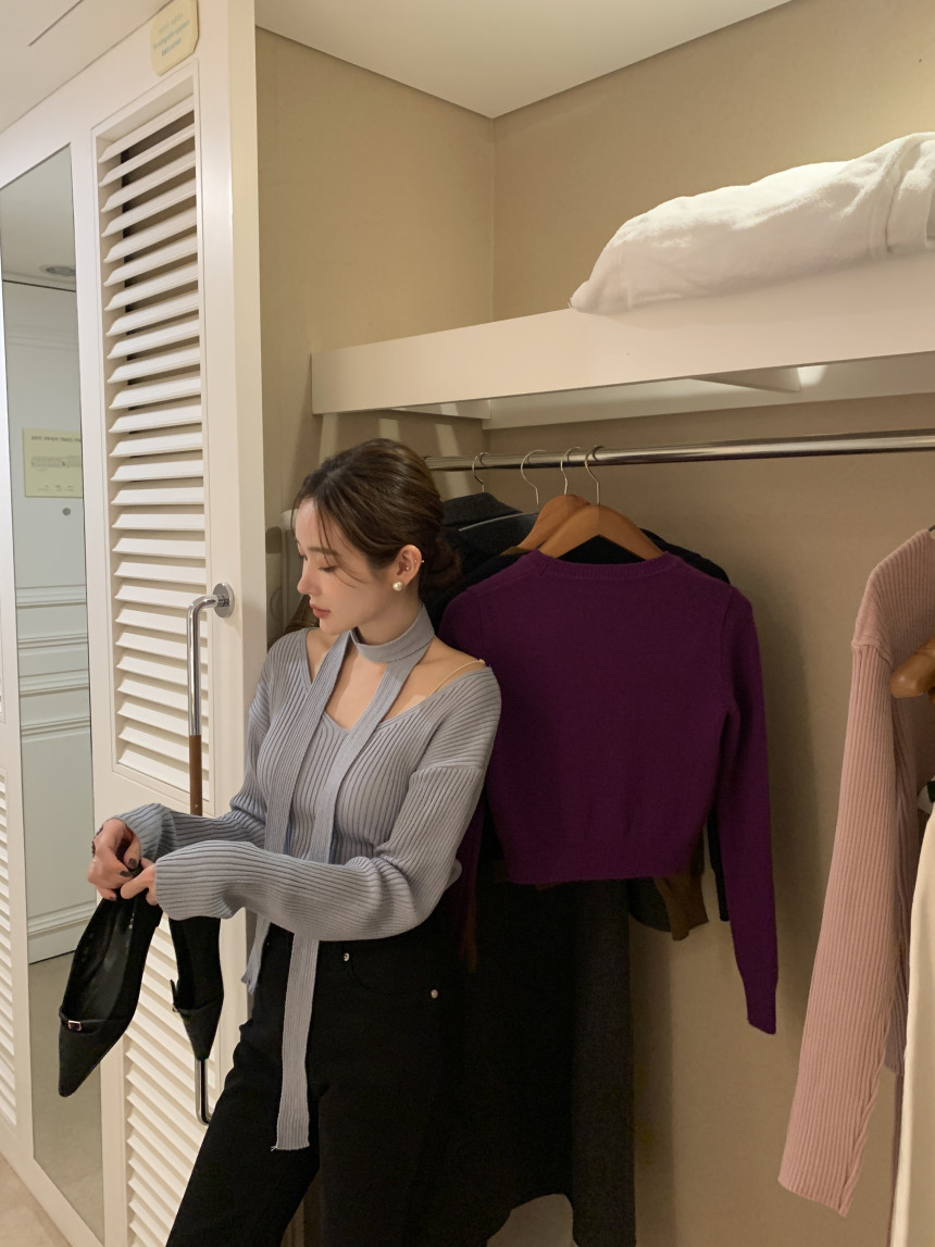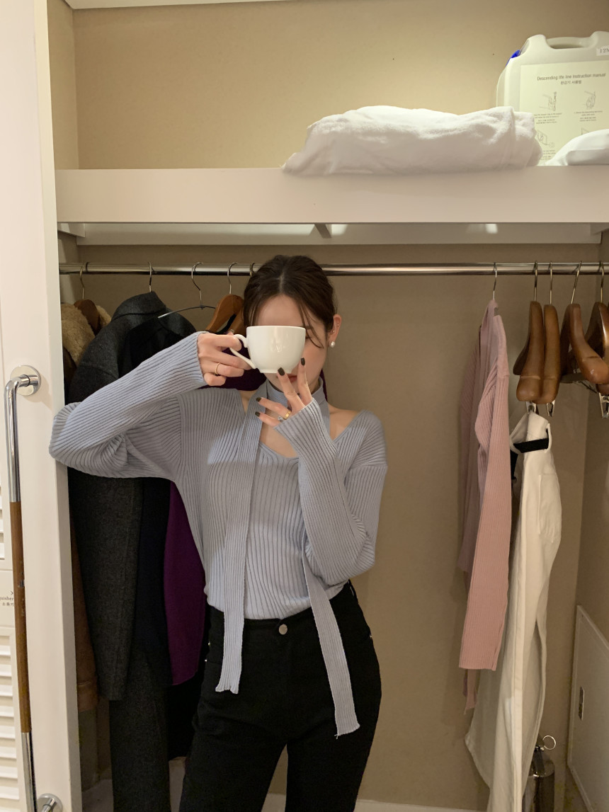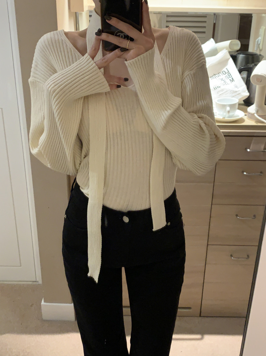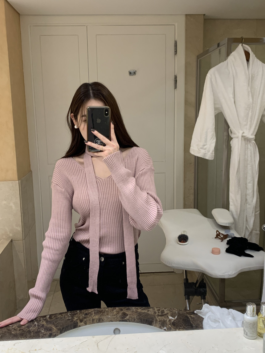 한국 스타일의 세련된 가을과 겨울 프랑스 스타일 우아한 V 넥 홀터 피트 슬림 핏 슬리밍 다목적 긴 소매 스웨터 스웨터스토어 가기