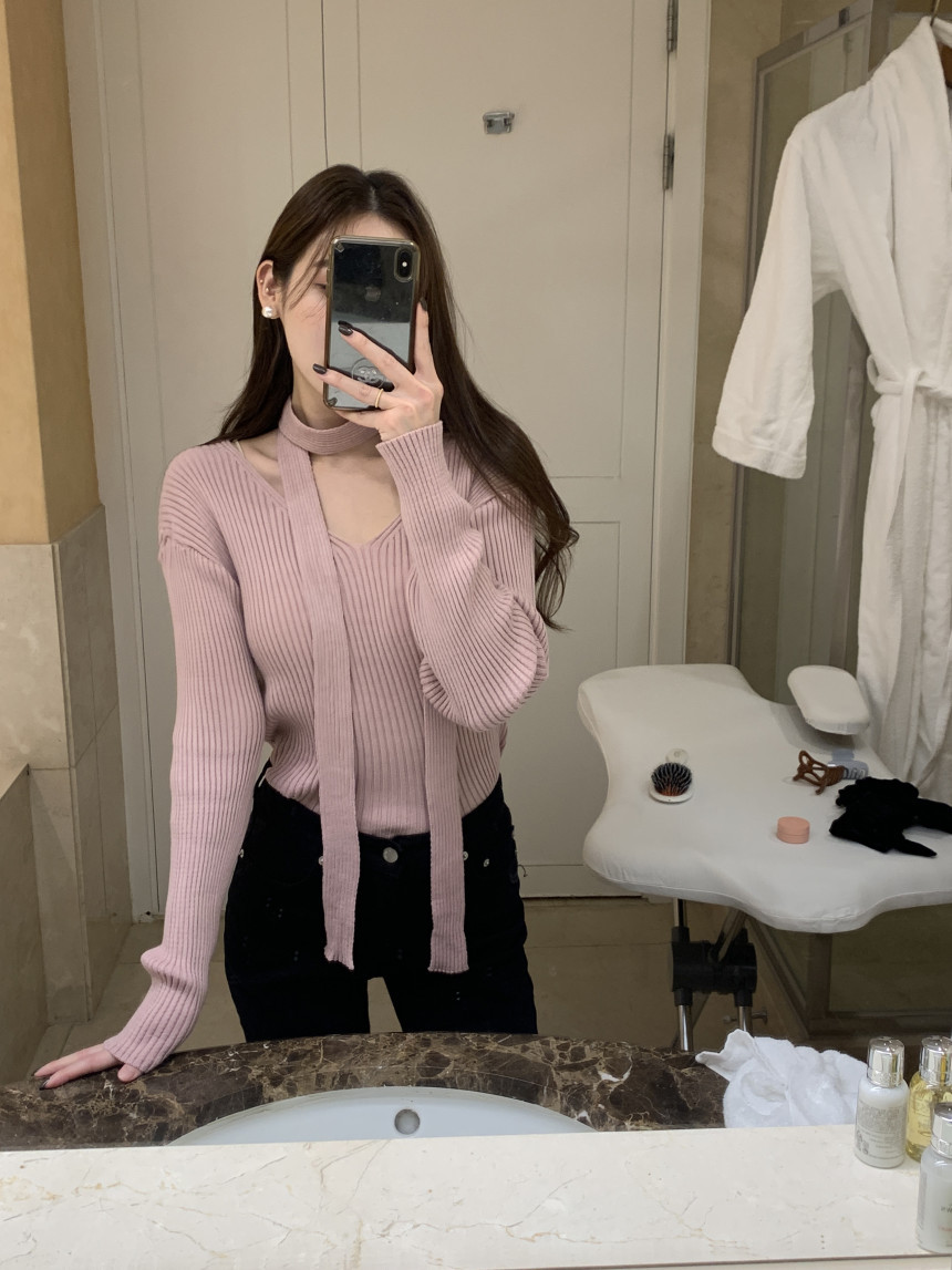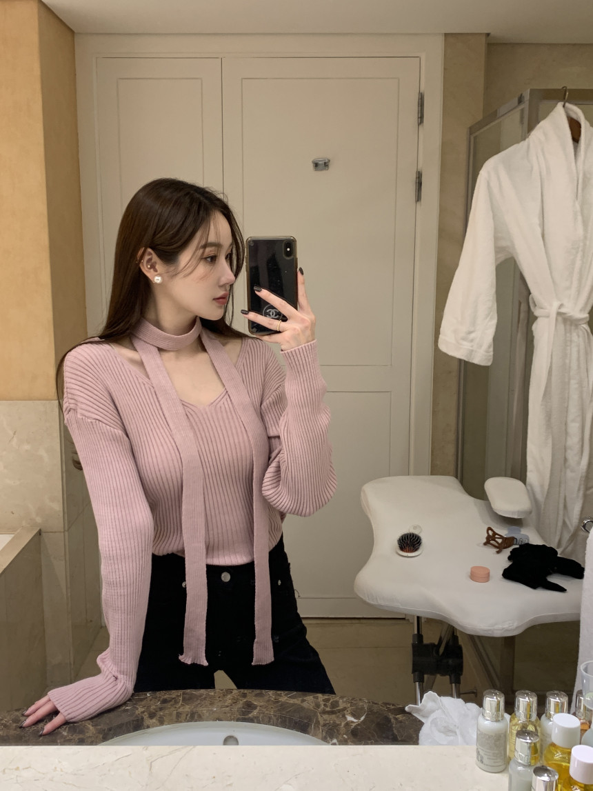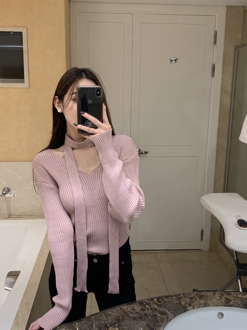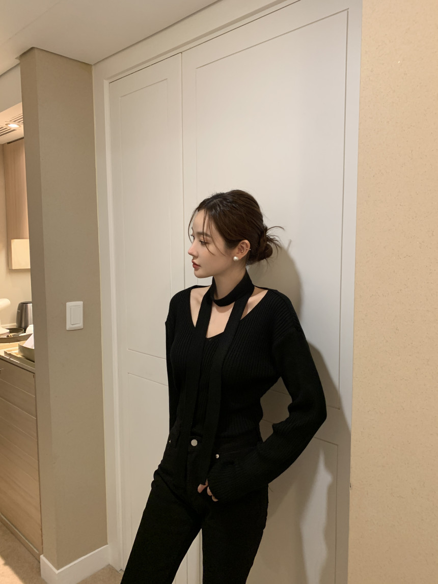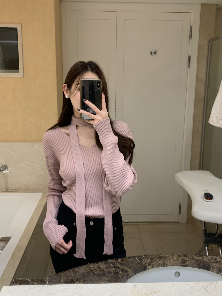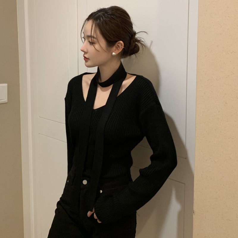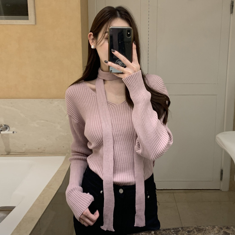 한국 스타일의 세련된 가을과 겨울 프랑스 스타일 우아한 V 넥 홀터 피트 슬림 핏 슬리밍 다목적 긴 소매 스웨터 스웨터