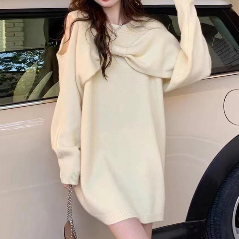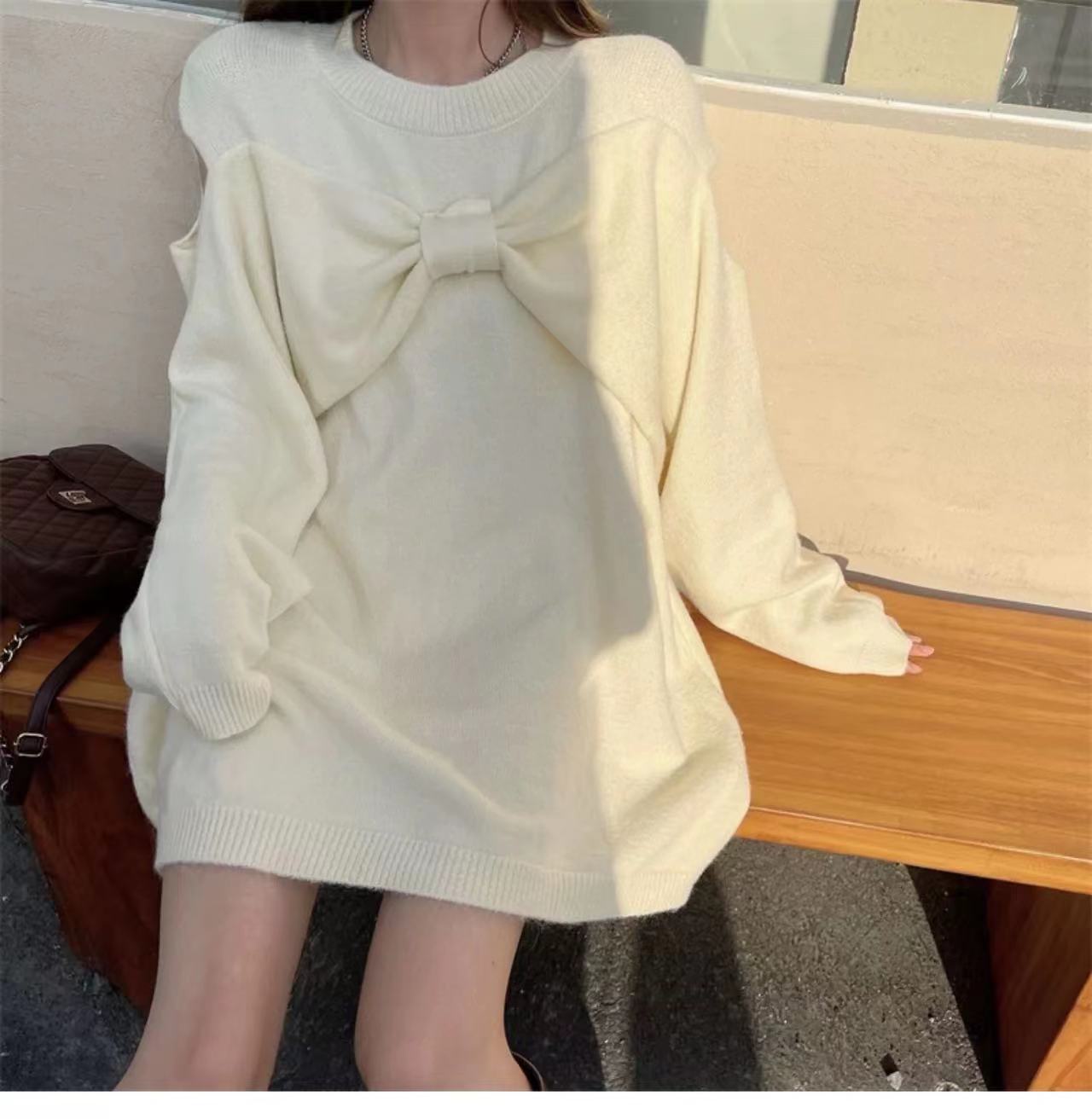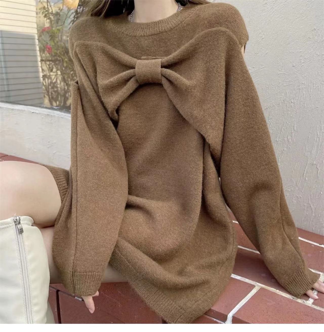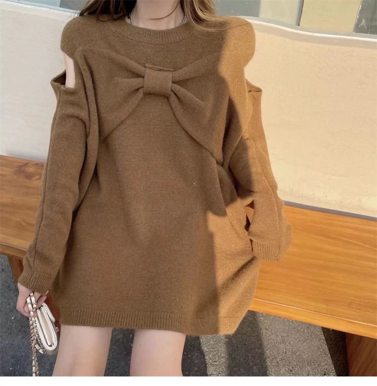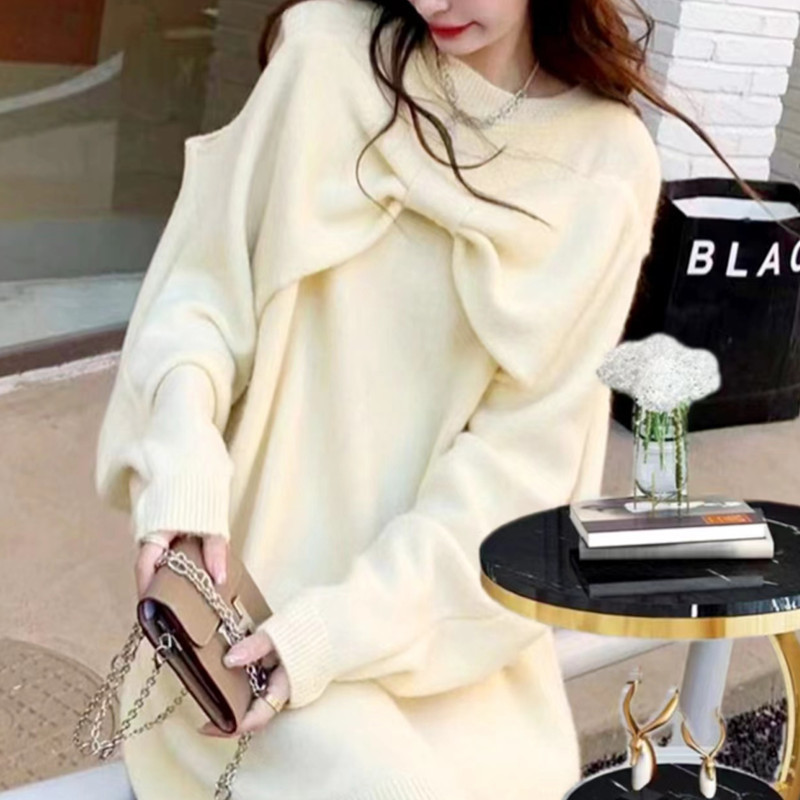 여성 한국식 섹시한 오프 숄더 활 두꺼운 스웨터 가을과 겨울 새로운 느슨한 게으른 스타일 중간 길이의 스웨터