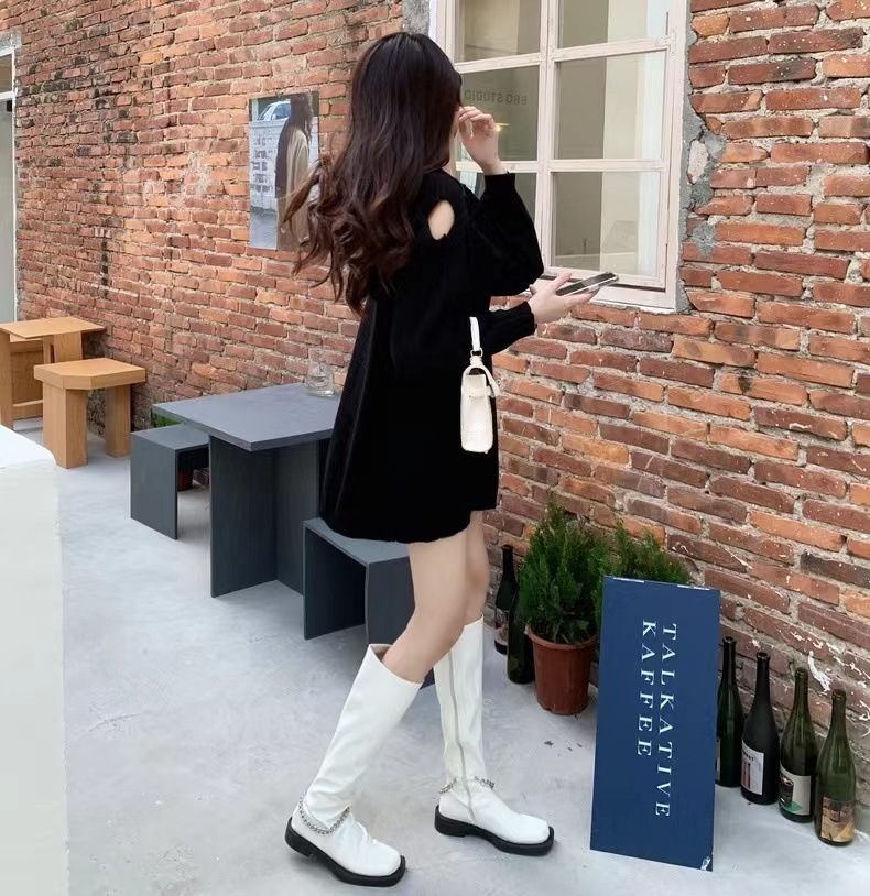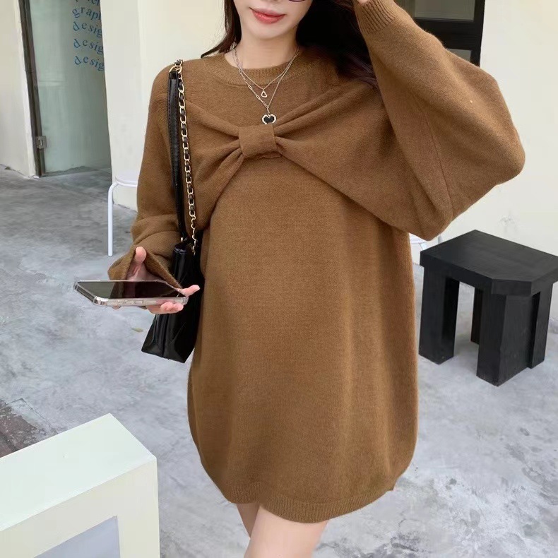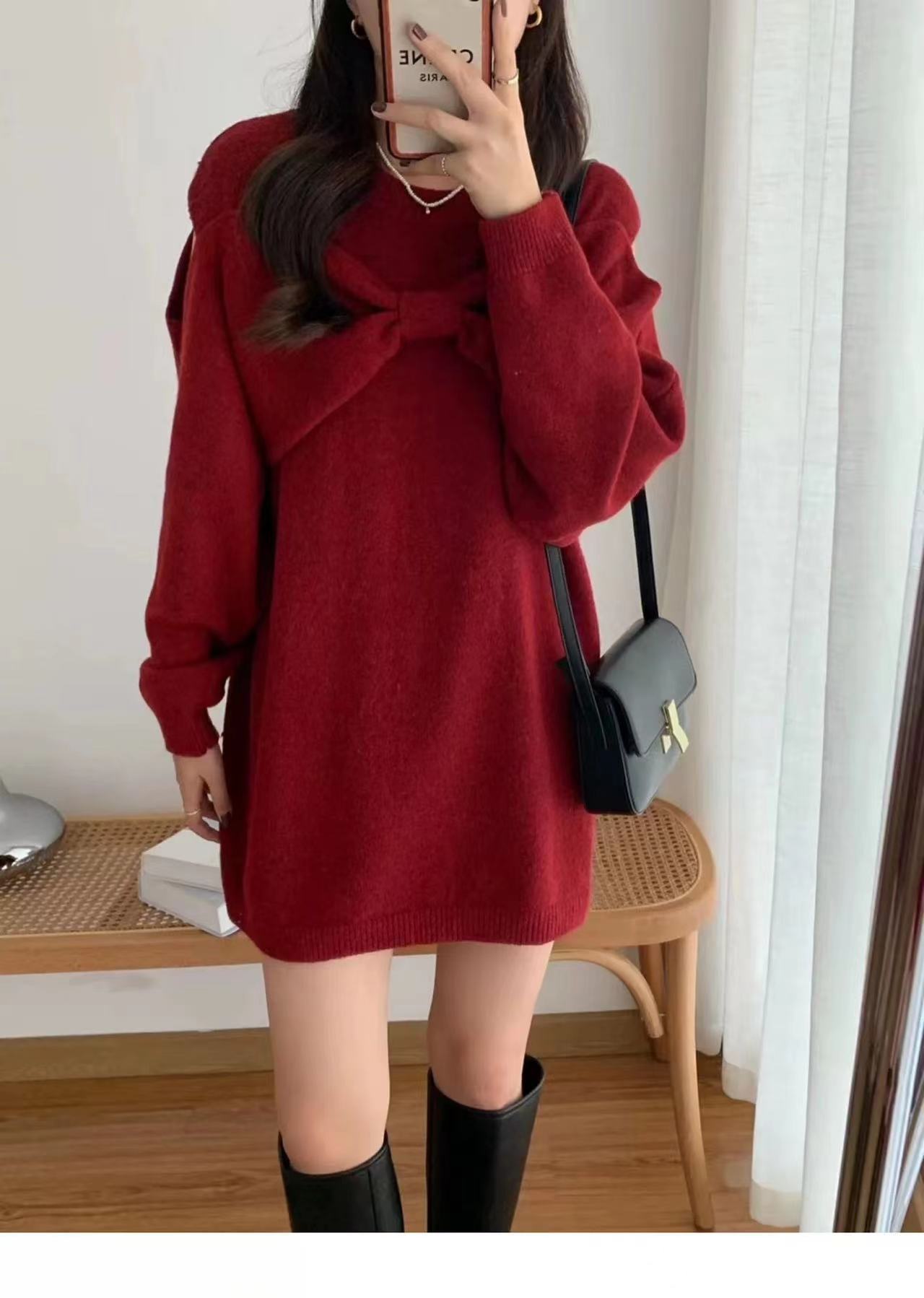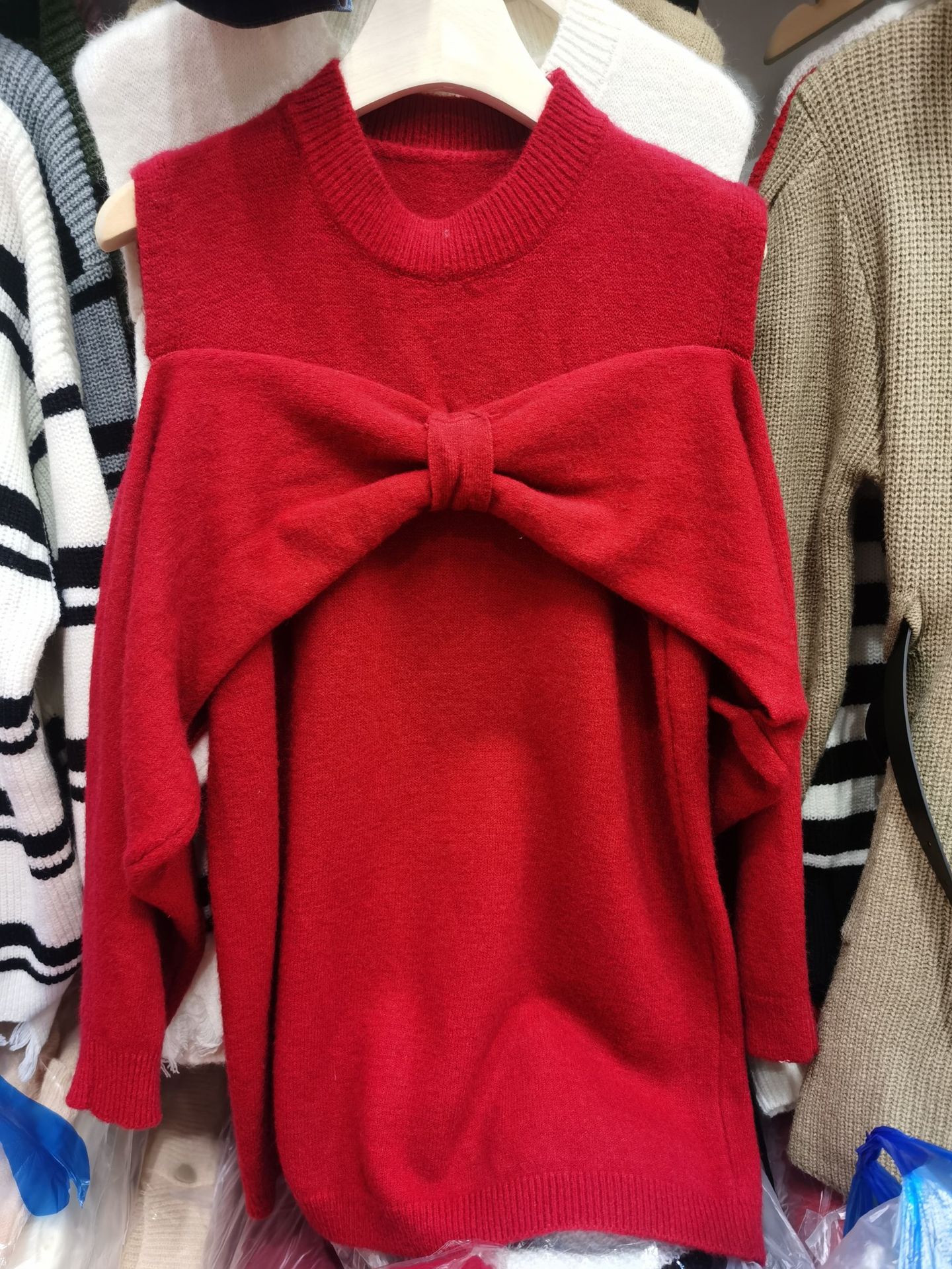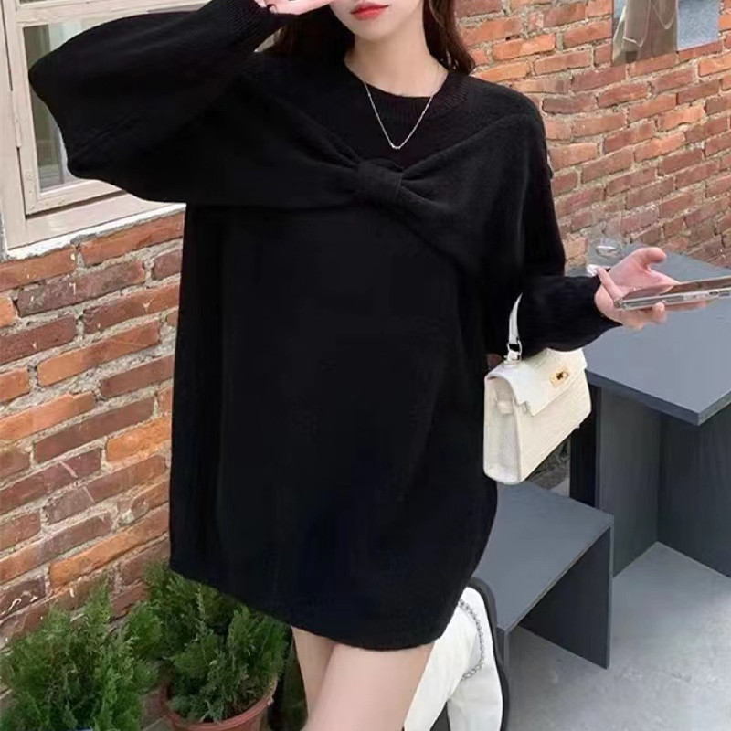 여성 한국식 섹시한 오프 숄더 활 두꺼운 스웨터 가을과 겨울 새로운 느슨한 게으른 스타일 중간 길이의 스웨터스토어 가기