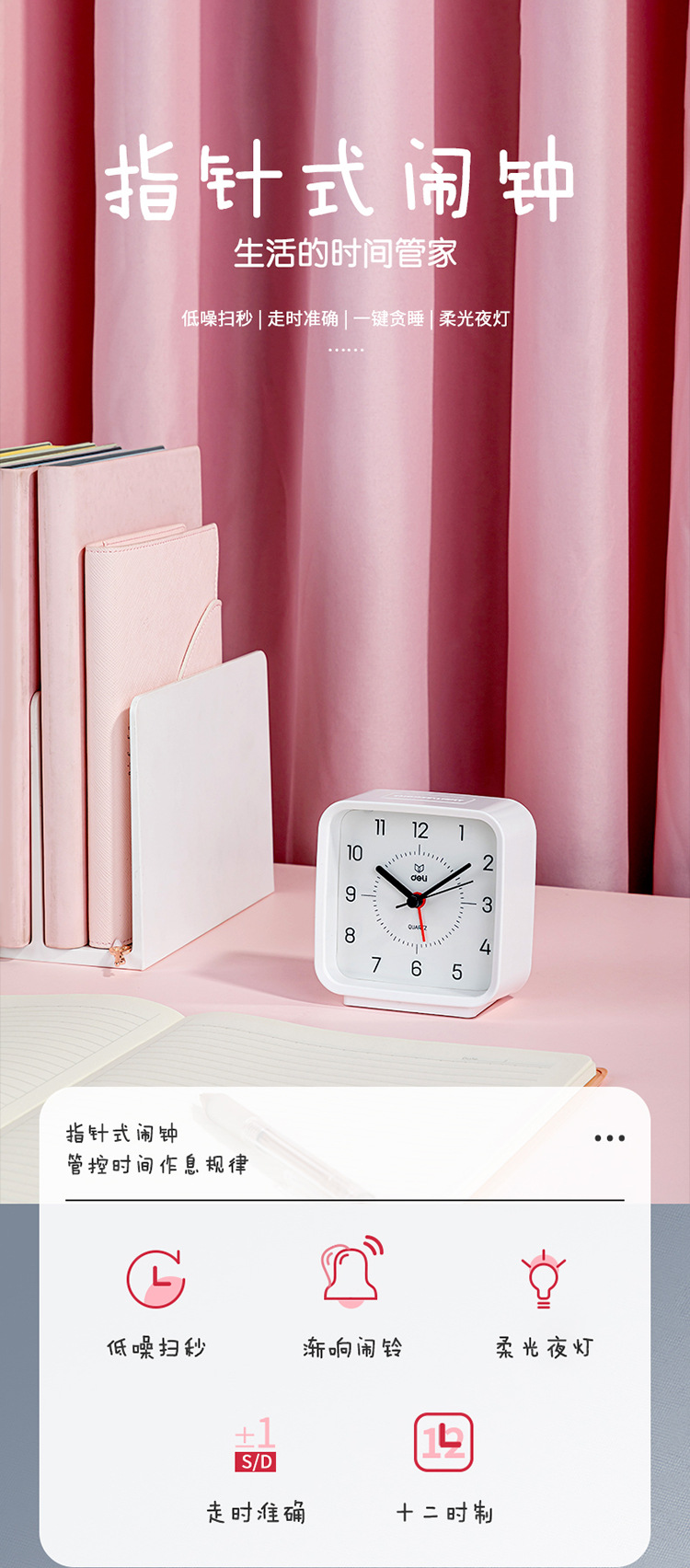 델리 8851 포인터 알람 시계 사각형 간단한 데스크탑 패션 시계 부드러운 빛 밤 빛 학생 웨이크 업 유물 도매
