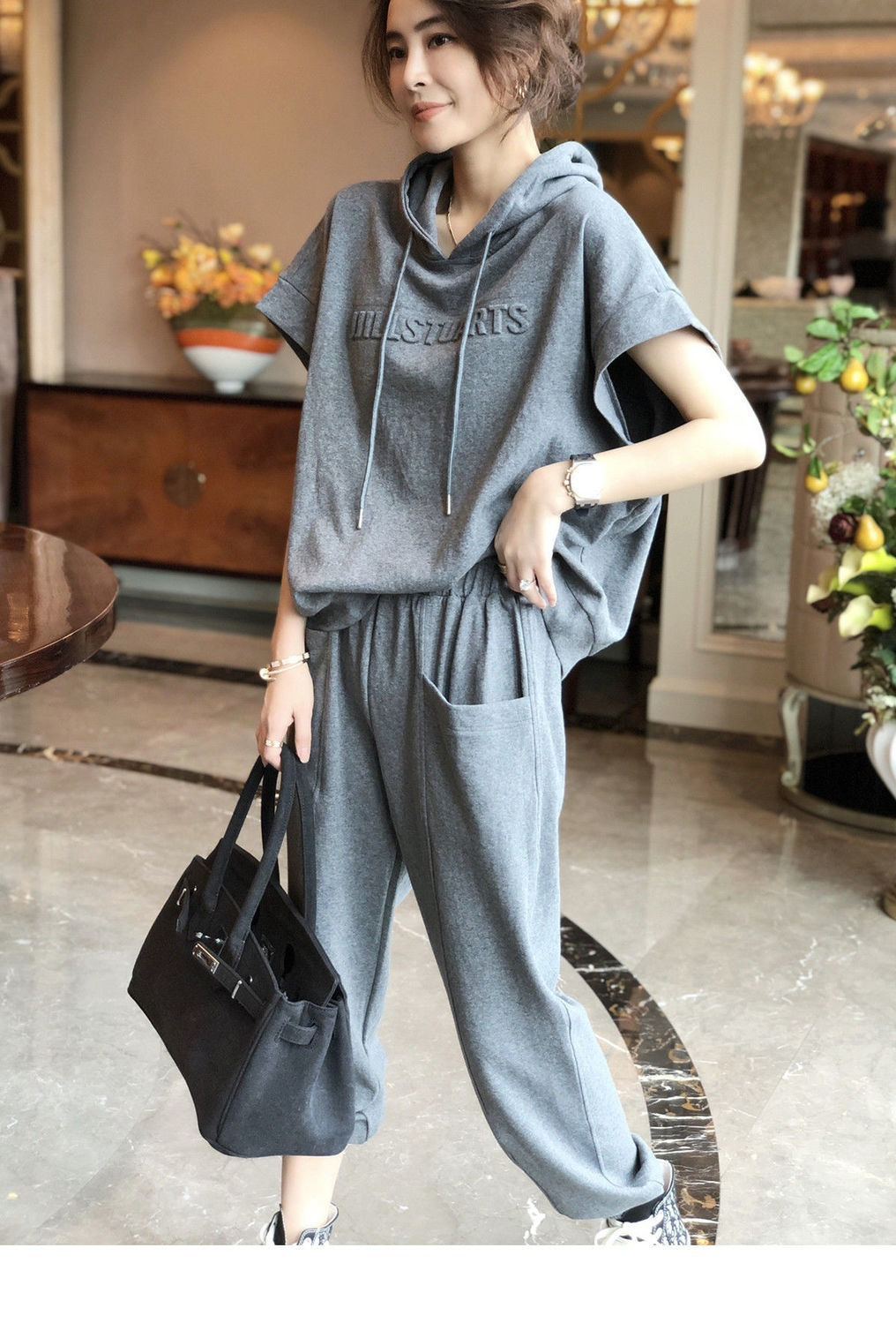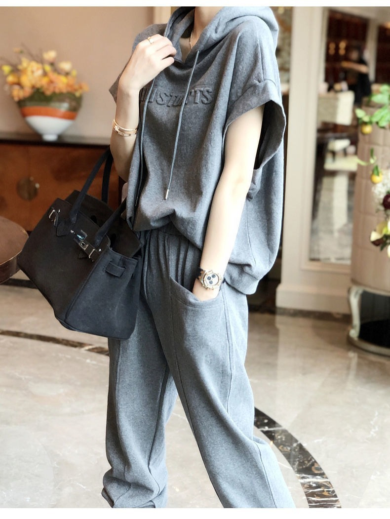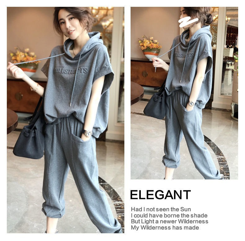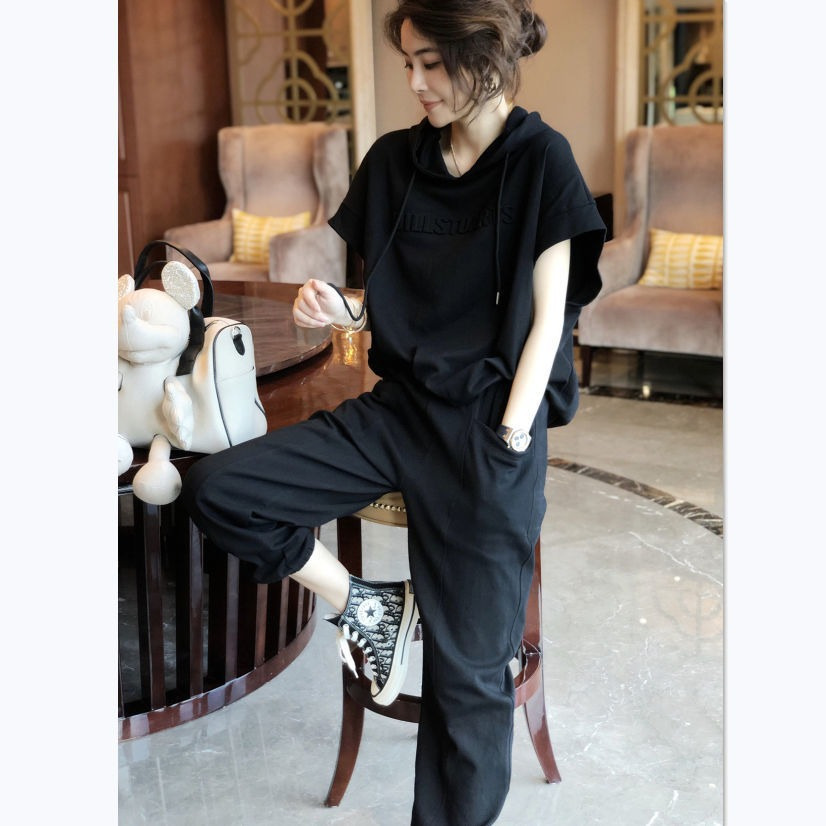 나이를 줄이는 서양식 스포츠 세트 여성 바지 패션 캐주얼 투피스 우아한 여름 티셔츠 짧은 소매 탑 후드