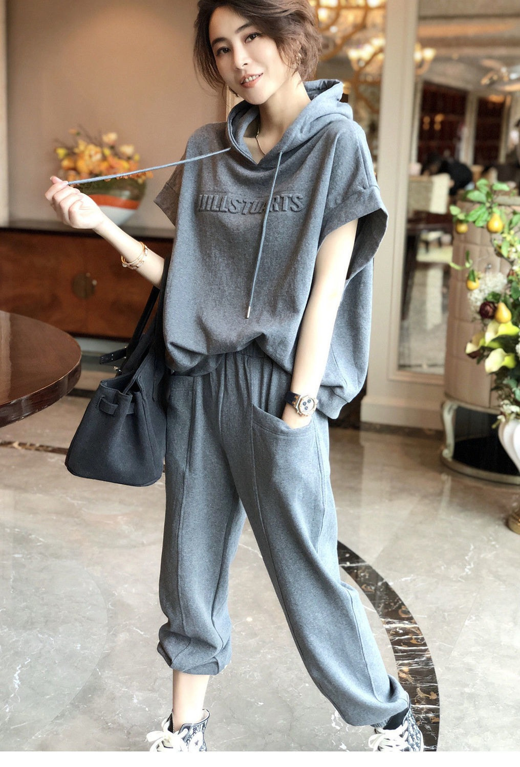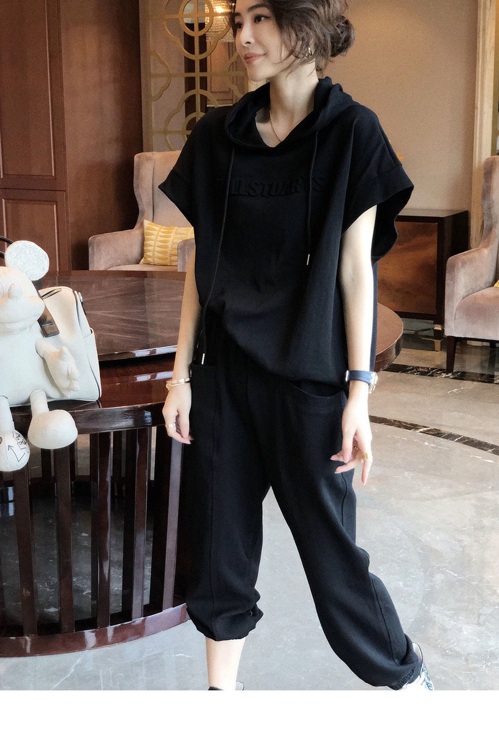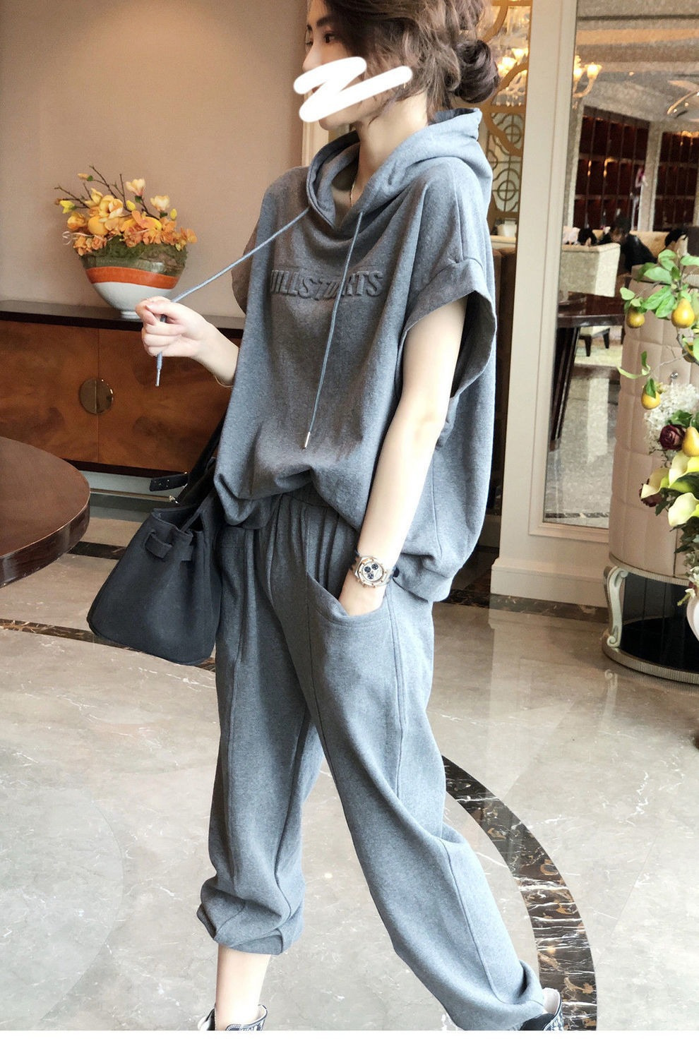 나이를 줄이는 서양식 스포츠 세트 여성 바지 패션 캐주얼 투피스 우아한 여름 티셔츠 짧은 소매 탑 후드