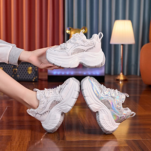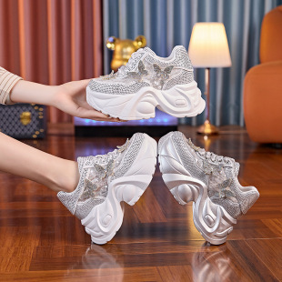 水钻老爹鞋女2024年夏季新款休闲鞋透气网纱薄款厚底内增高运动鞋