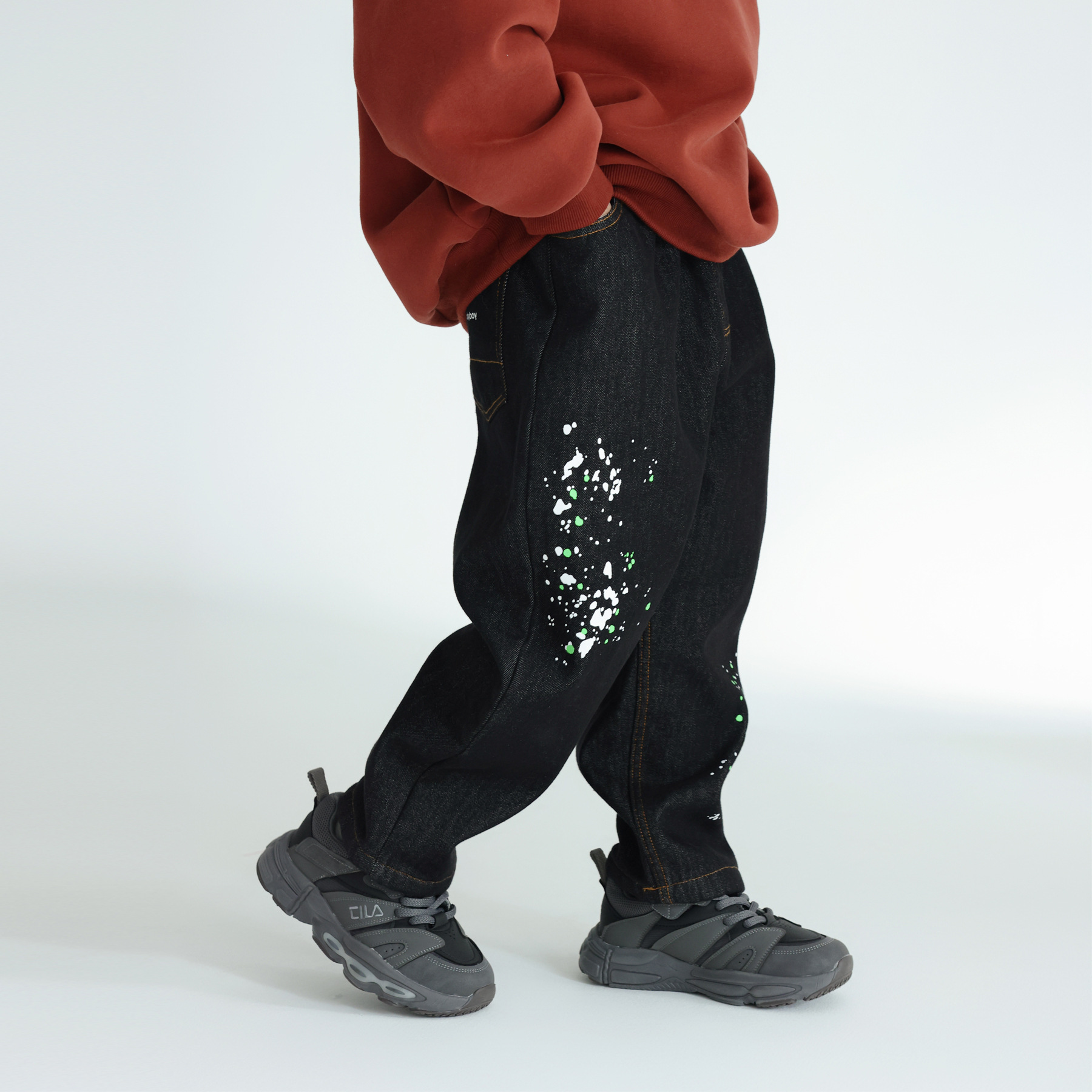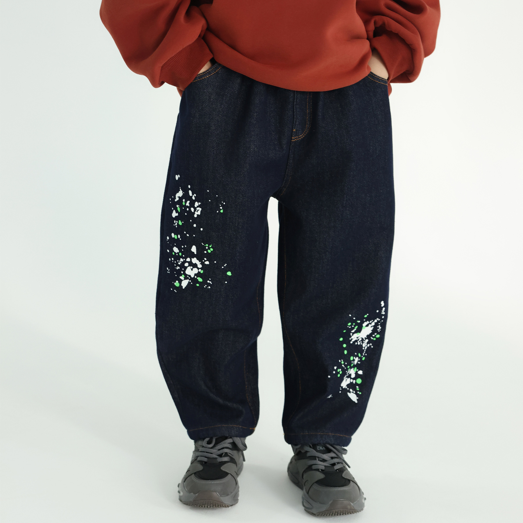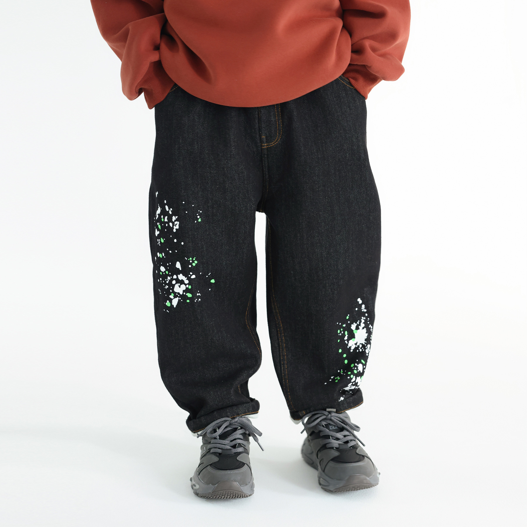2023 겨울 새 소년 패션 스플래시 잉크 원피스 벨벳 비 페이딩 청바지 미디어와 큰 아이들이 캐주얼 바지를 두껍게 만들었습니다.스토어 가기