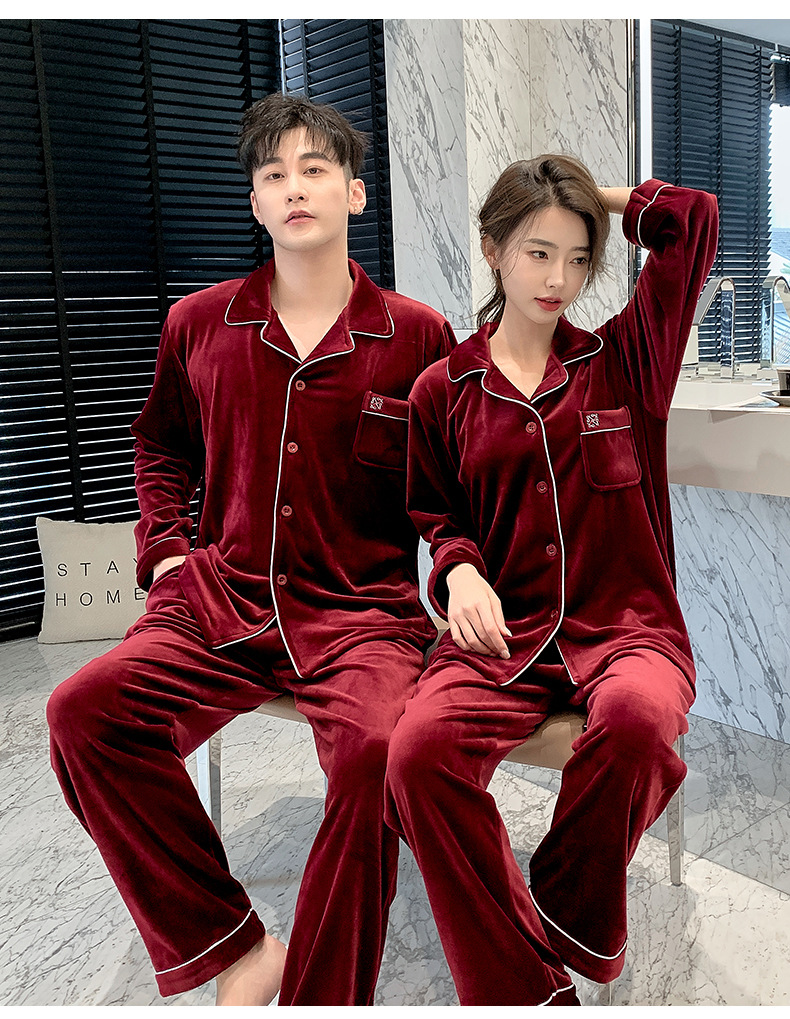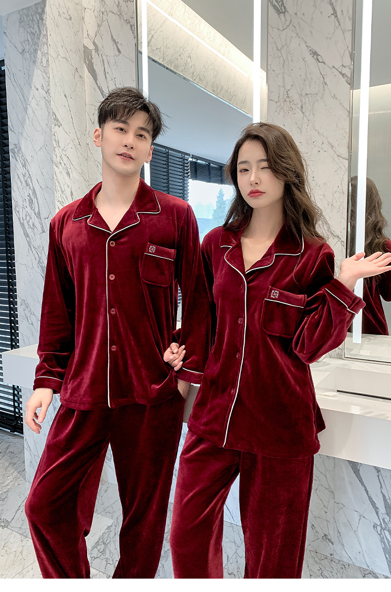 커플 Sea Island 벨벳 가을과 겨울 중간 두께의 부드러운 편안한 스트레치 레드 남성 잠옷 더블 팬츠 포켓 여성용 홈웨어