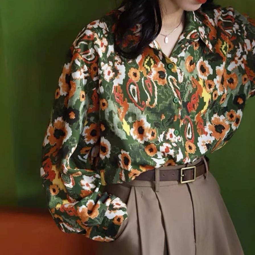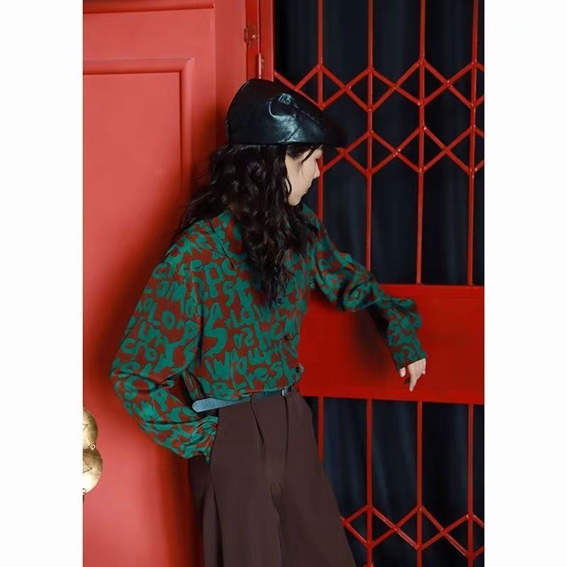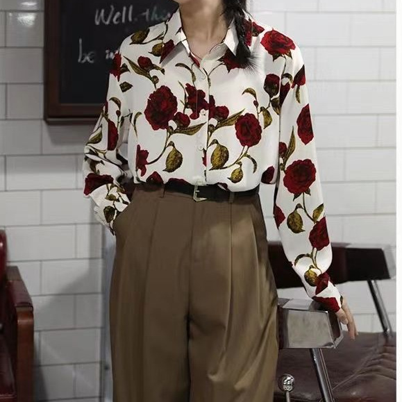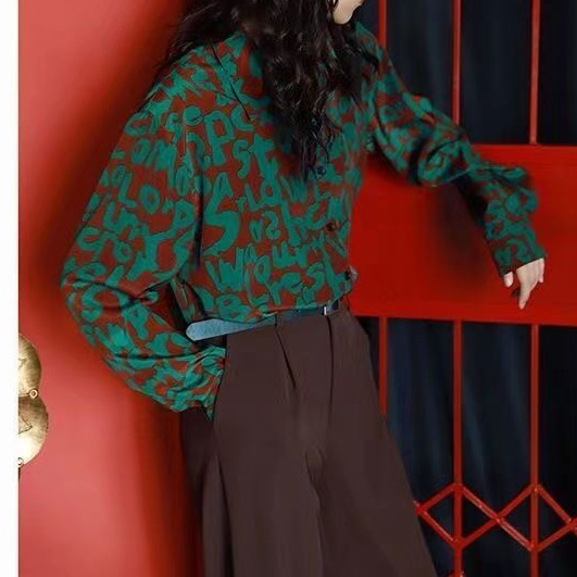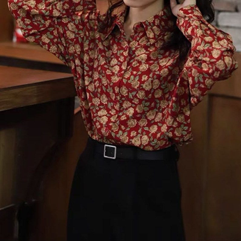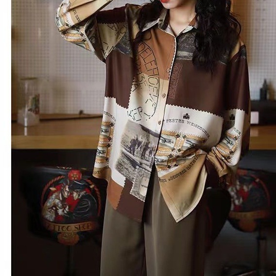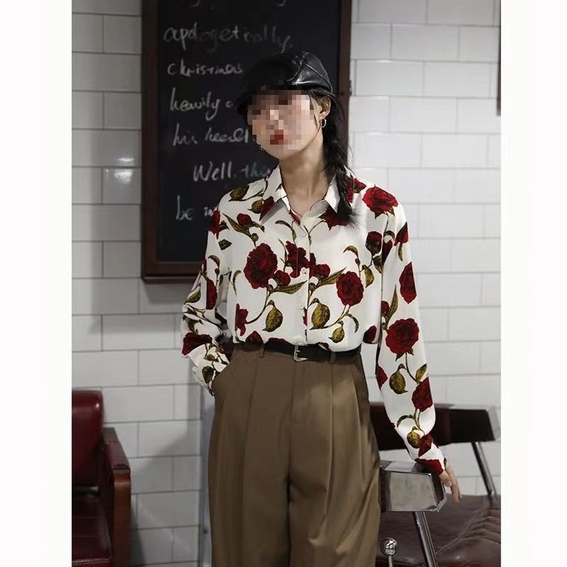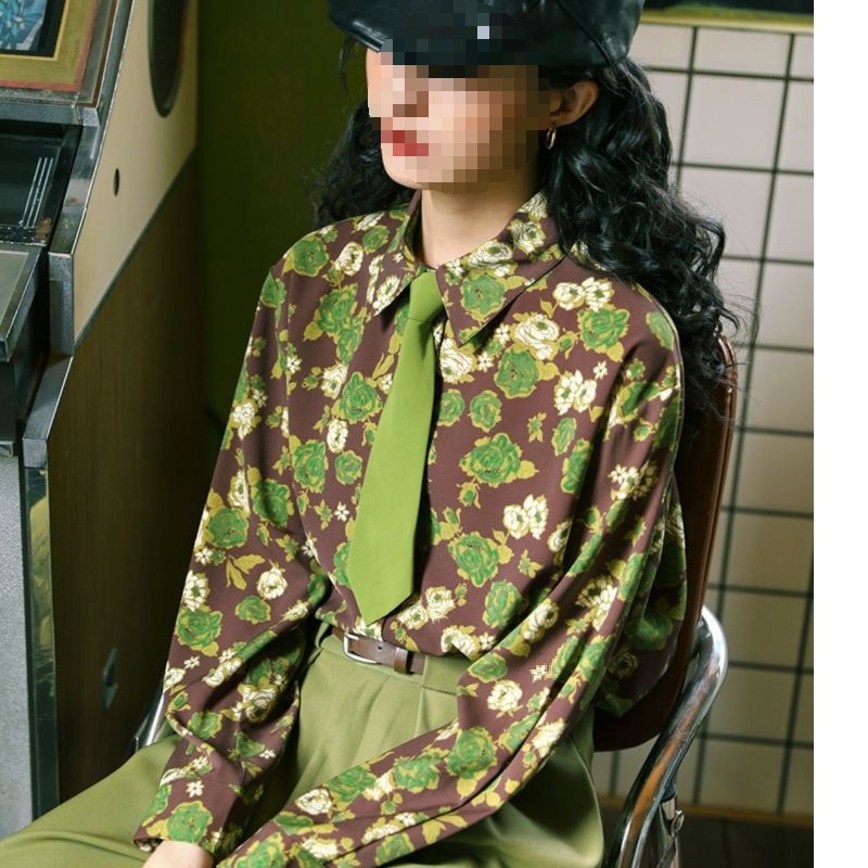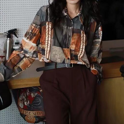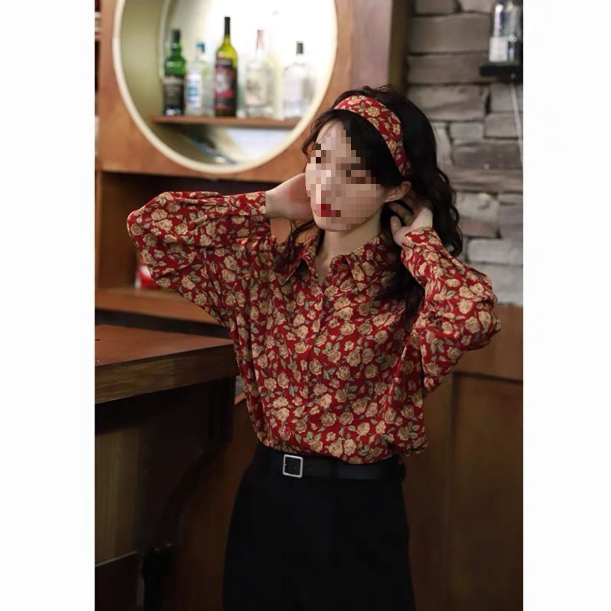 빈티지 홍콩 스타일 긴팔 인쇄 셔츠 여성용 봄 새로운 프랑스 유행 서양식 옷깃 탑 내부 착용 셔츠스토어 가기