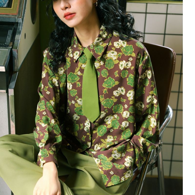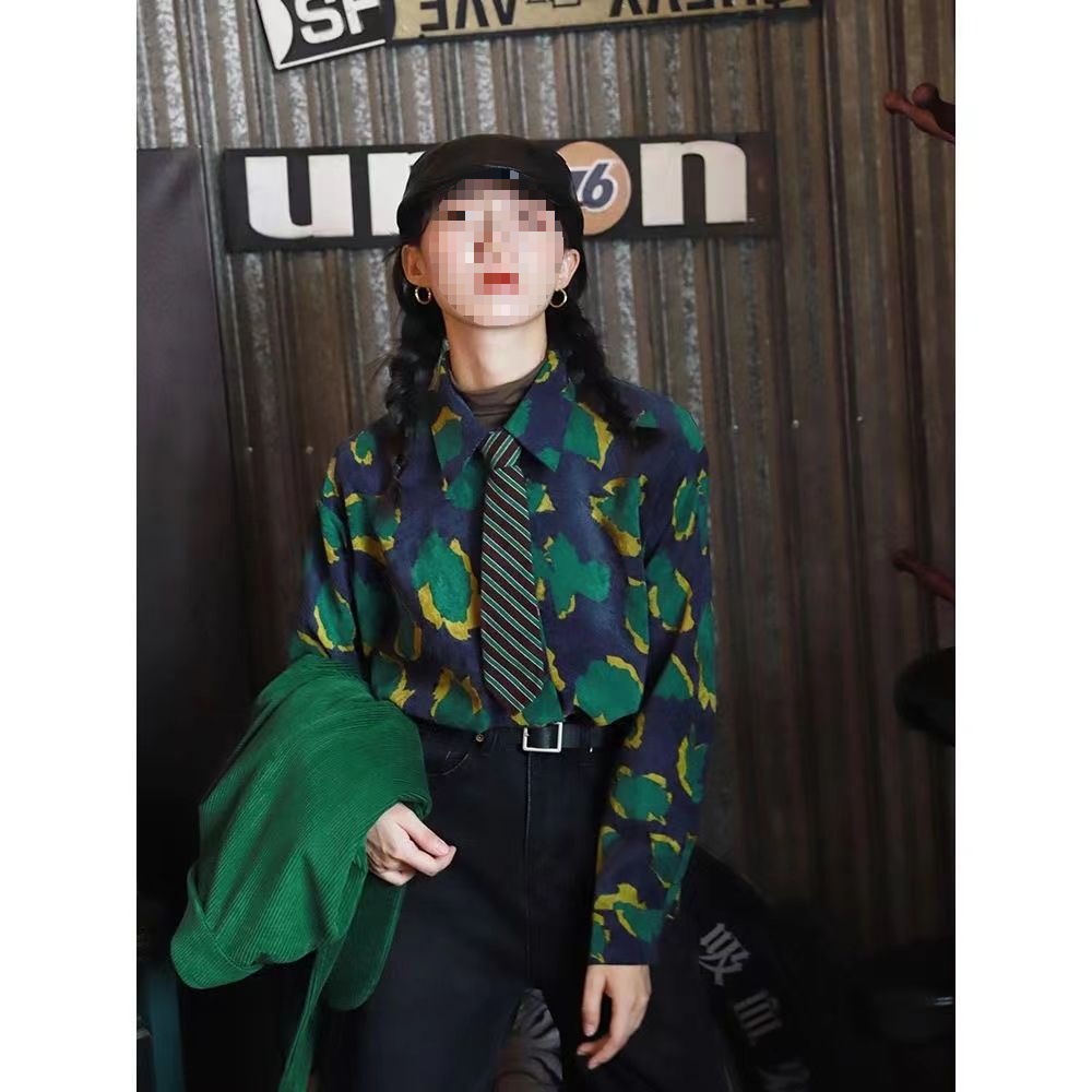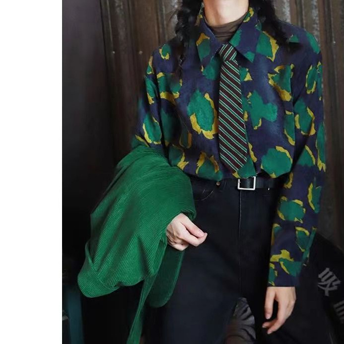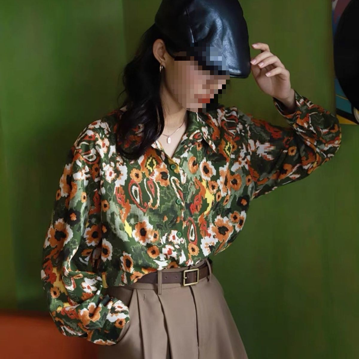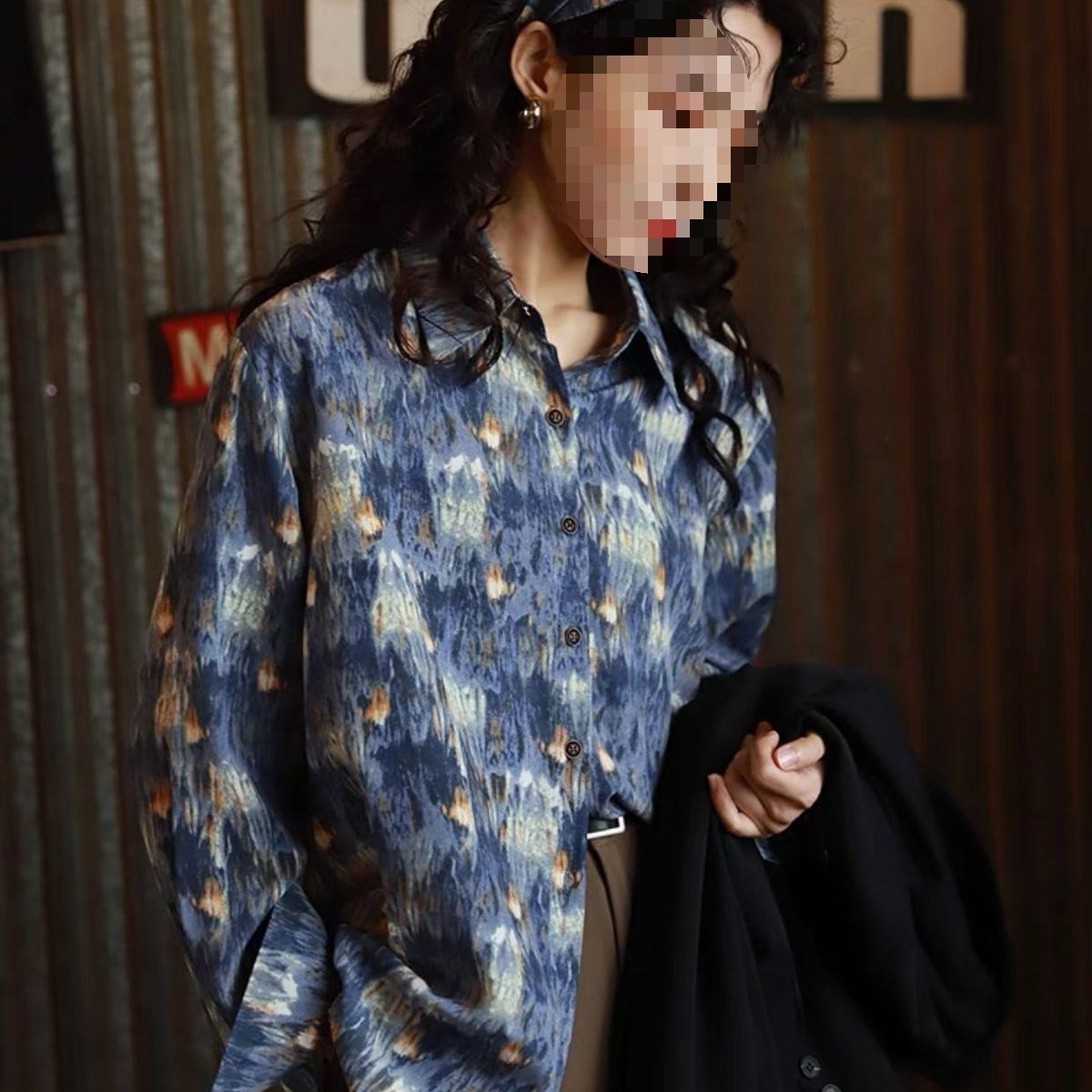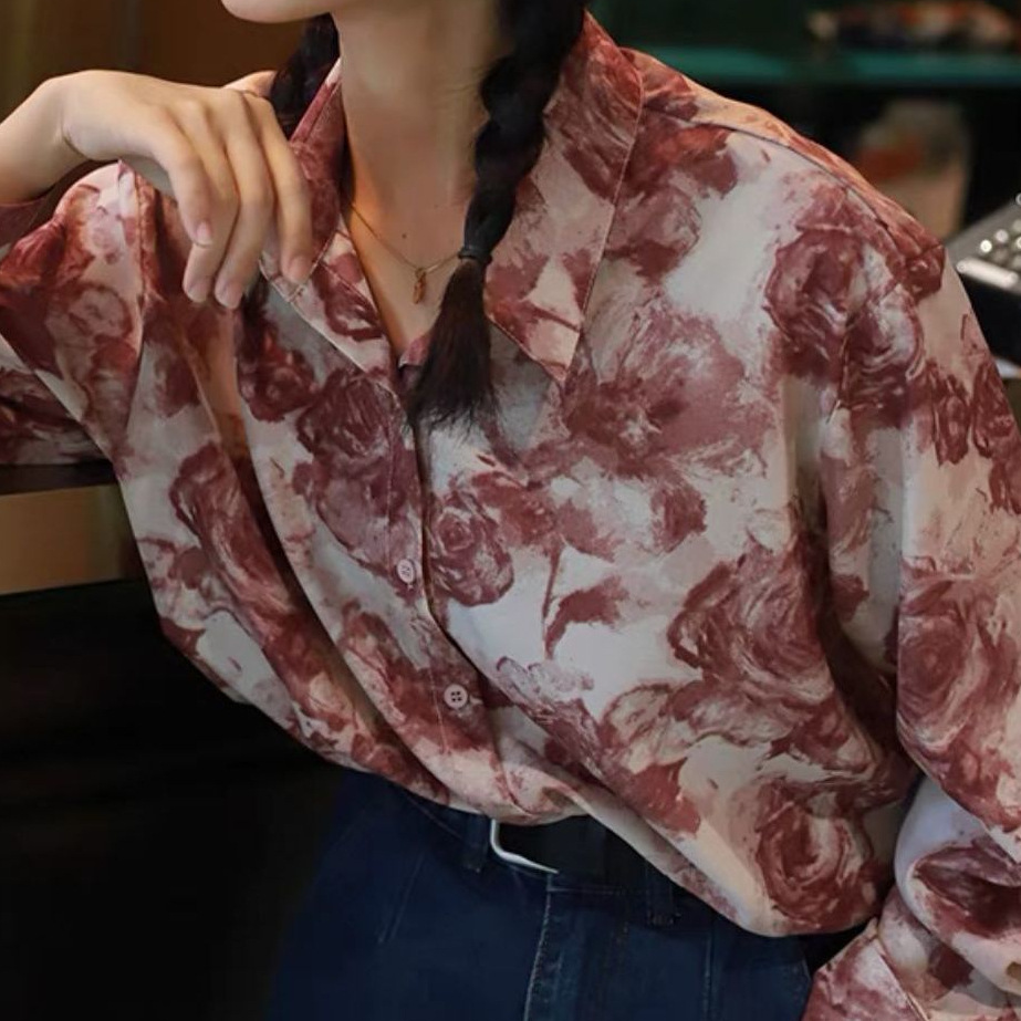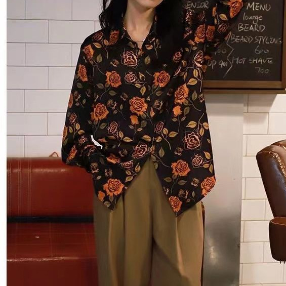 빈티지 홍콩 스타일 긴팔 인쇄 셔츠 여성용 봄 새로운 프랑스 유행 서양식 옷깃 탑 내부 착용 셔츠스토어 가기