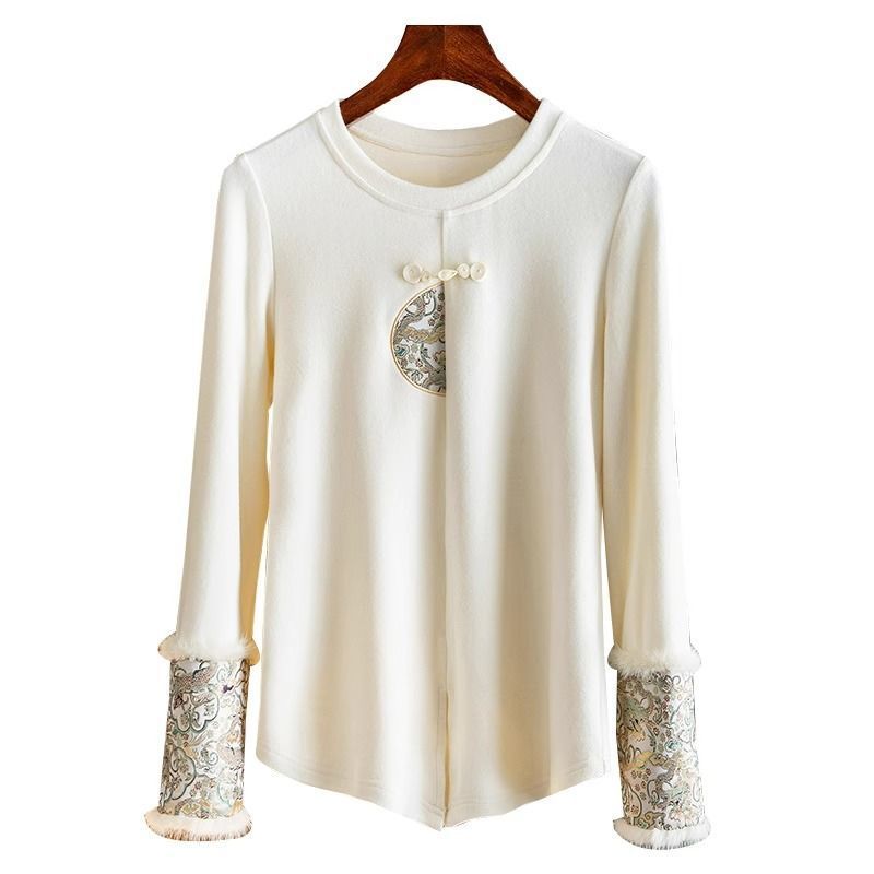 가벼운 Guofeng 하이 엔드 내베이스 셔츠 여자 2023 가을 및 겨울 새로운 중국 라운드 넥 버클 자카드