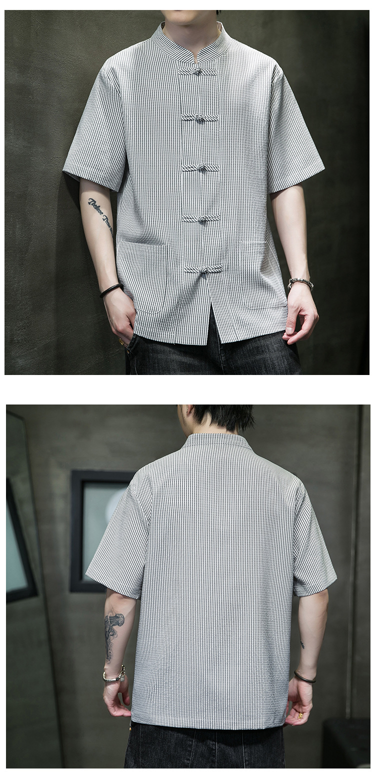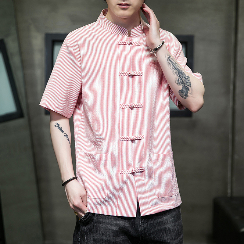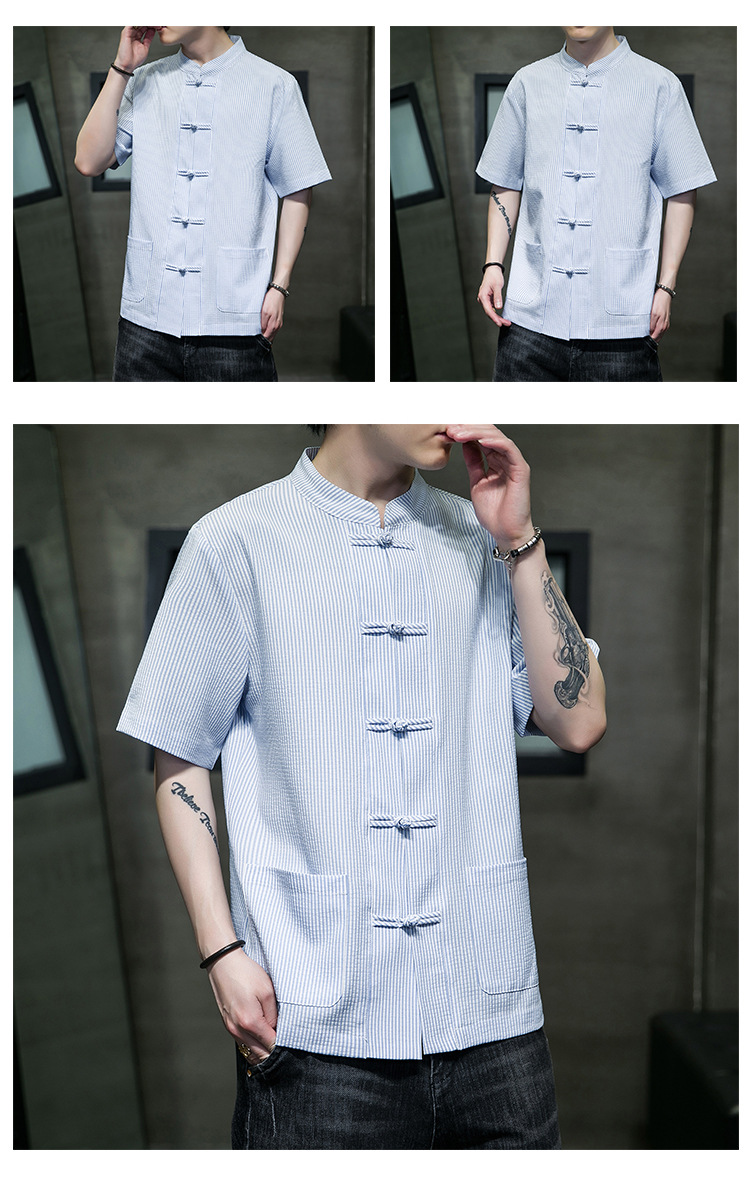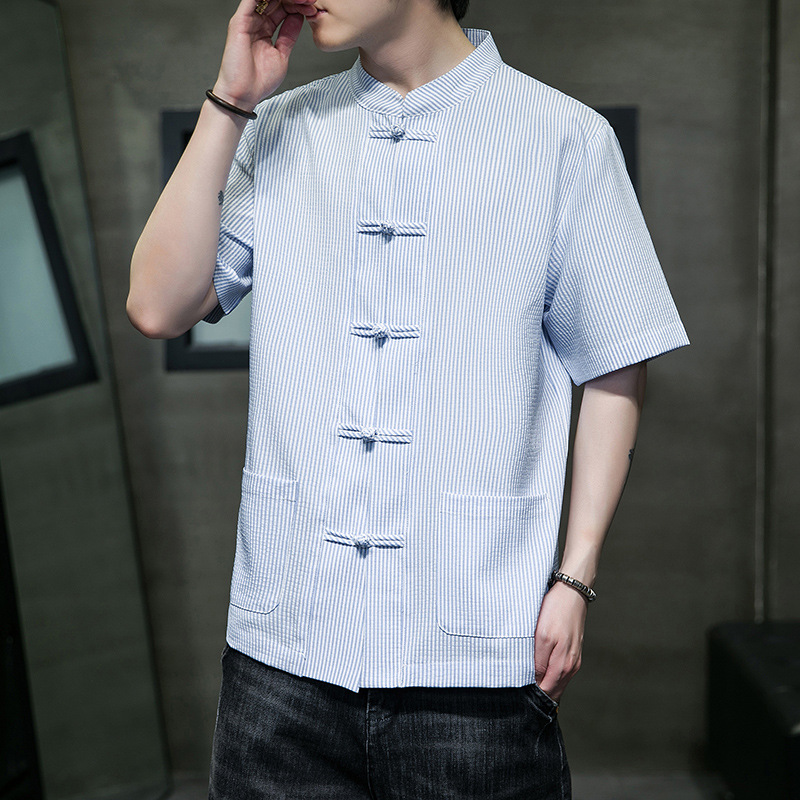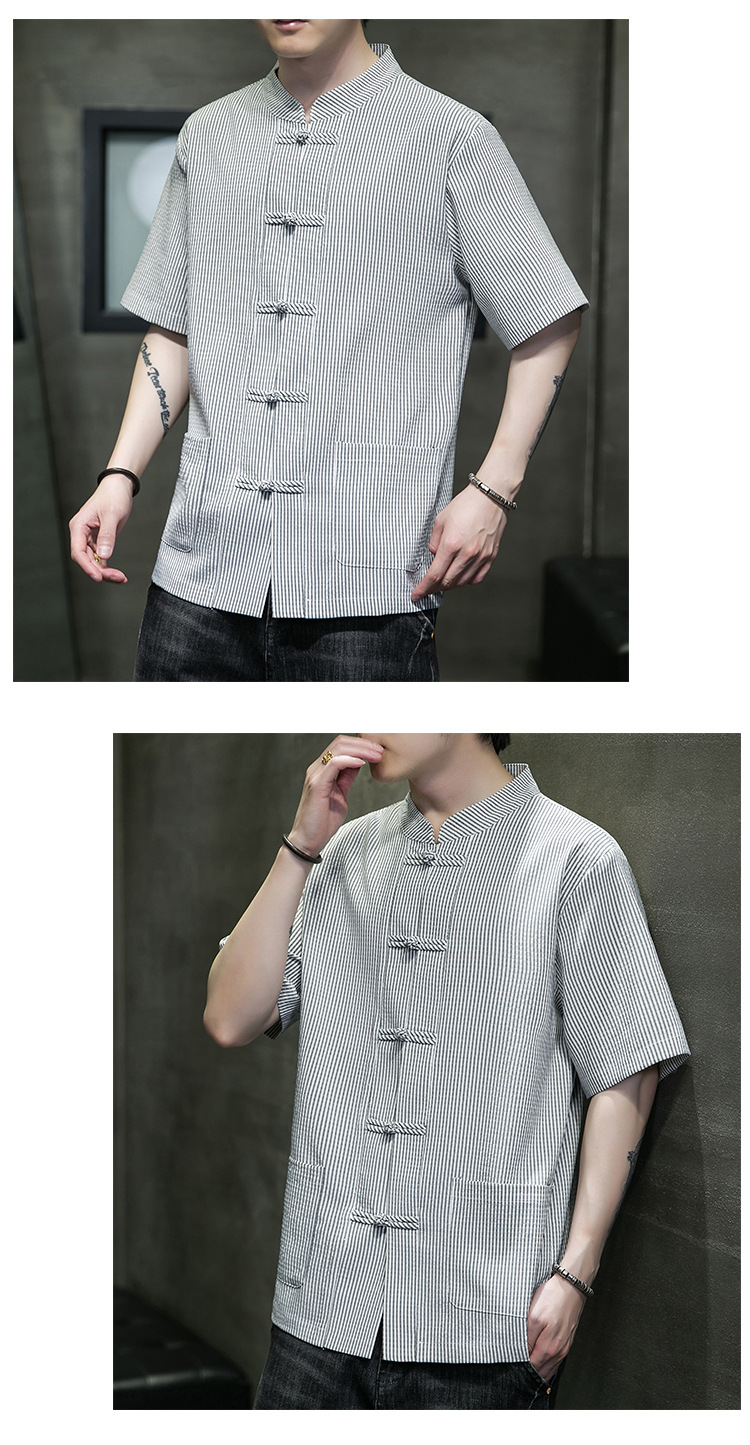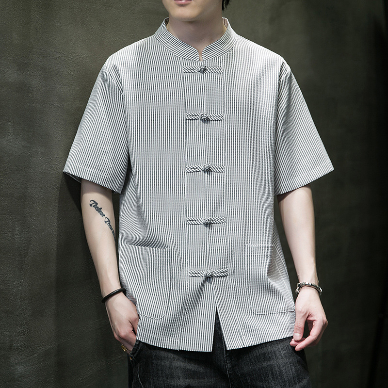 봄과 여름 새로운 중국 스타일 코튼 및 리넨 수직 스트라이프 버클 중국 탕 원피스 수직 칼라 남성 트렌디 한 짧은 소매 셔츠
