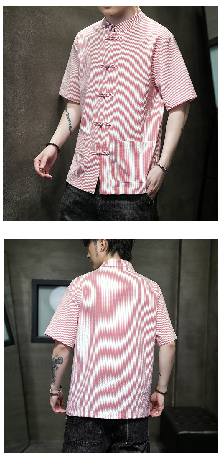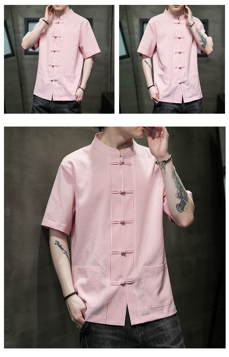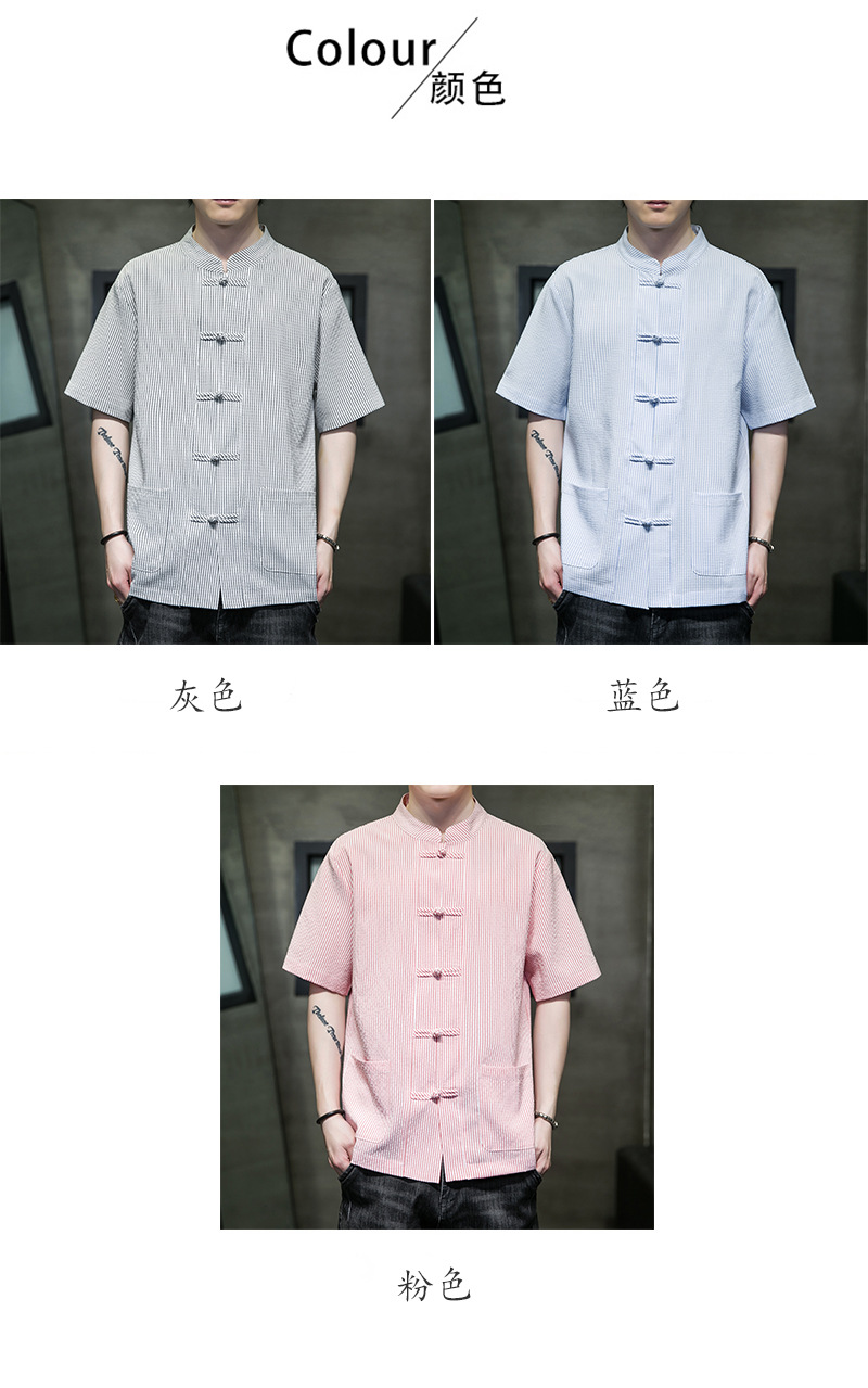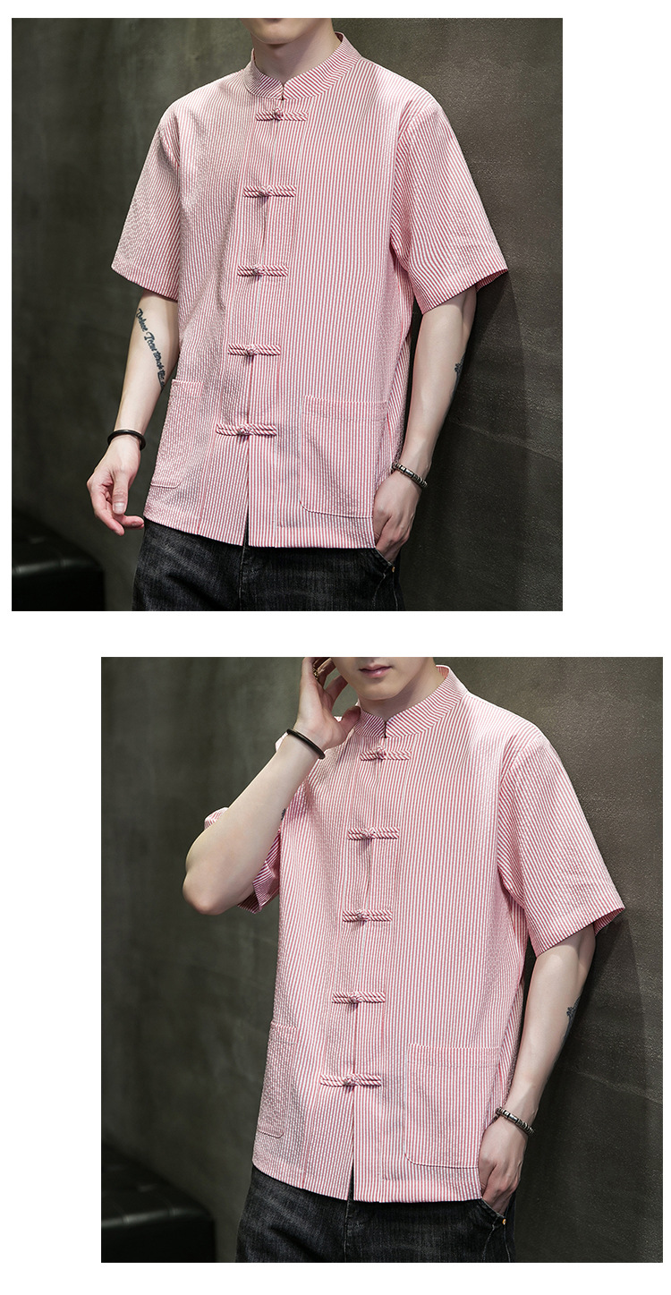 봄과 여름 새로운 중국 스타일 코튼 및 리넨 수직 스트라이프 버클 중국 탕 원피스 수직 칼라 남성 트렌디 한 짧은 소매 셔츠