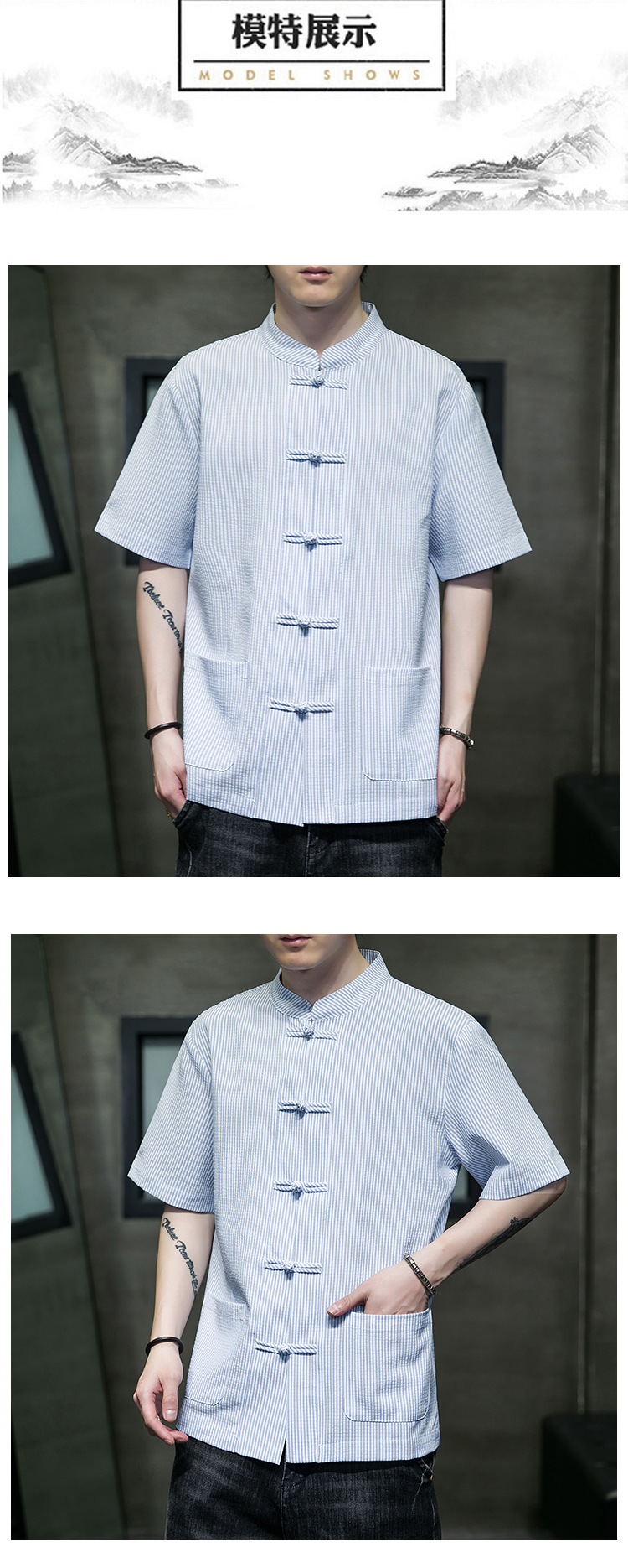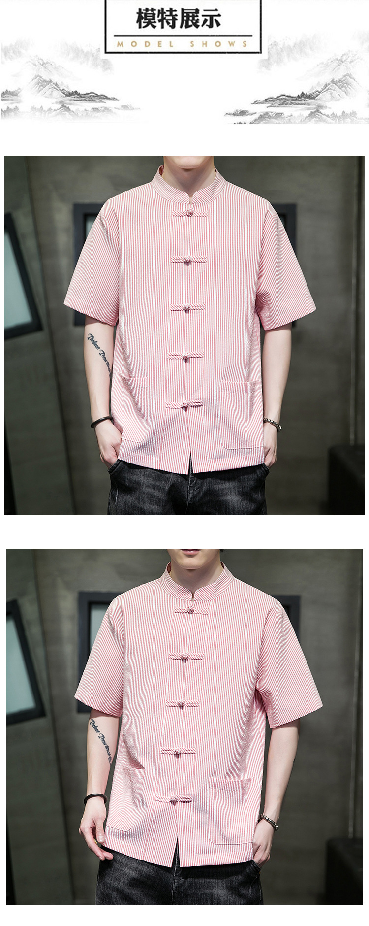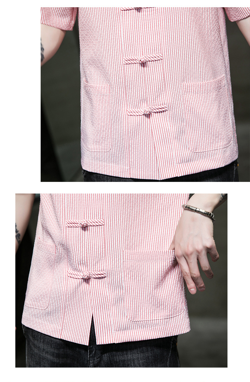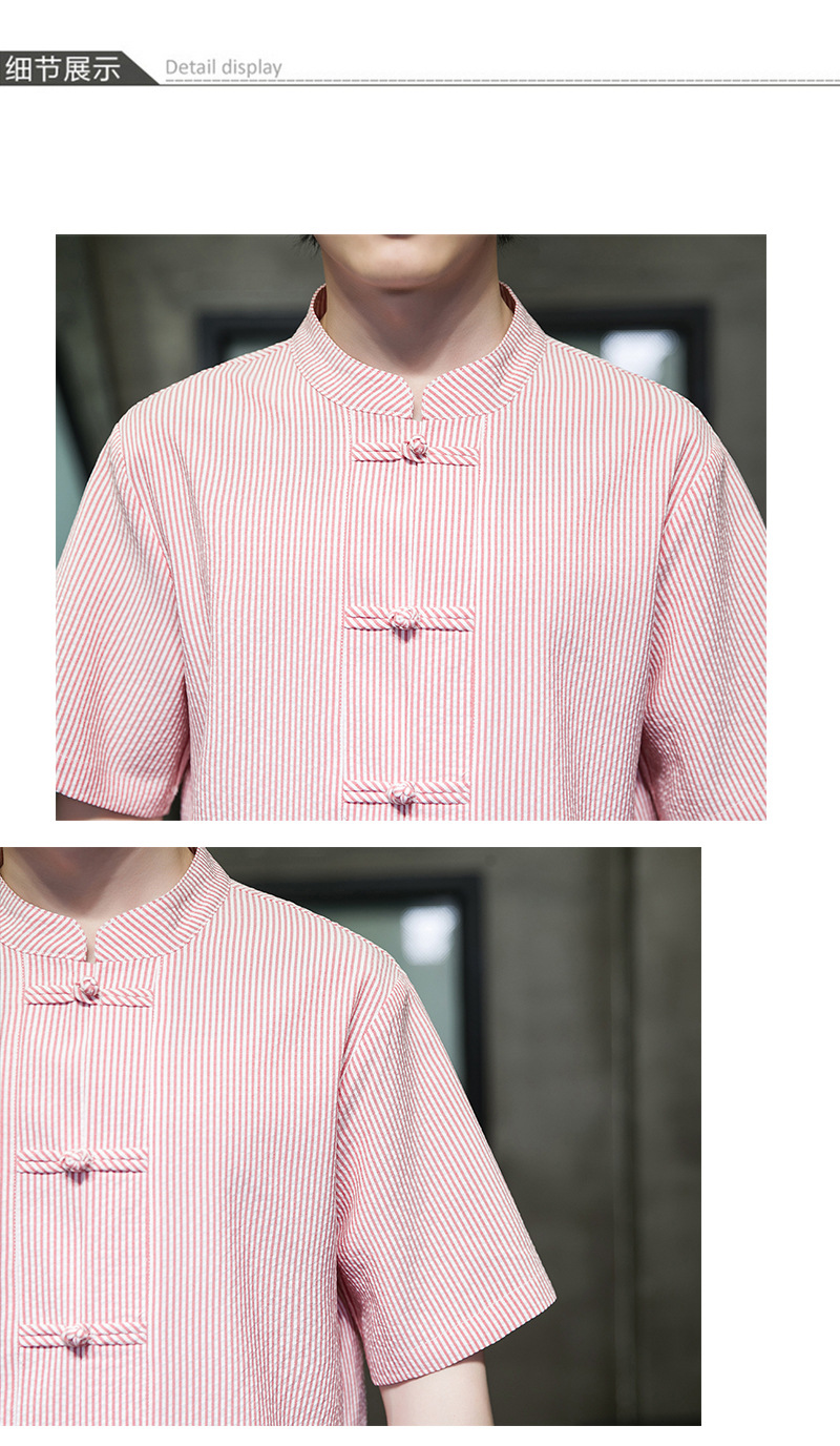 봄과 여름 새로운 중국 스타일 코튼 및 리넨 수직 스트라이프 버클 중국 탕 원피스 수직 칼라 남성 트렌디 한 짧은 소매 셔츠