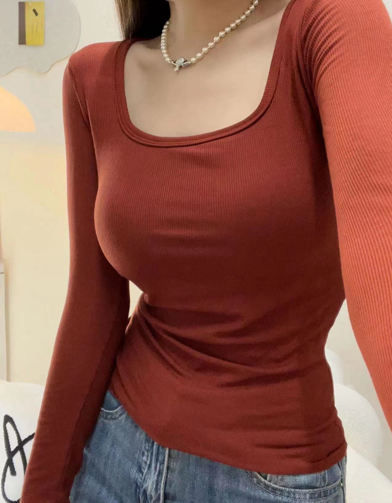 여성용 베이스 레이어 2025 가을 겨울 신작 기모 U 넥 긴팔 티셔츠 슬림핏 내부 스퀘어 넥 가슴 패드가있는 따뜻한 탑