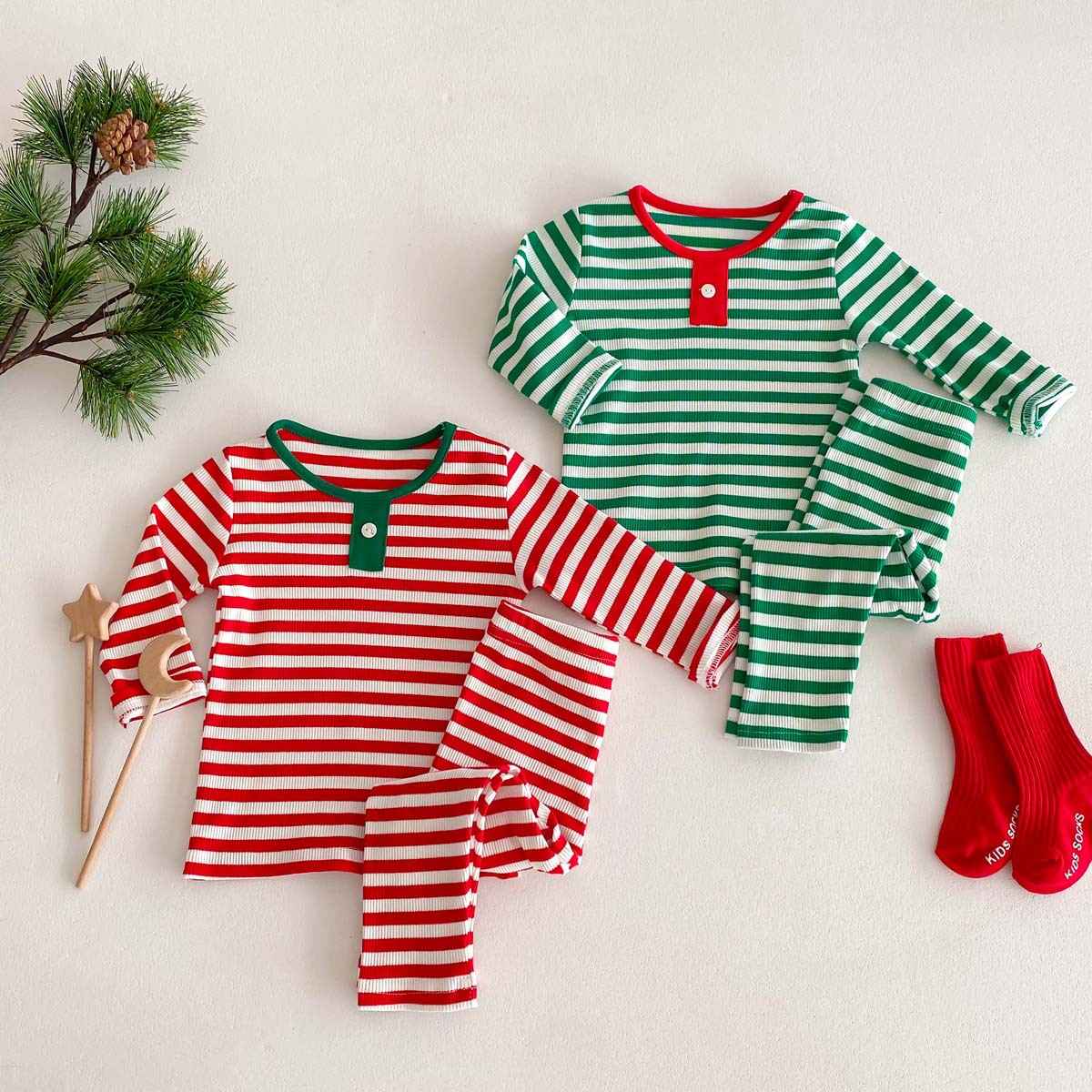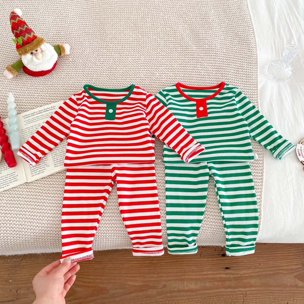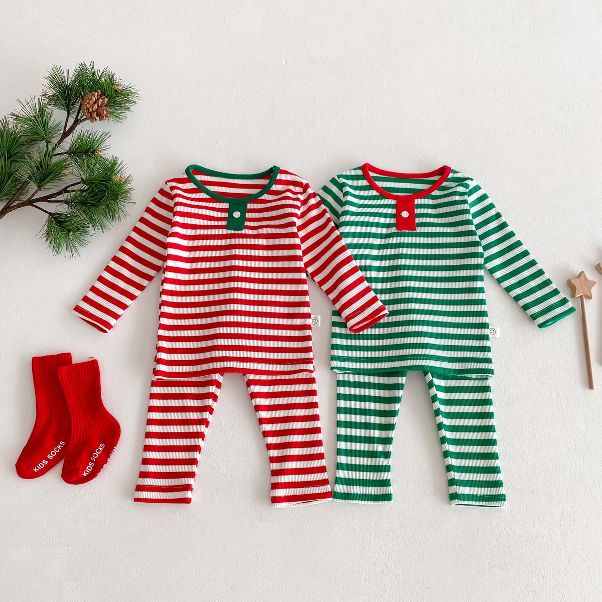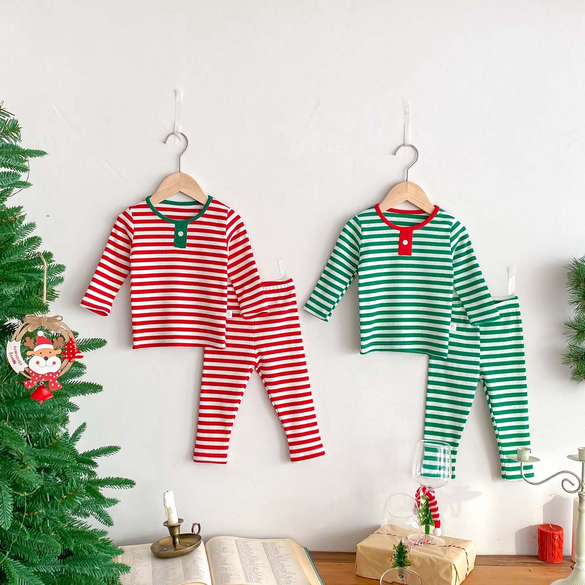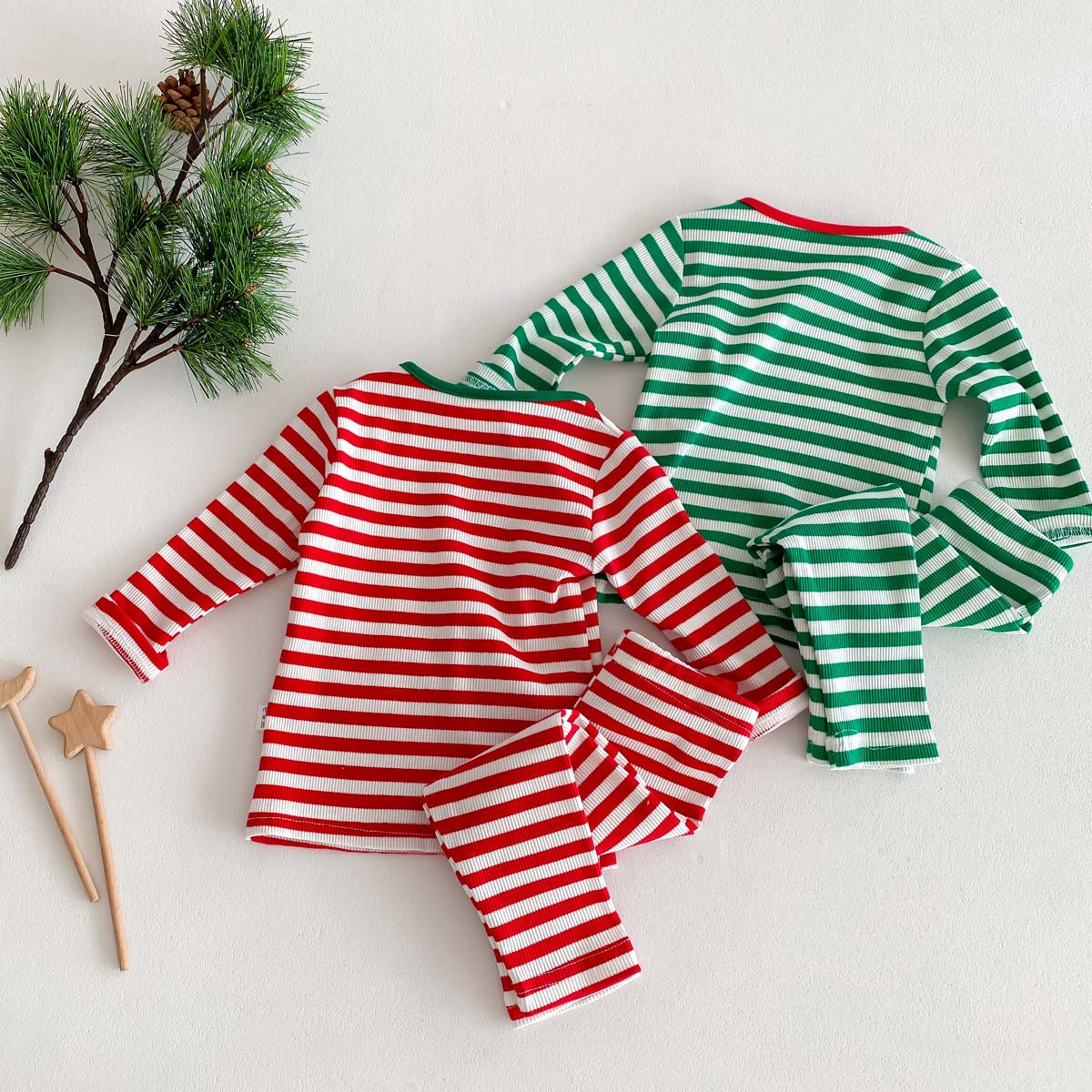 어린이 가을과 겨울 줄무늬 둥근 목 홈 웨어 세트 유아 크리스마스 옷 긴 소매 바지 바닥 투피스 세트스토어 가기