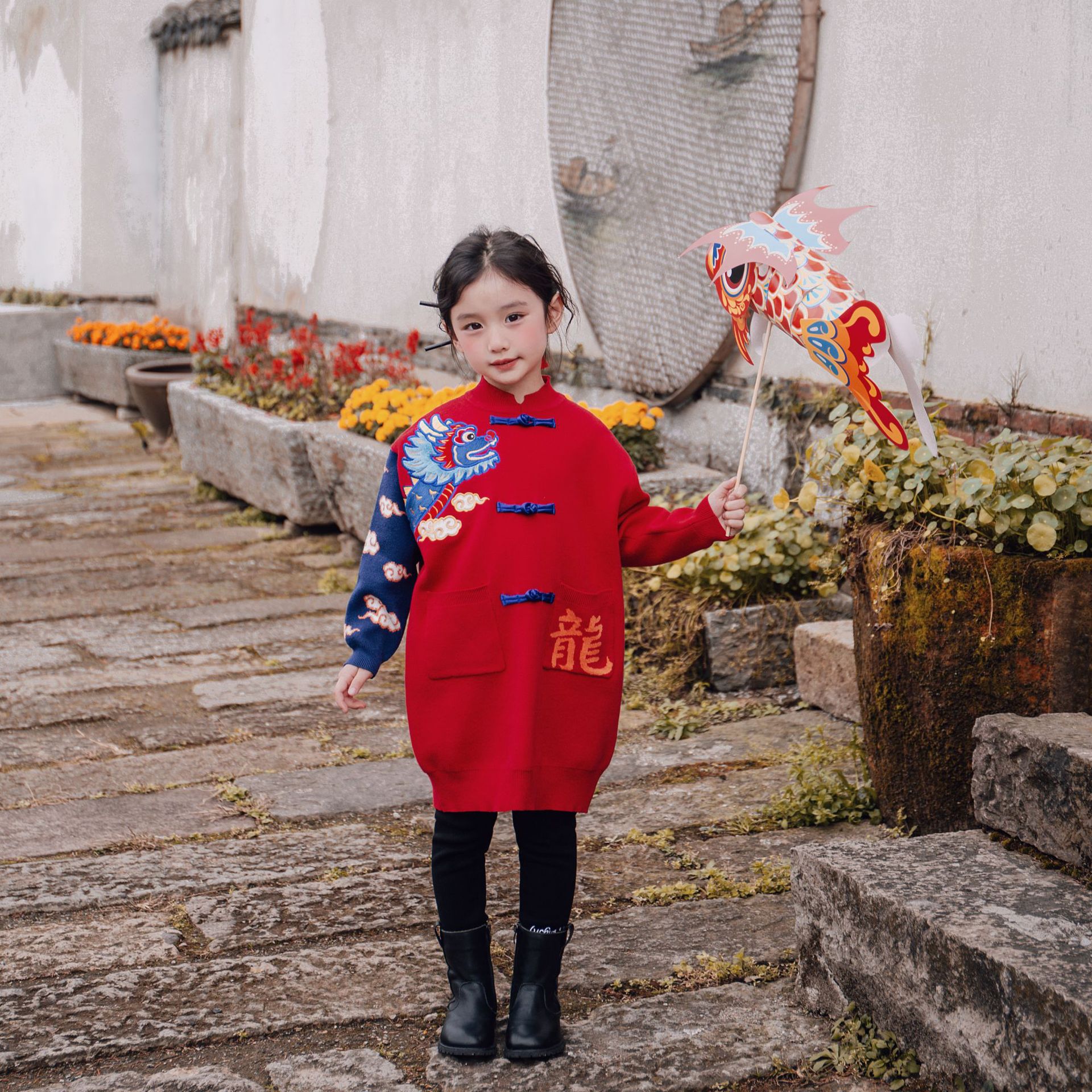 [특가 재고] 겨울 레트로 설날 의상 여자 어린이 중국풍 축제 니트 스웨터 치파오 드레스