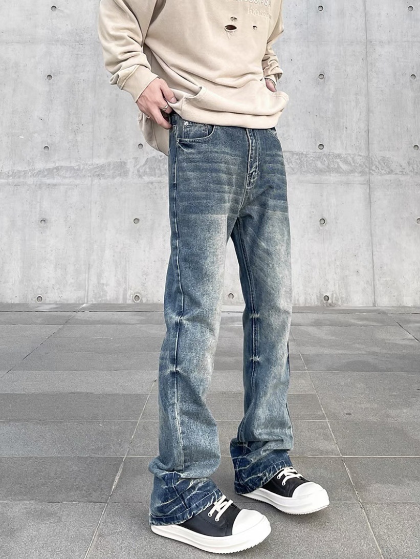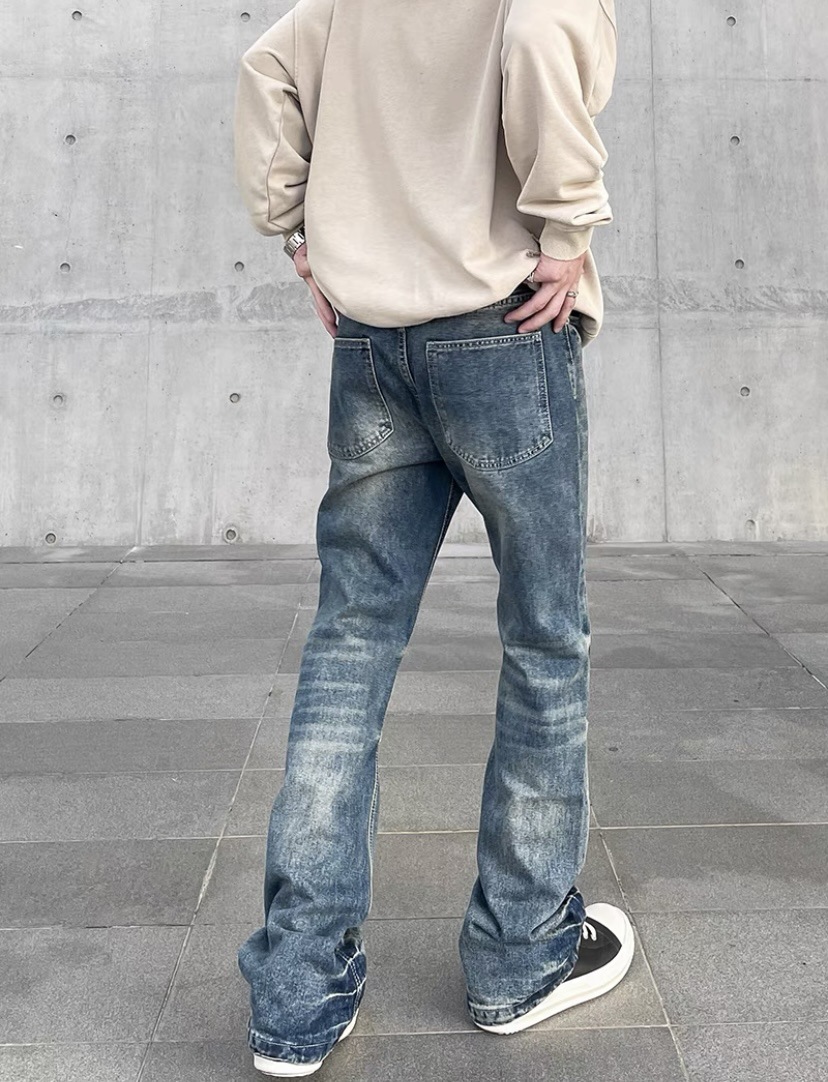 미국 레트로 워싱 데님 청바지 남성용 약간의 플레어 하이 스트리트 스타일 슬림핏 팬츠 트렌디스토어 가기