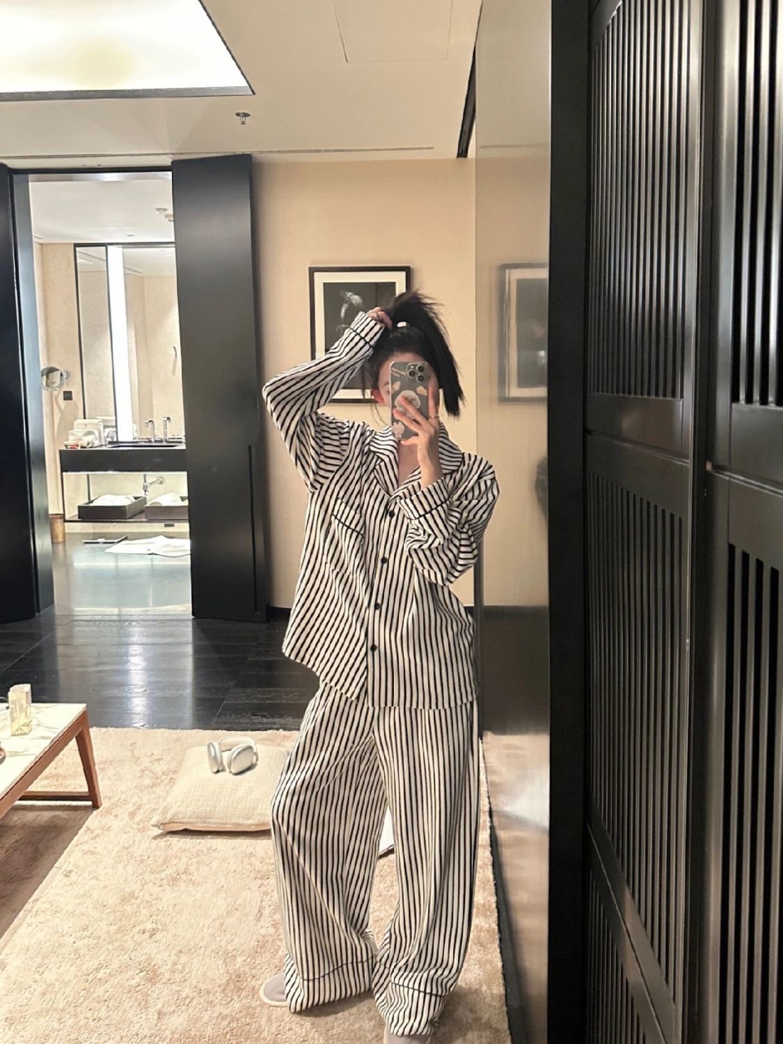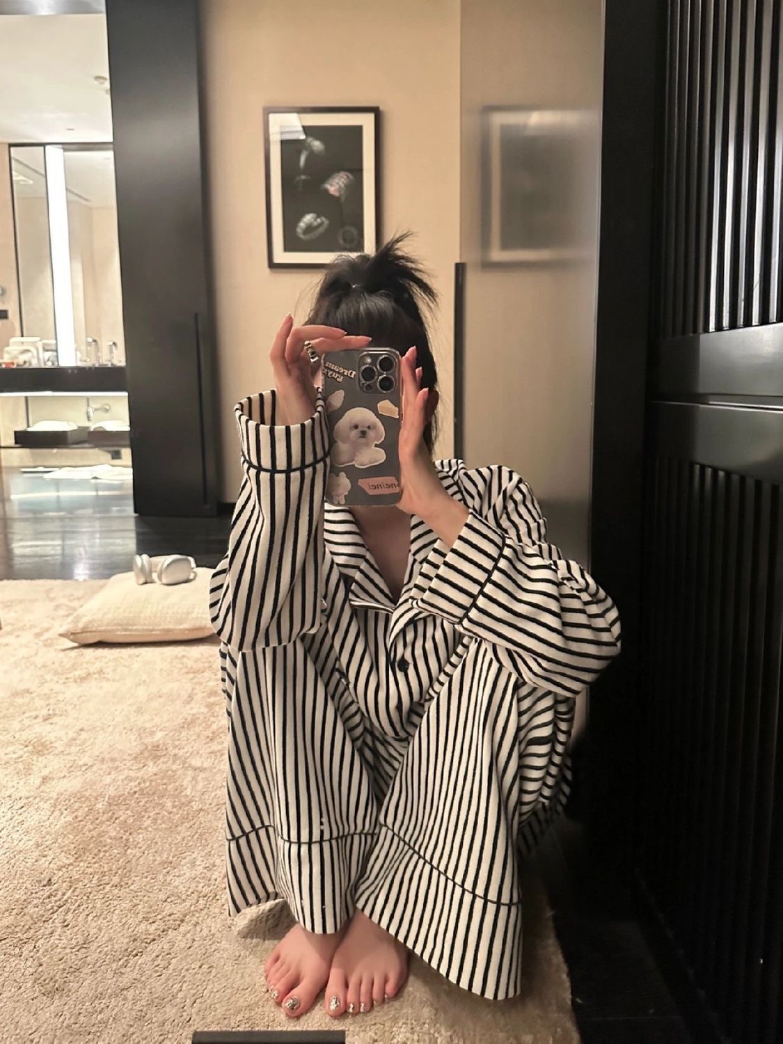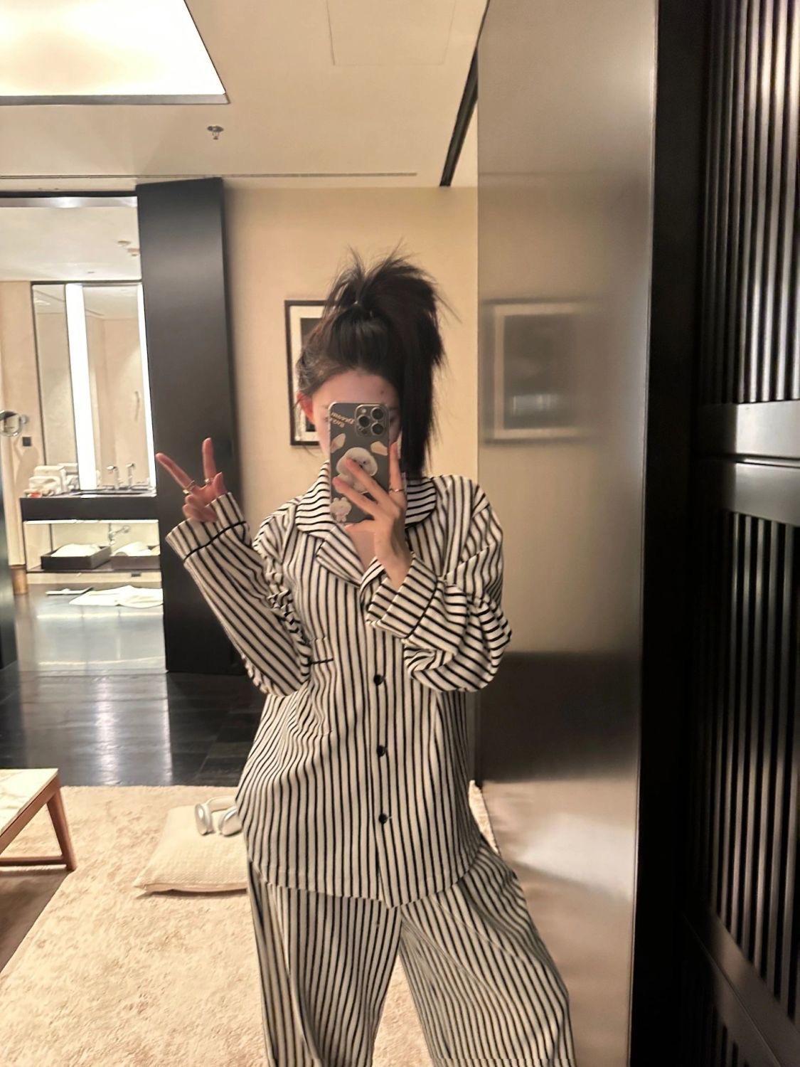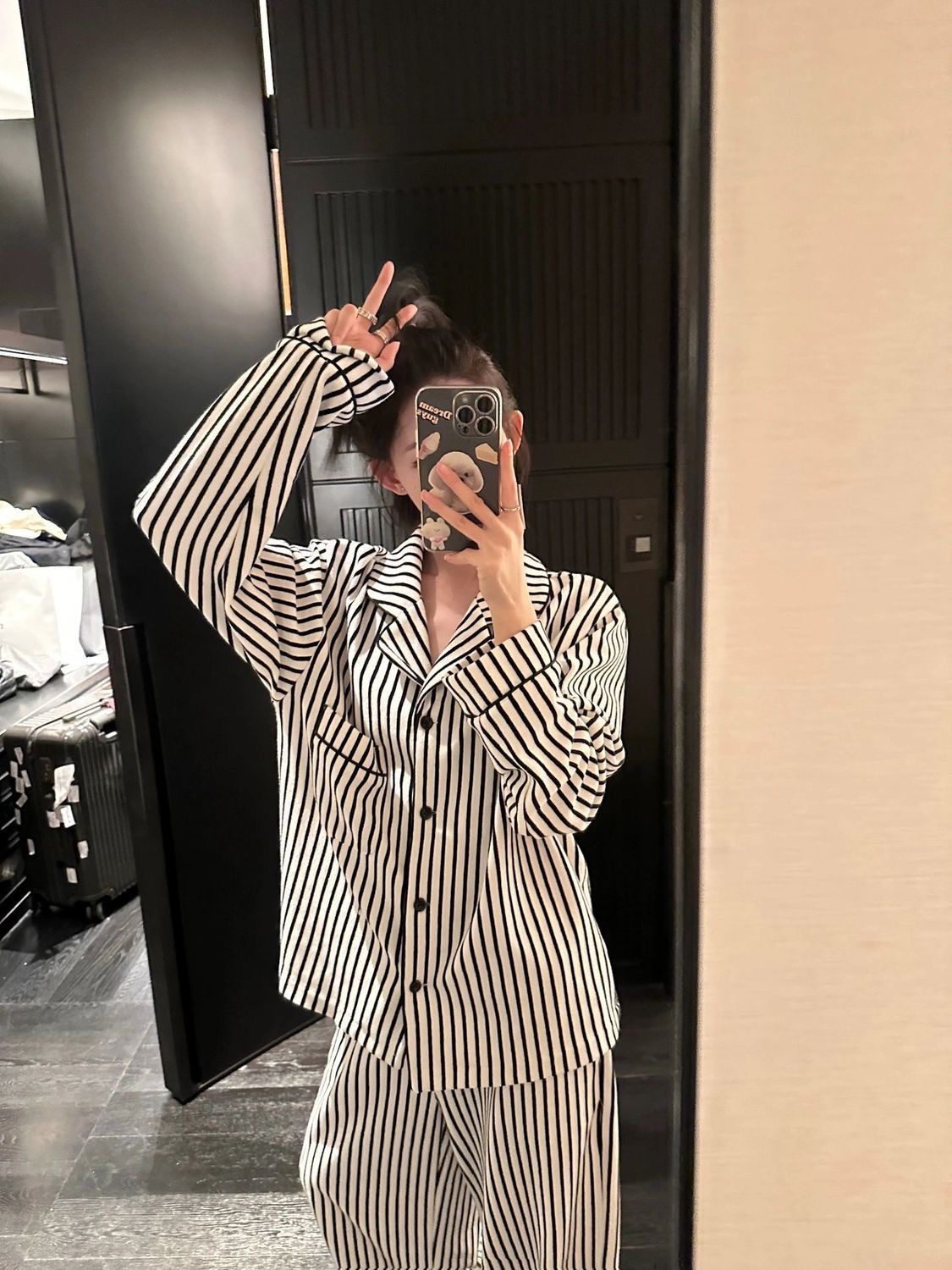 한국식 인즈 스타일 잠옷 여성 봄과 가을 새로운 긴팔 바지 플러스 사이즈 편안한 캐주얼 소녀 홈웨어 세트스토어 가기