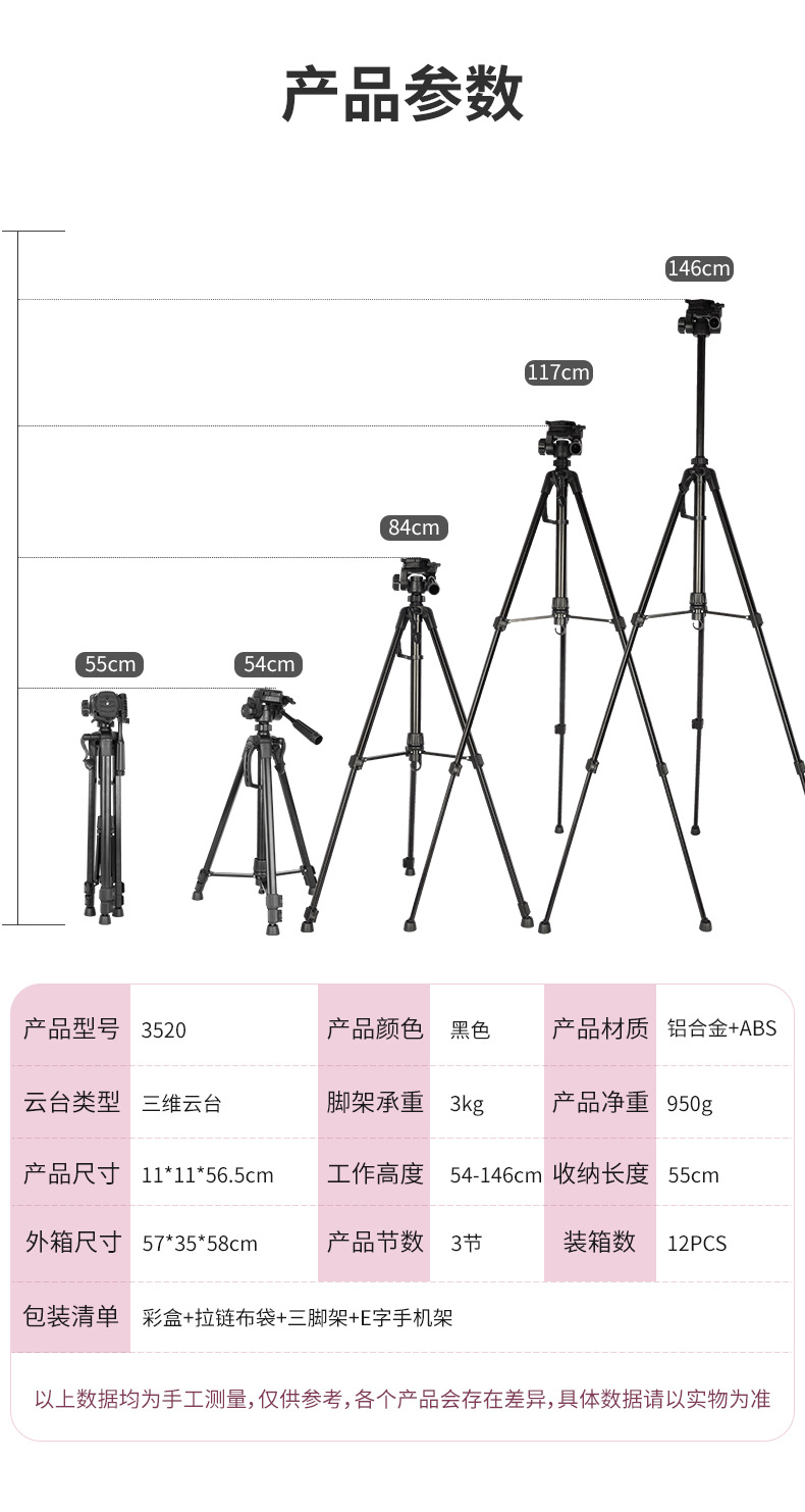 3520 가볍고 편리한 카메라 삼각대 미러리스 카메라 삼각대 플로어 스탠딩 라이브 방송 촬영 휴대폰 삼각대