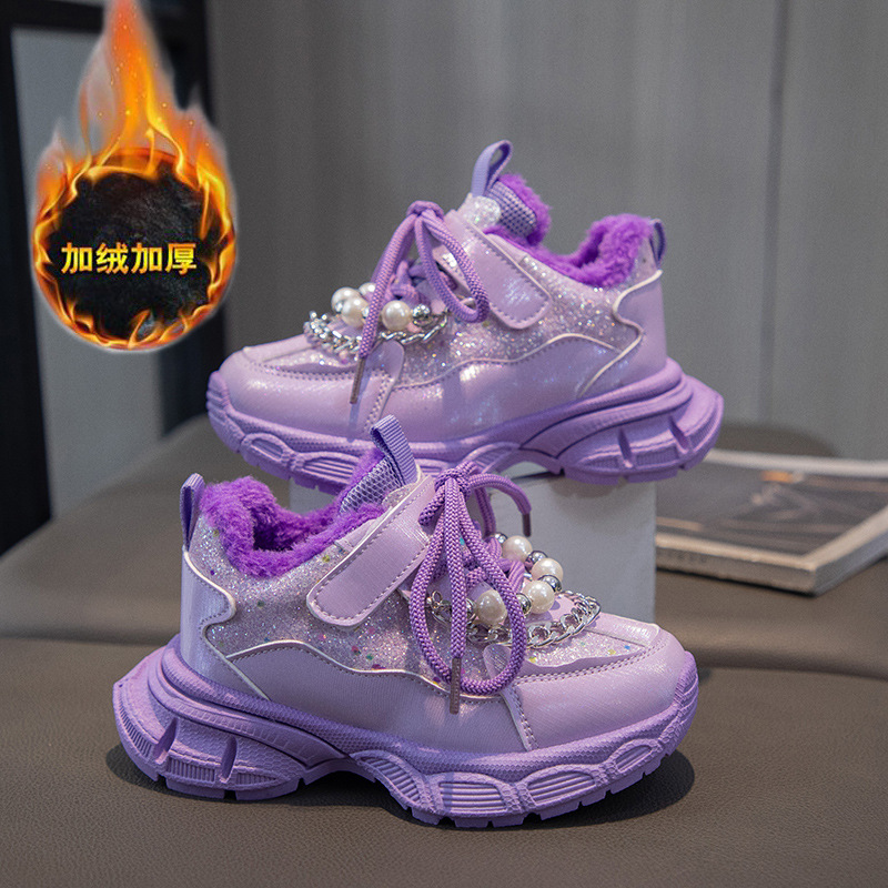 어린이용 경량 운동화 2025 겨울용 플러스 벨벳 대형 면화 아빠 신발 여아용 한국 스타일 진주 광택 가죽 캐주얼 신발