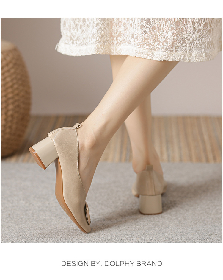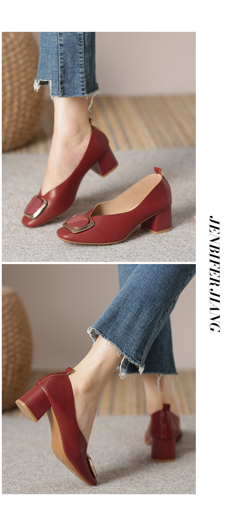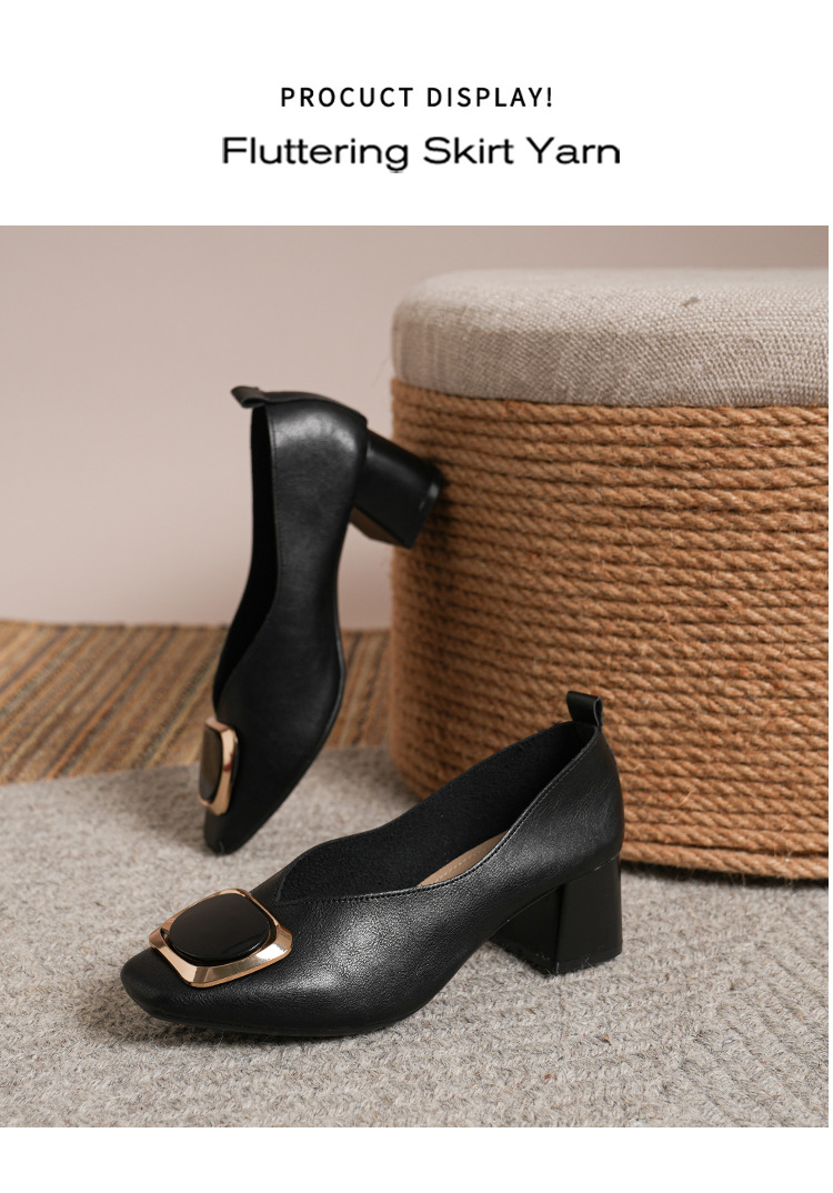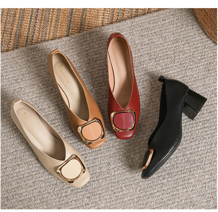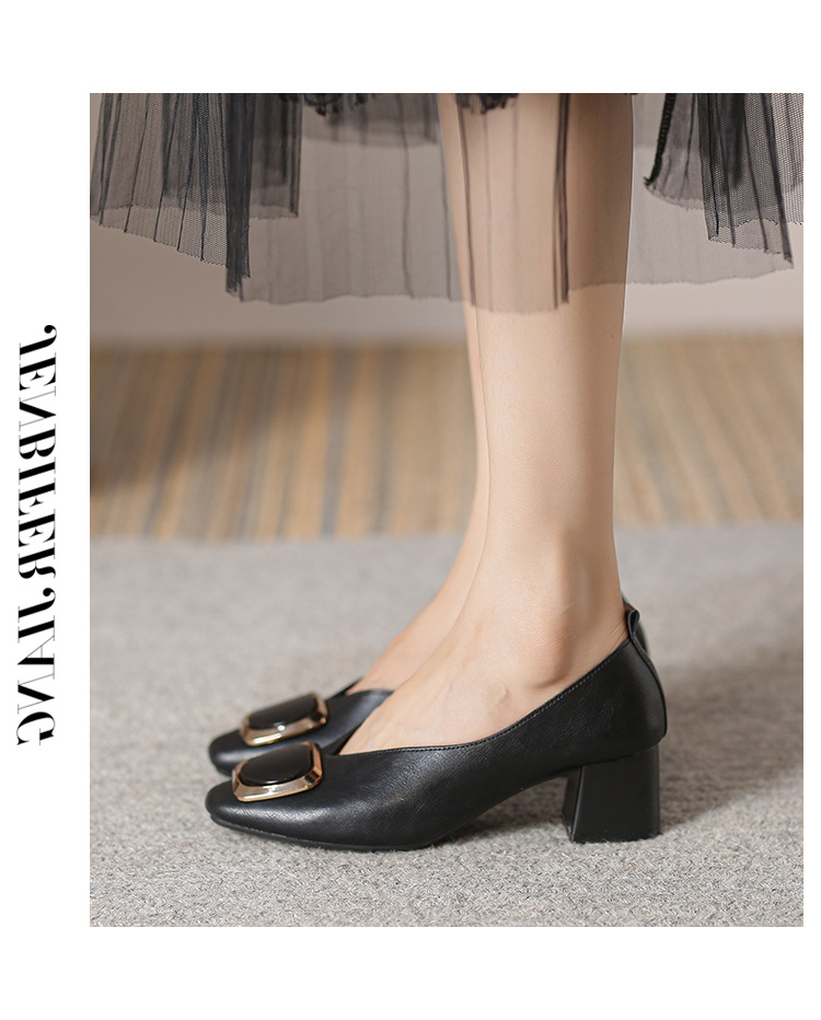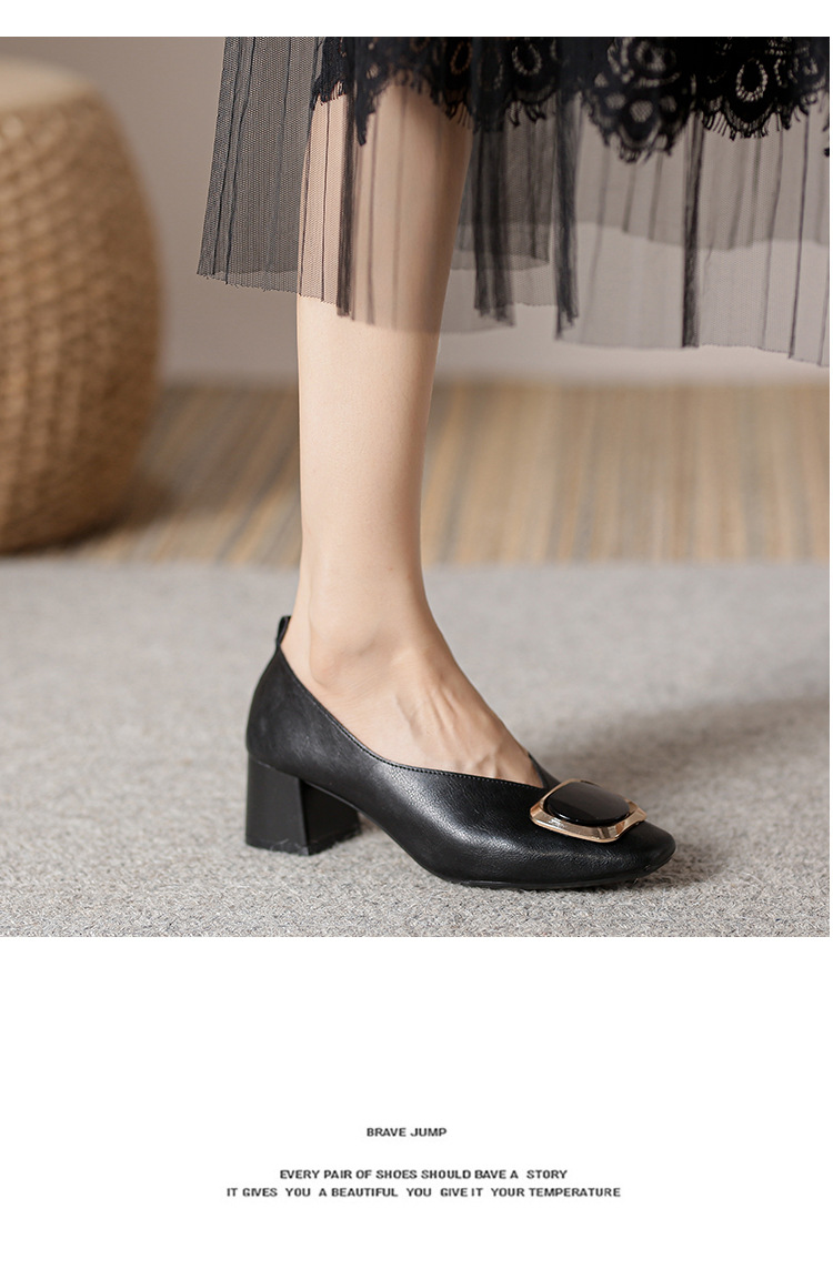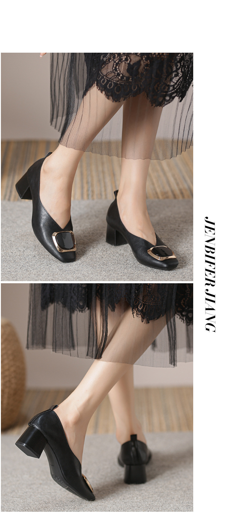이브닝 스타일 레이디 싱글 레이어 신발 여성 신발 2023 새로운 인기있는 복고풍 통근 소프트 가죽 스퀘어 토 미드 하이힐 할머니 신발스토어 가기