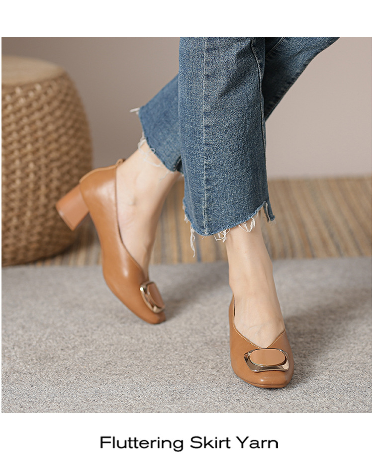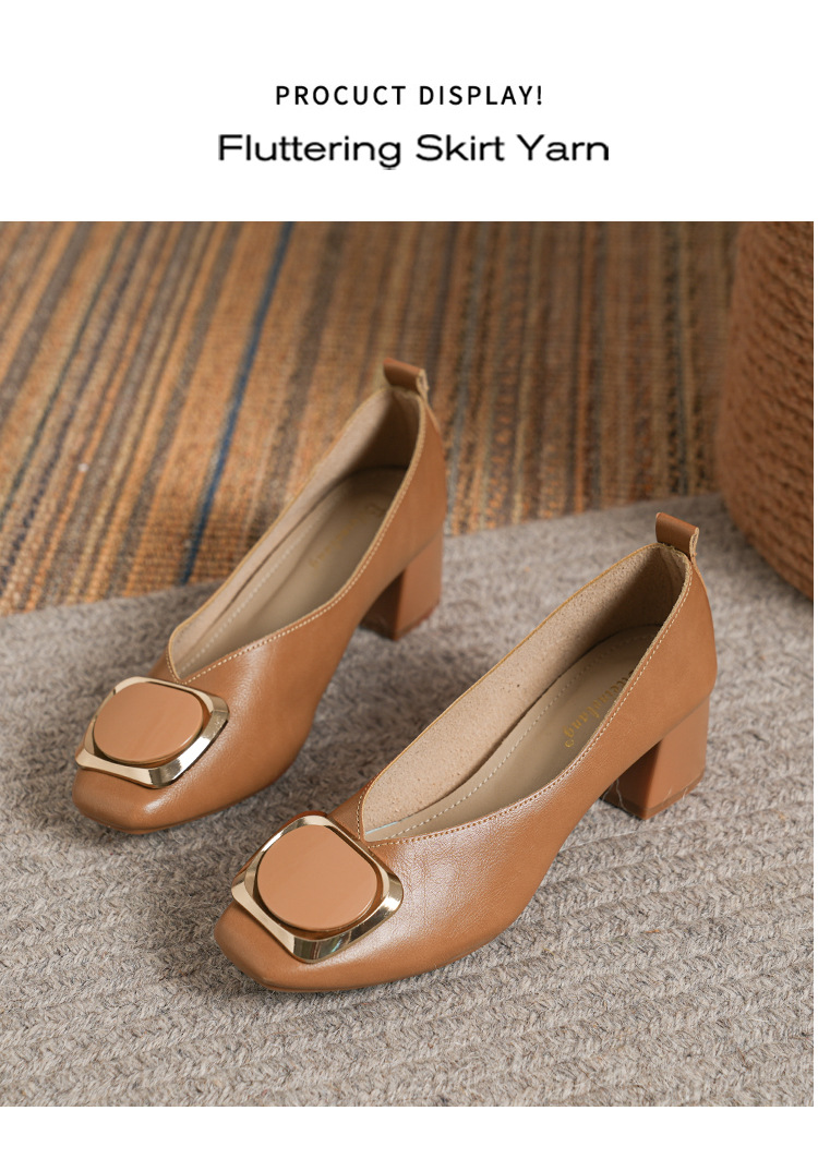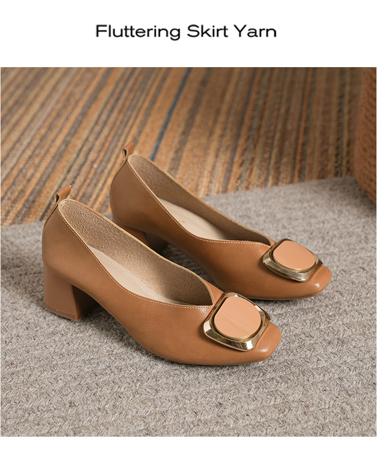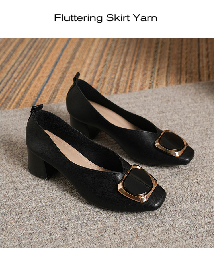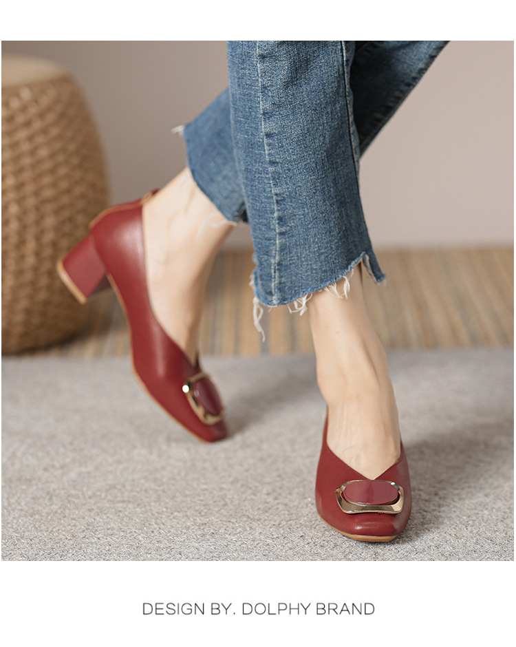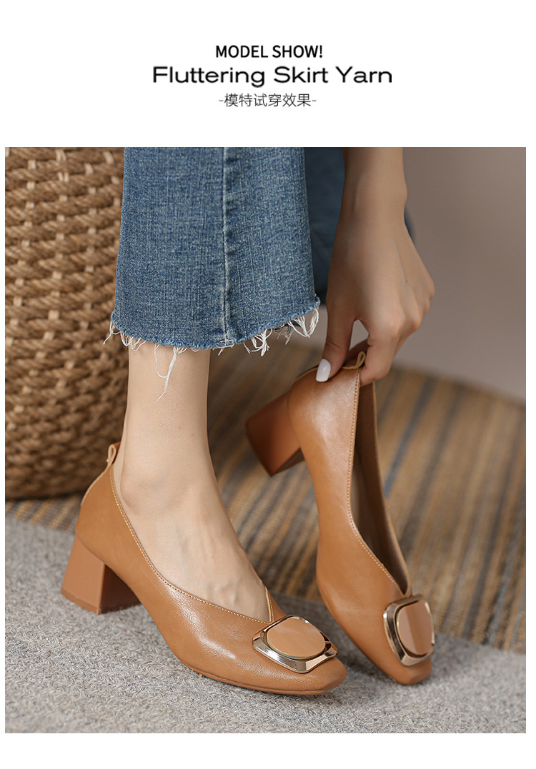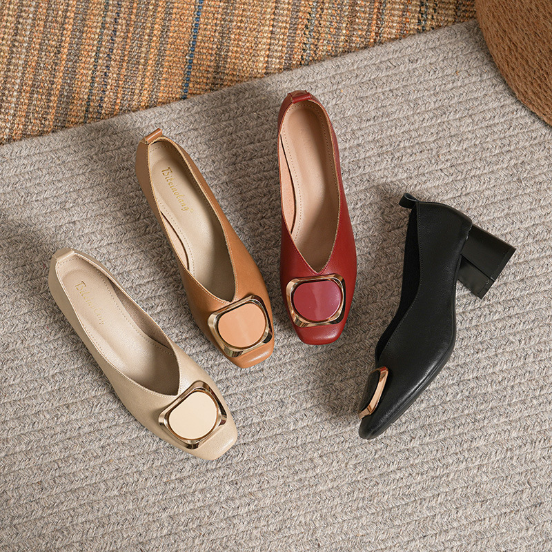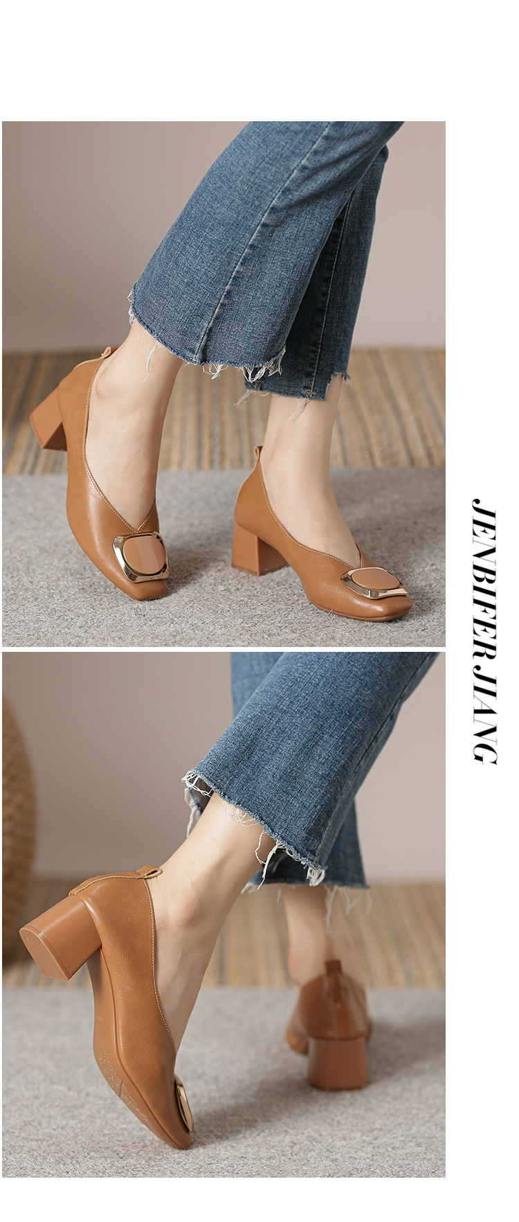 이브닝 스타일 레이디 싱글 레이어 신발 여성 신발 2023 새로운 인기있는 복고풍 통근 소프트 가죽 스퀘어 토 미드 하이힐 할머니 신발스토어 가기
