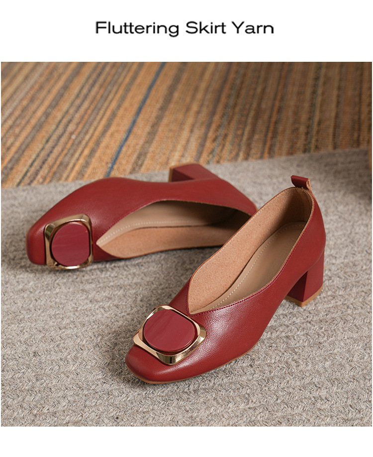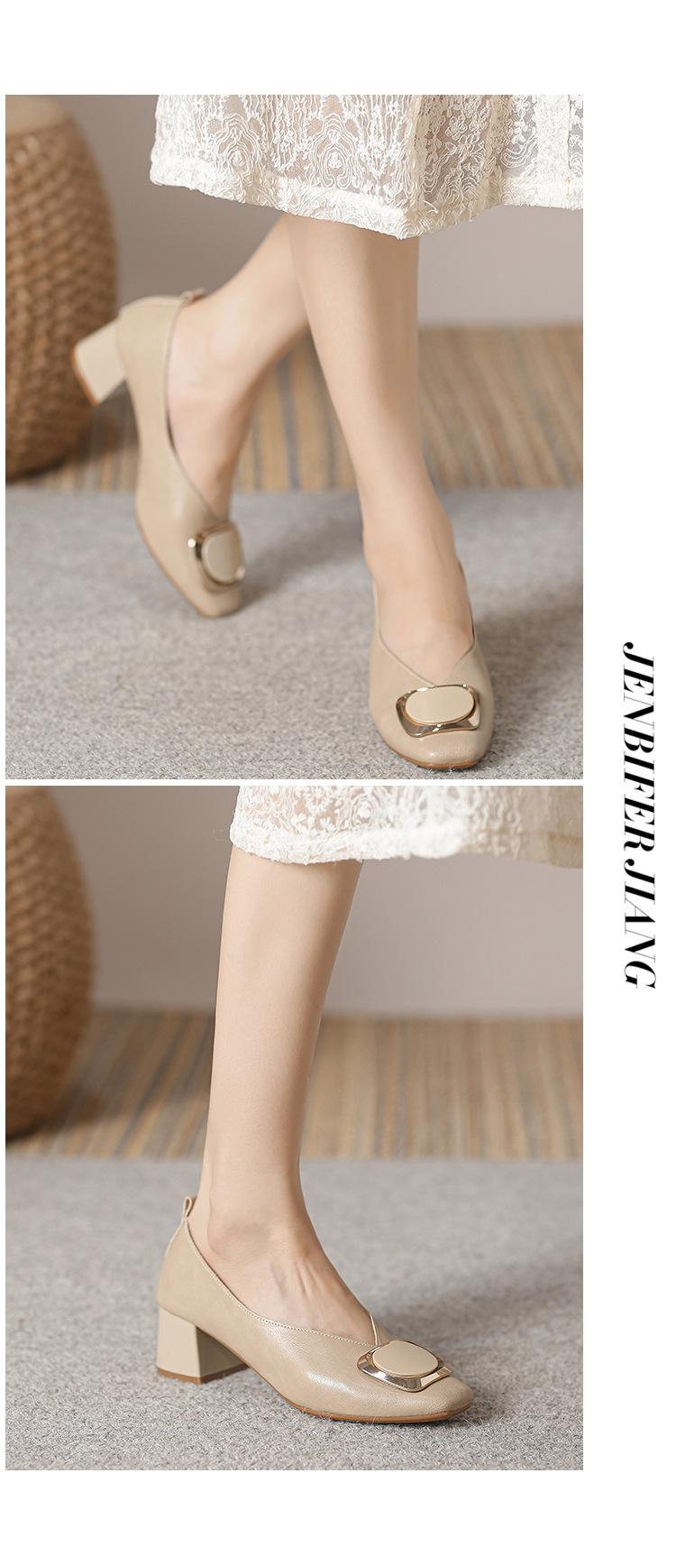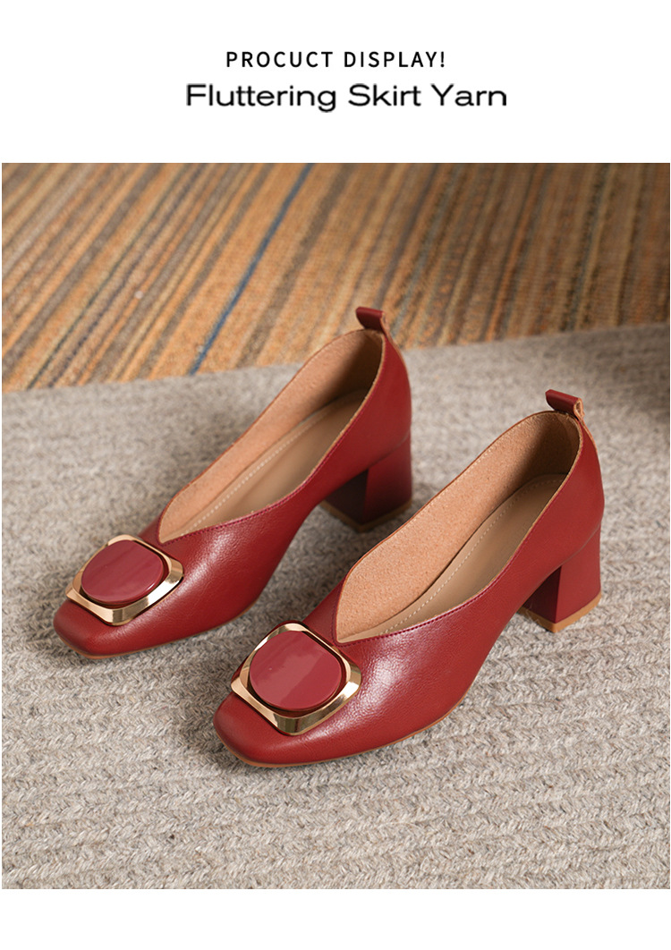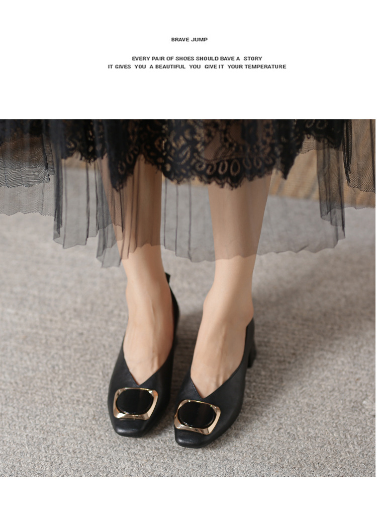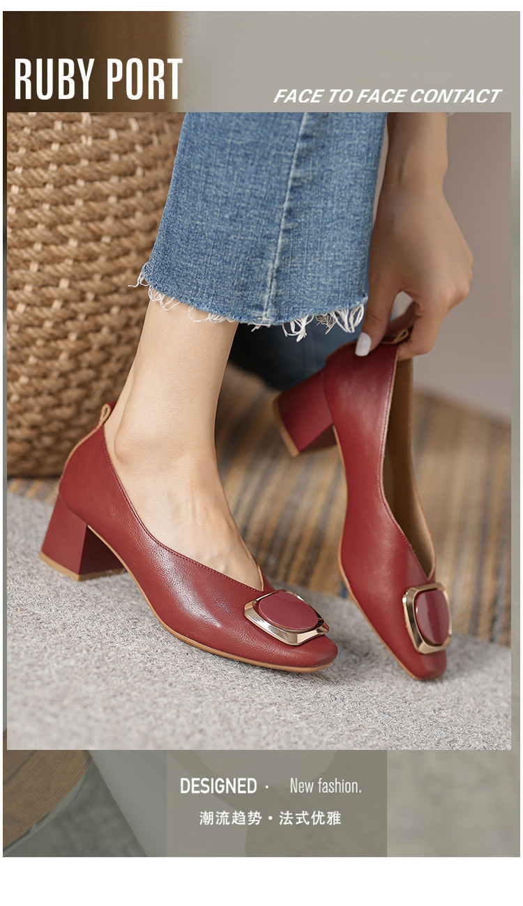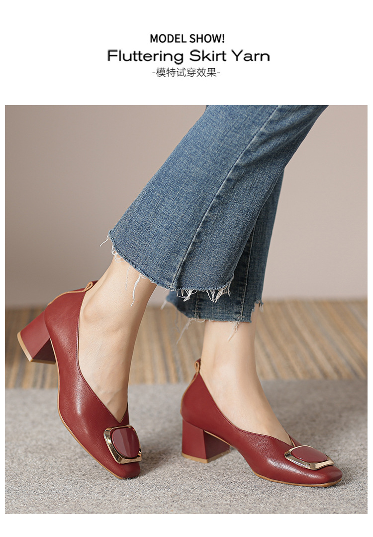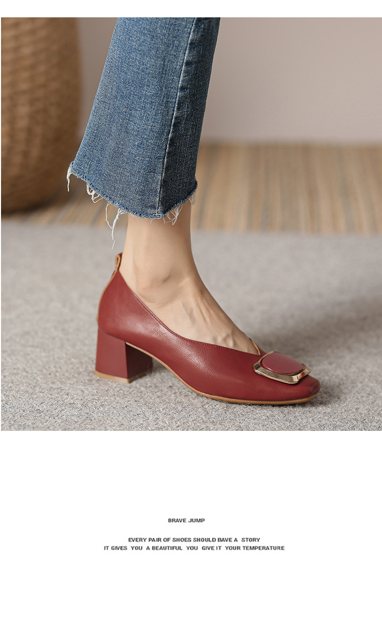 이브닝 스타일 레이디 싱글 레이어 신발 여성 신발 2023 새로운 인기있는 복고풍 통근 소프트 가죽 스퀘어 토 미드 하이힐 할머니 신발스토어 가기