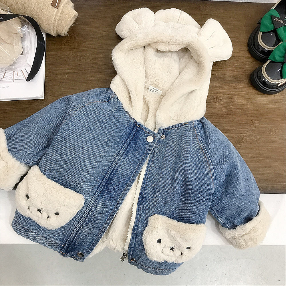 한국 여자 벨벳 패딩 데님 코트 겨울 새로운 외국 스타일 유행 캐주얼 따뜻한 만화 후드 대외 무역스토어 가기