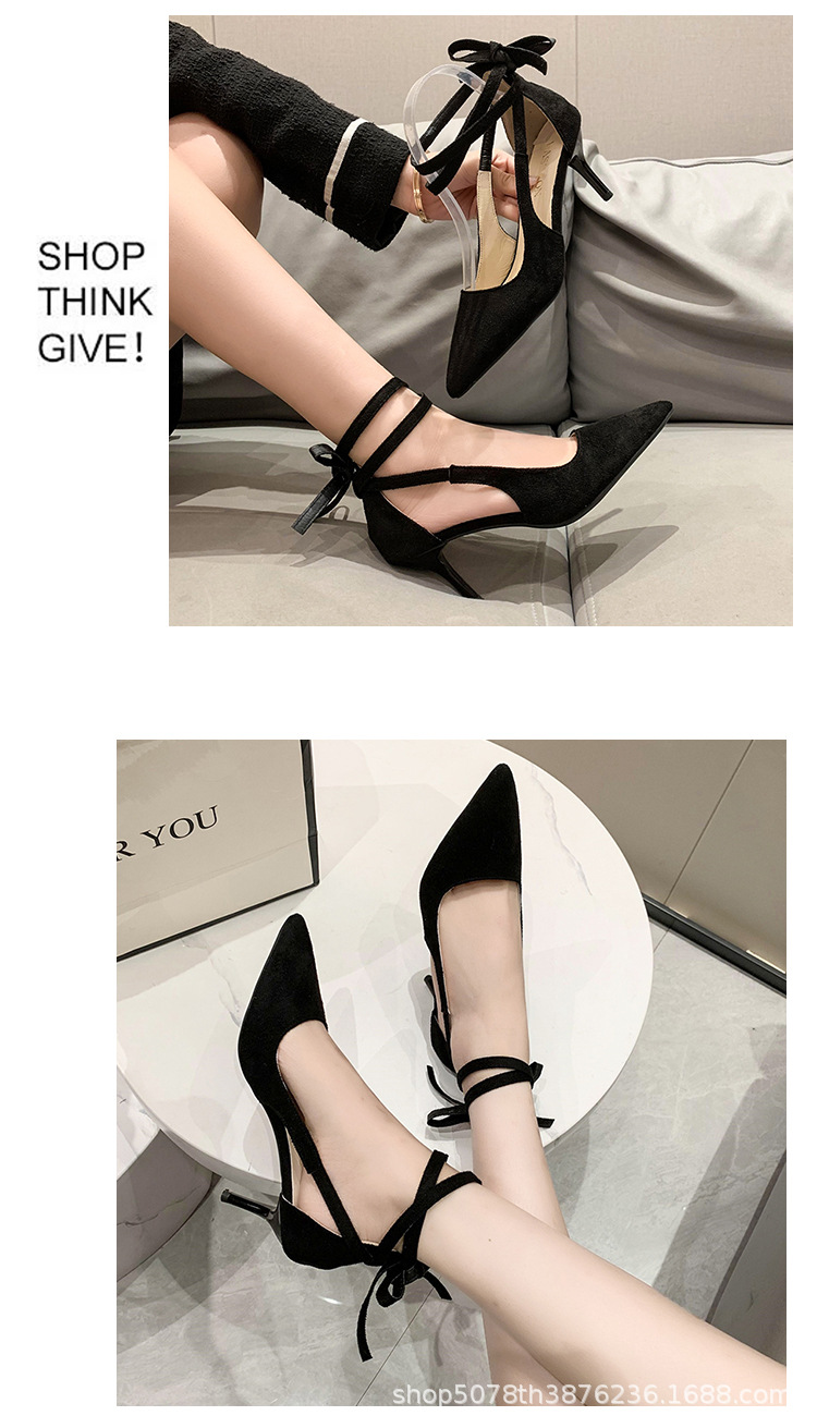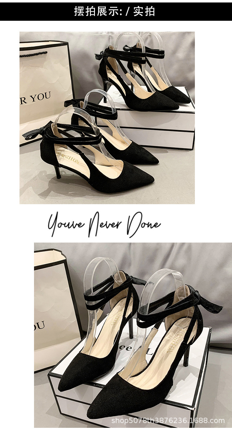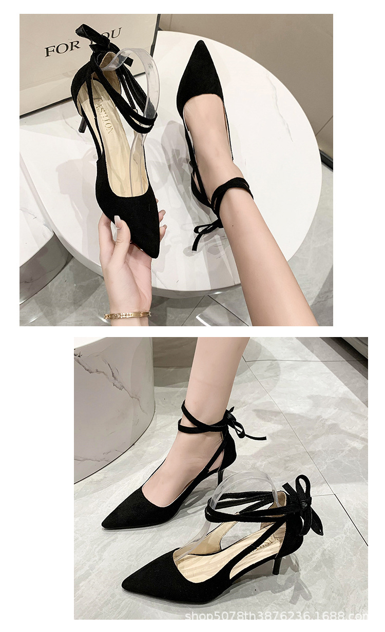 얇은 굽 하이힐 여성스러운 스타일 끈 장식 프렌치 스타일 순수한 매력 블랙 뾰족코 다용도 코스프레 패션 만능 스타일스토어 가기