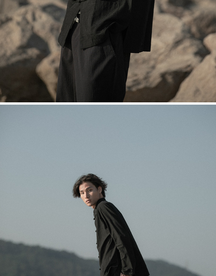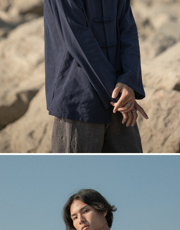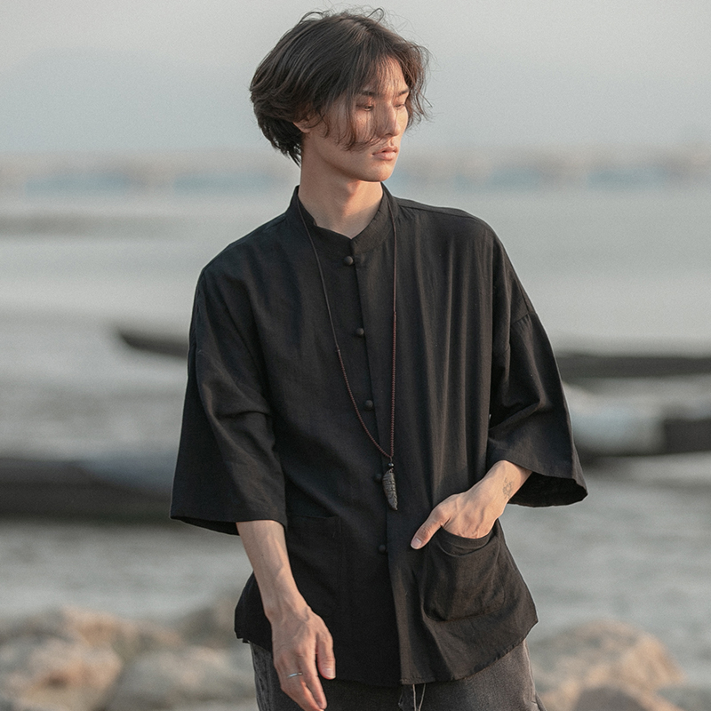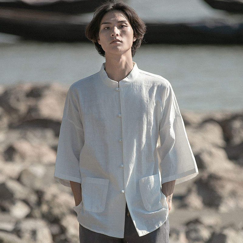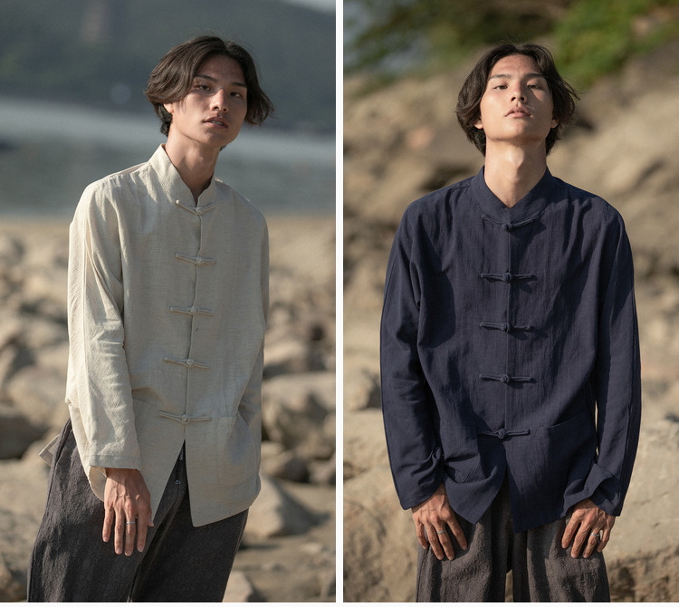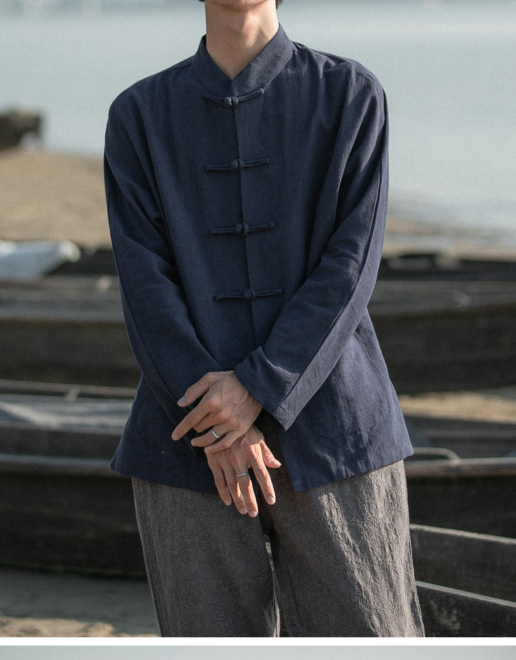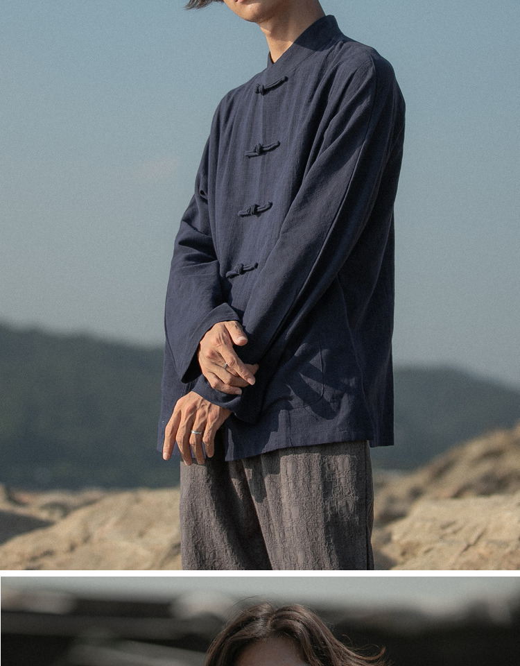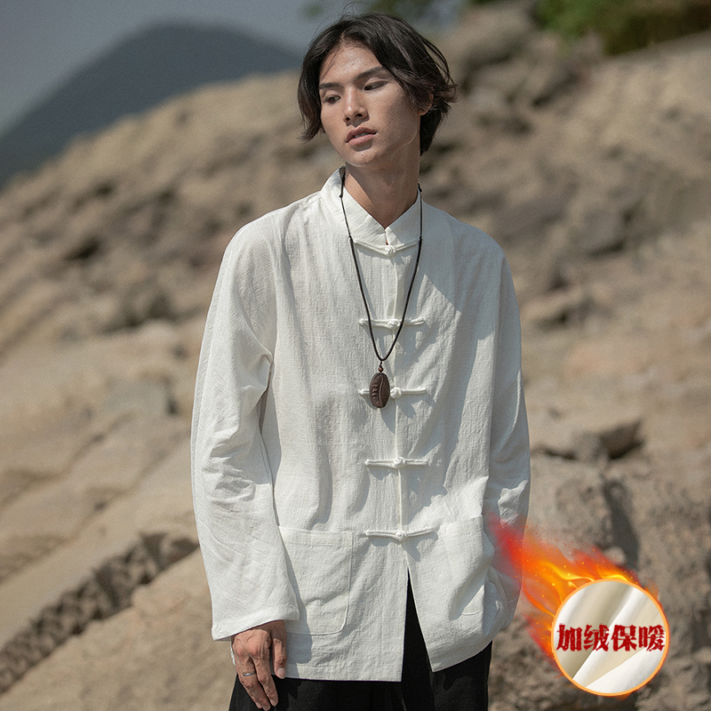 새로운 중국 스타일 탕 세트 남성 기모 복고풍 중국 스타일 린넨 셔츠 긴슬리브 코튼 및 린넨 스탠드 칼라 중산 셔츠스토어 가기