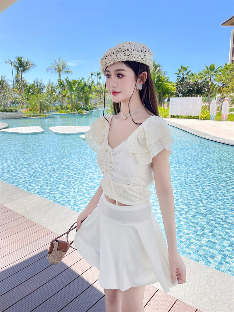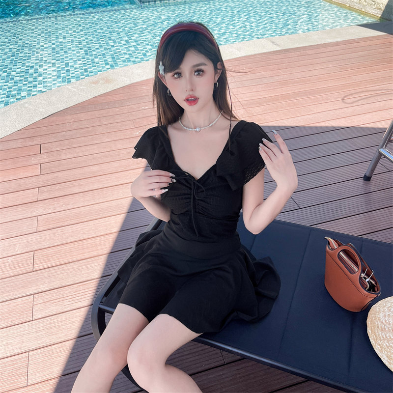 2024 수영복 도매 분할 투피스 단색 수영복 여성 반팔 슬리밍 휴일 온천 수영복 도매