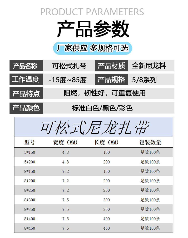 • 흰색 느슨한 나일론 케이블 타이 8*150MM(100 pieces/bag)