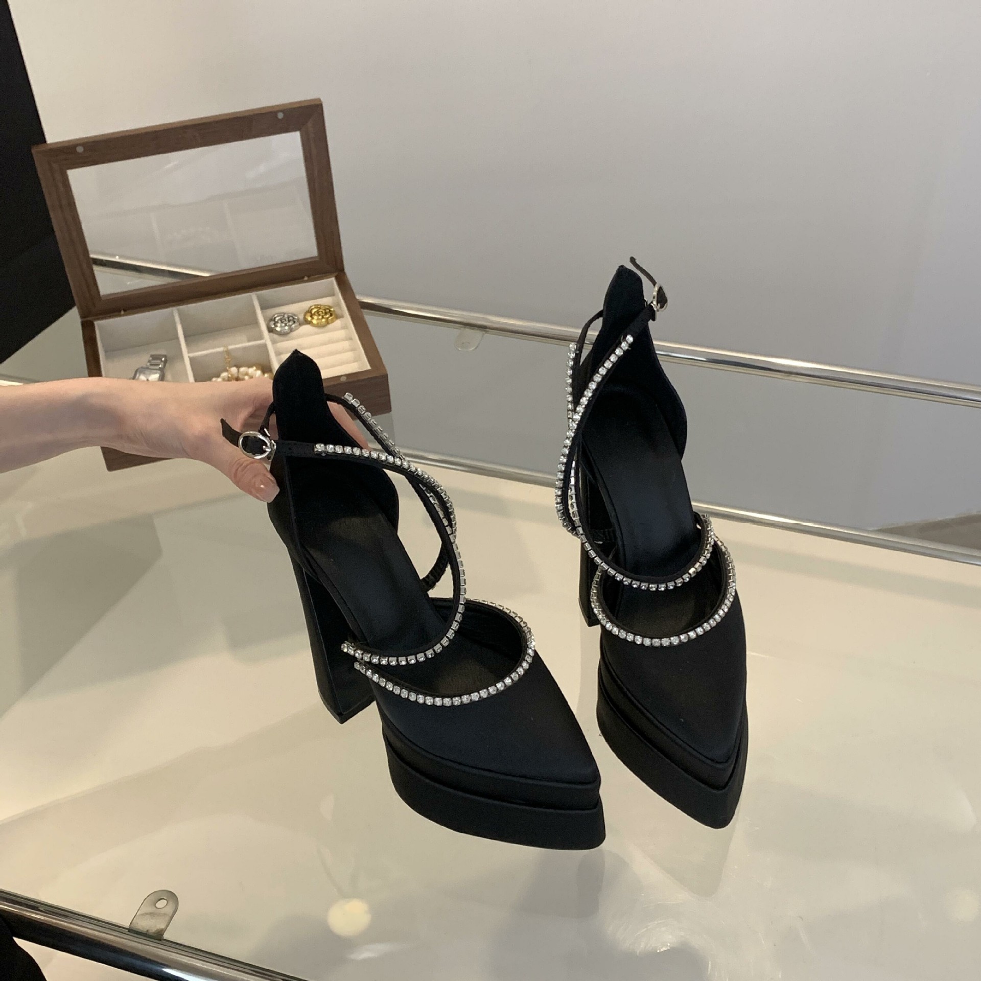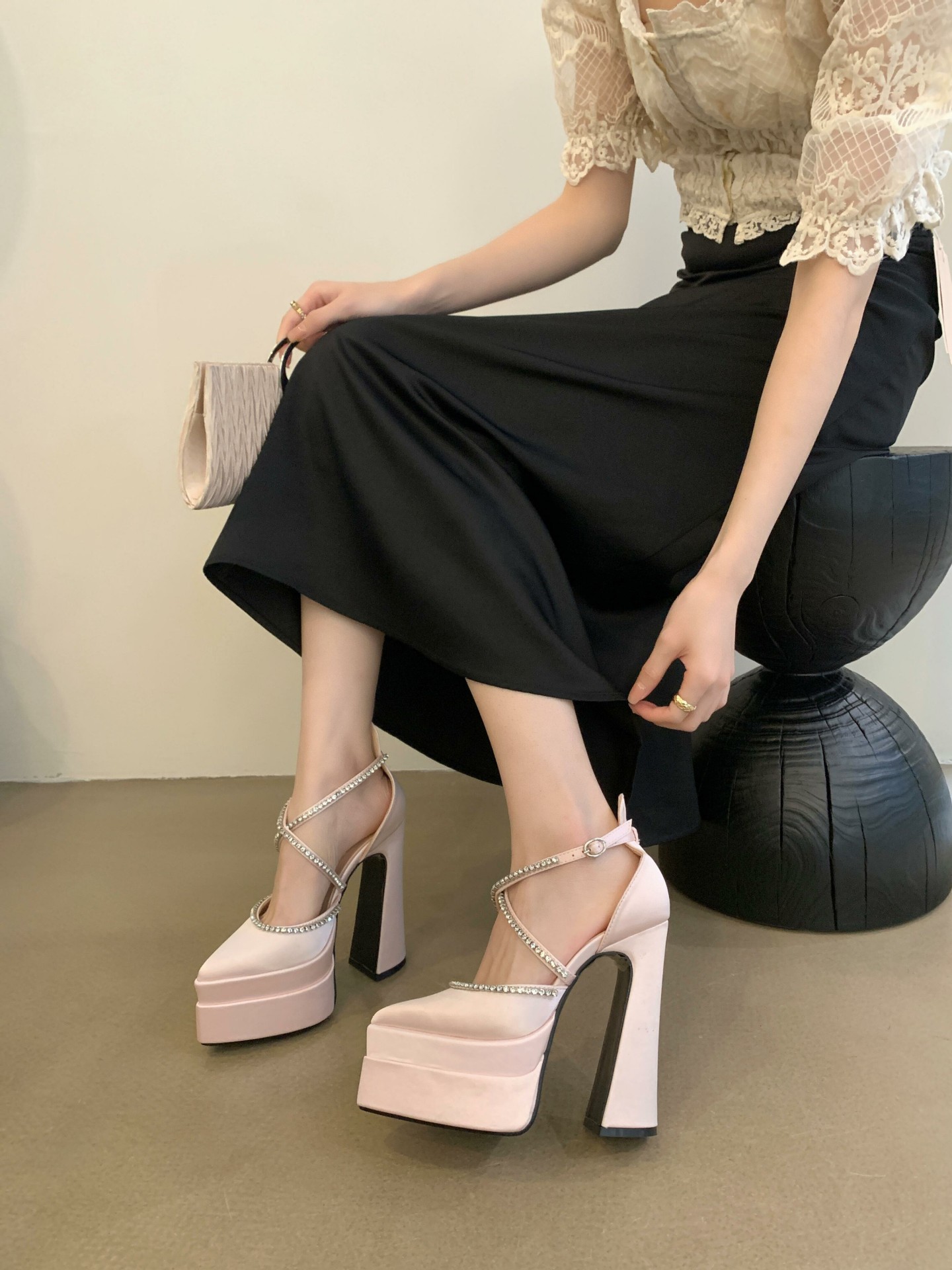 2024 봄과 여름 새로운 패션 플랫폼 청키 힐 증오 하늘 높은 뾰족한 새틴 하이힐 캣워크 쇼 여성 신발스토어 가기