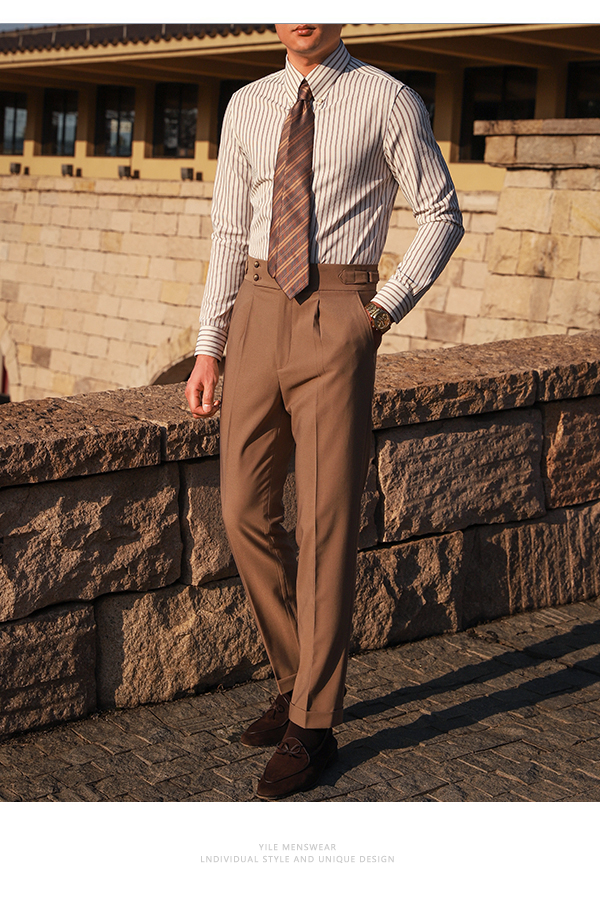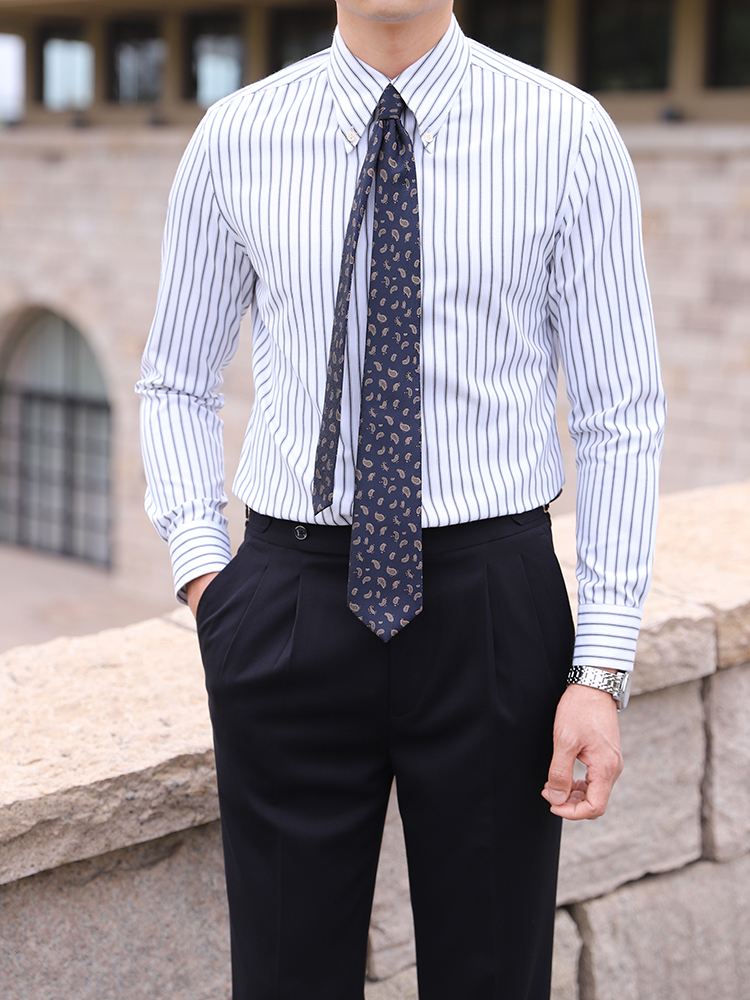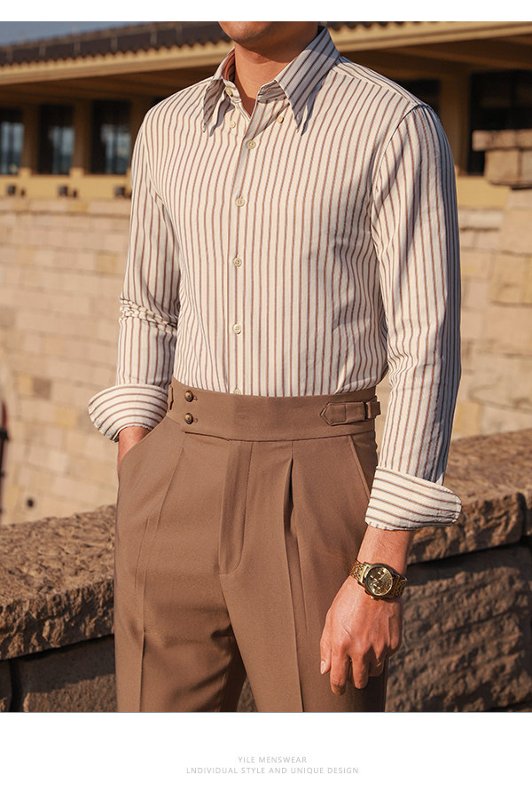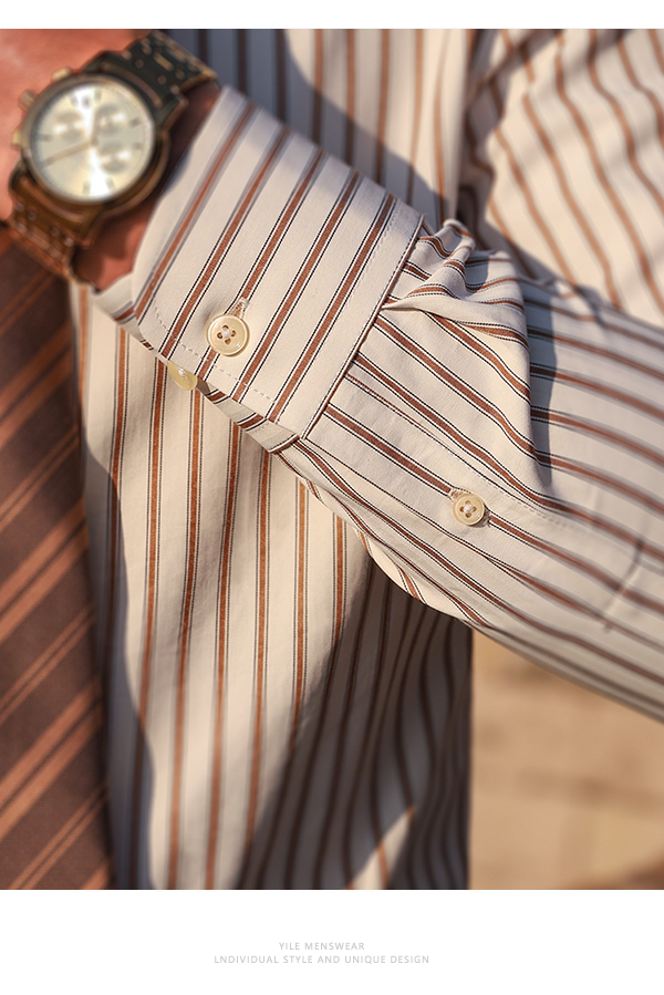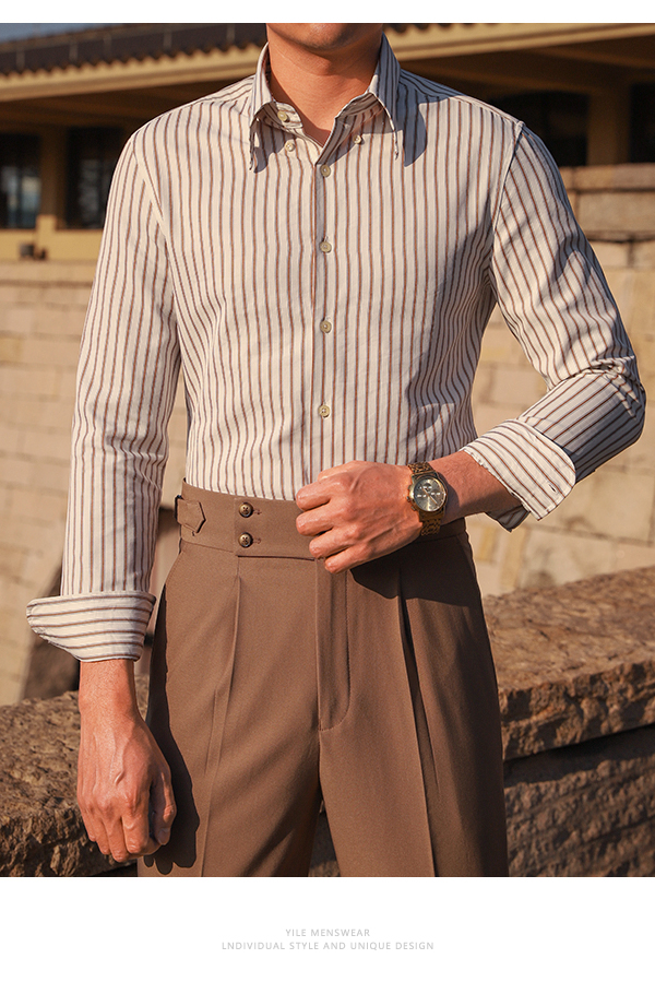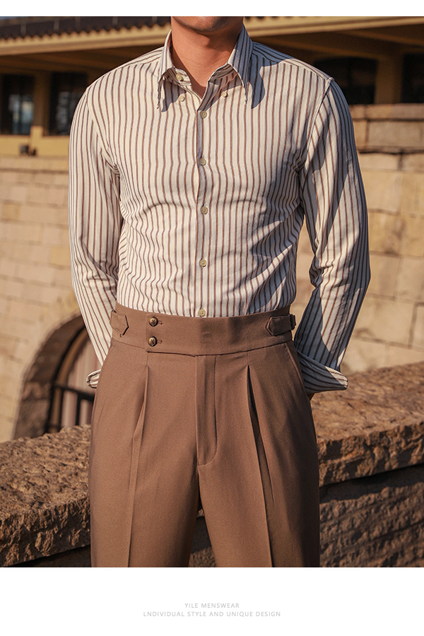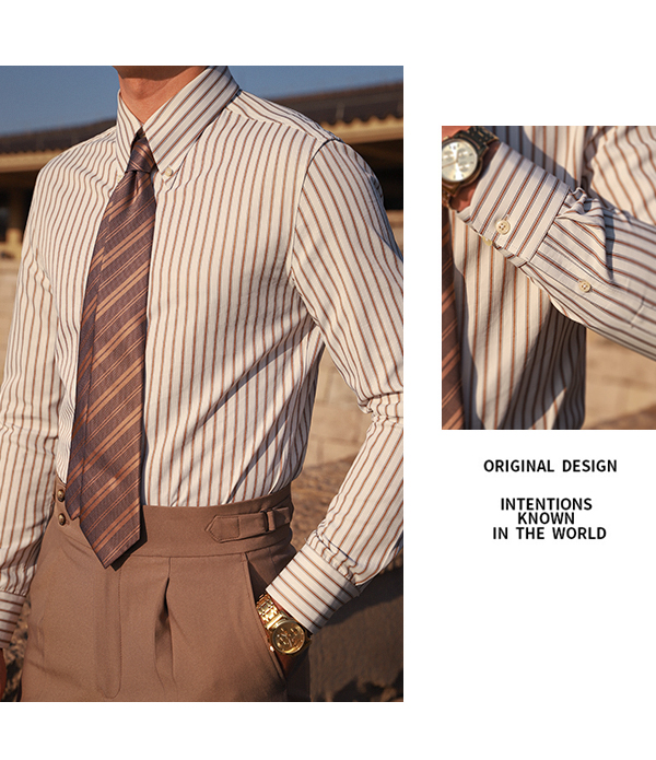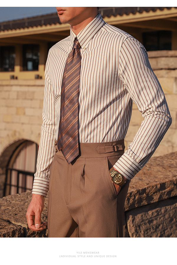 레트로 다크 브라운 스트라이프 셔츠 남성용 긴팔 비즈니스 캐주얼 셔츠 뾰족한 칼라 영국 패션 미국 공식 셔츠스토어 가기