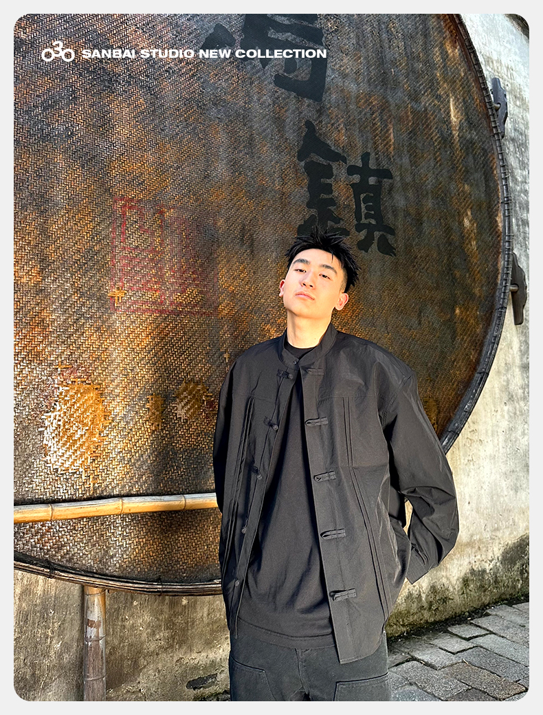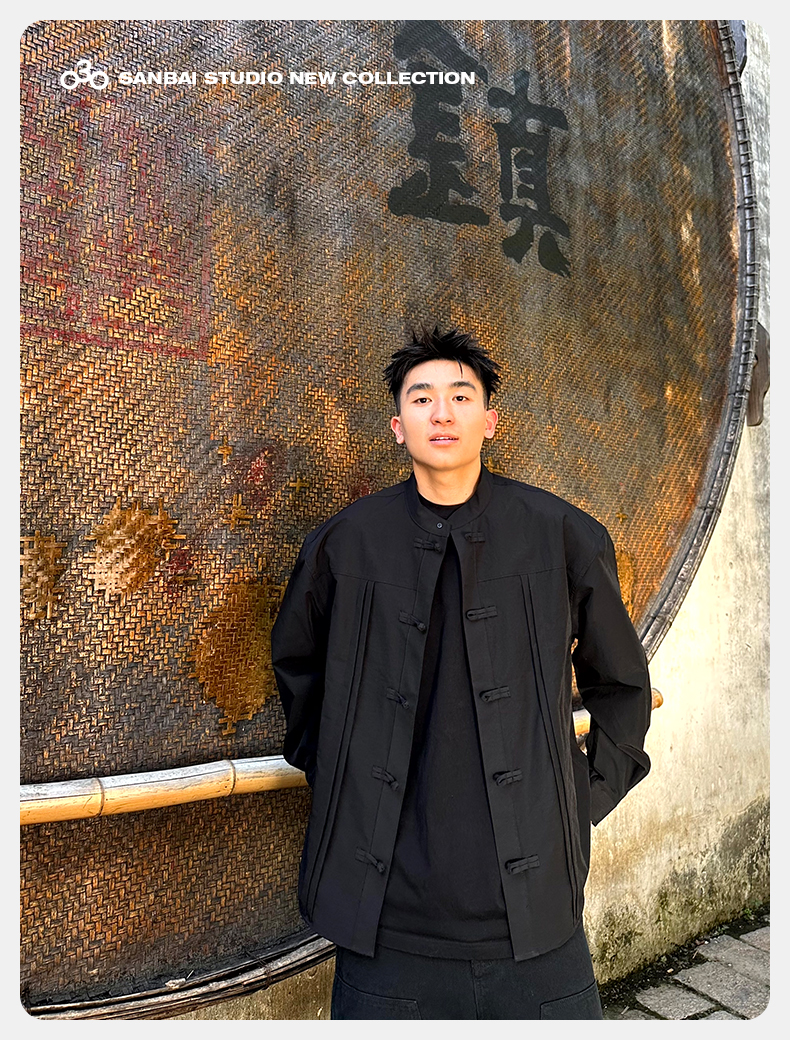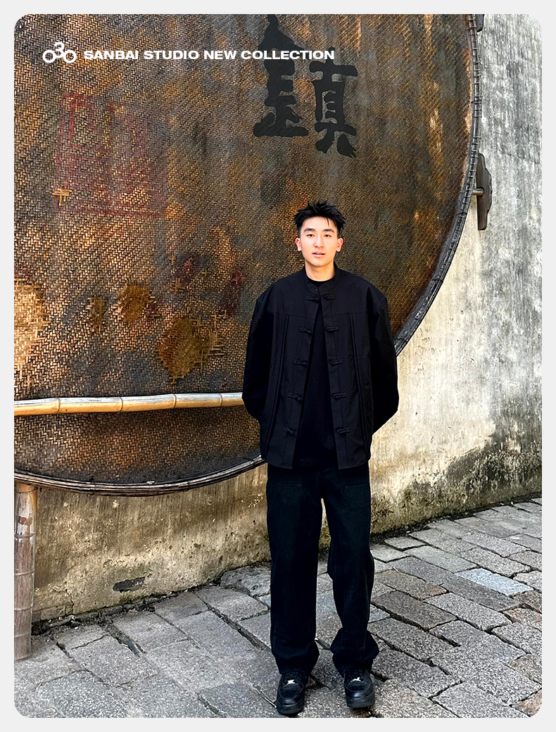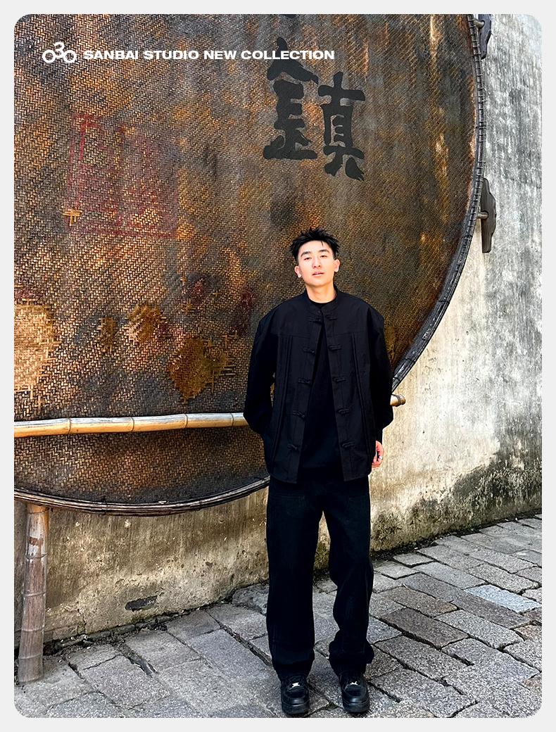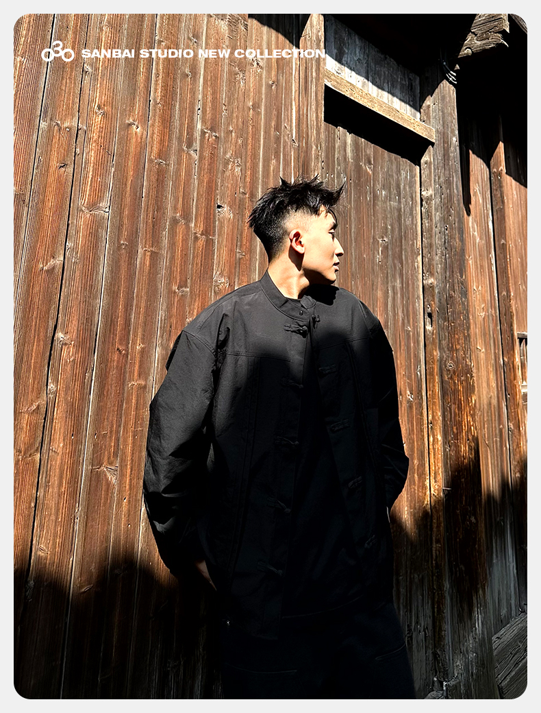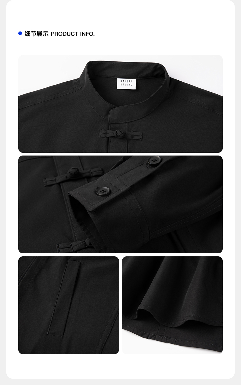 새로운 중국 스타일 탕 세트 셔츠 남성 가을 틈새 디자인 감각 버클 긴팔 셔츠 캐주얼 블랙스토어 가기