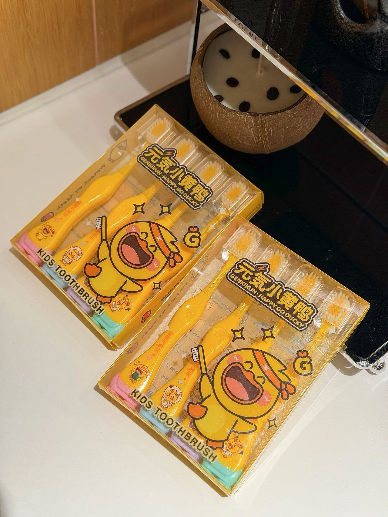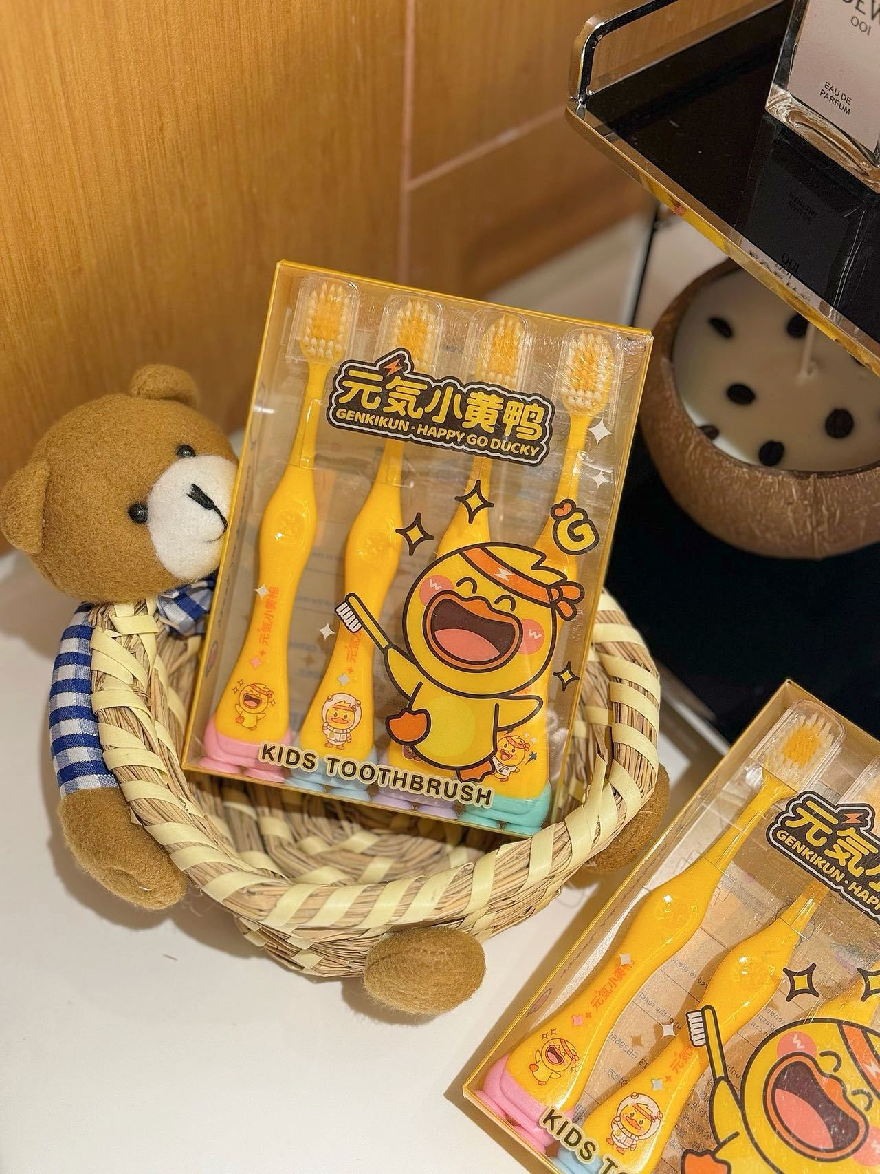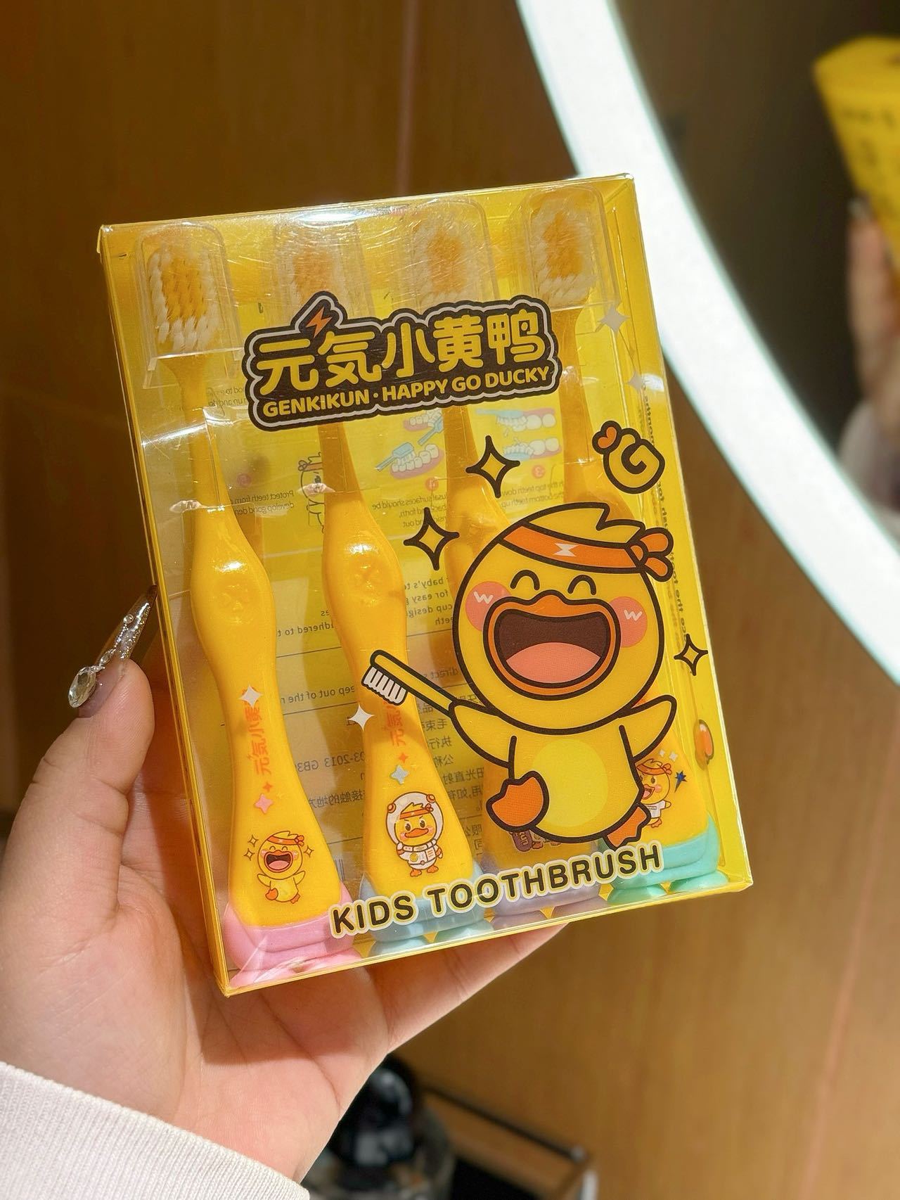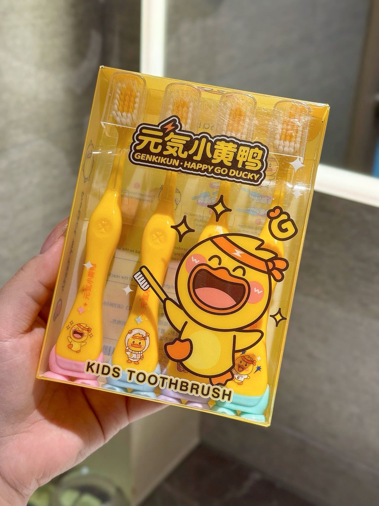 활기 넘치는 작은 노란 오리 어린이 칫솔 4 PC 가구 칼집 빨판 바닥 와이드 헤드 소프트 헤어 칫솔 도매