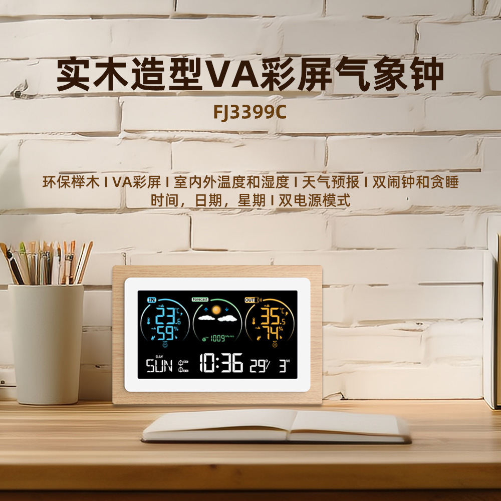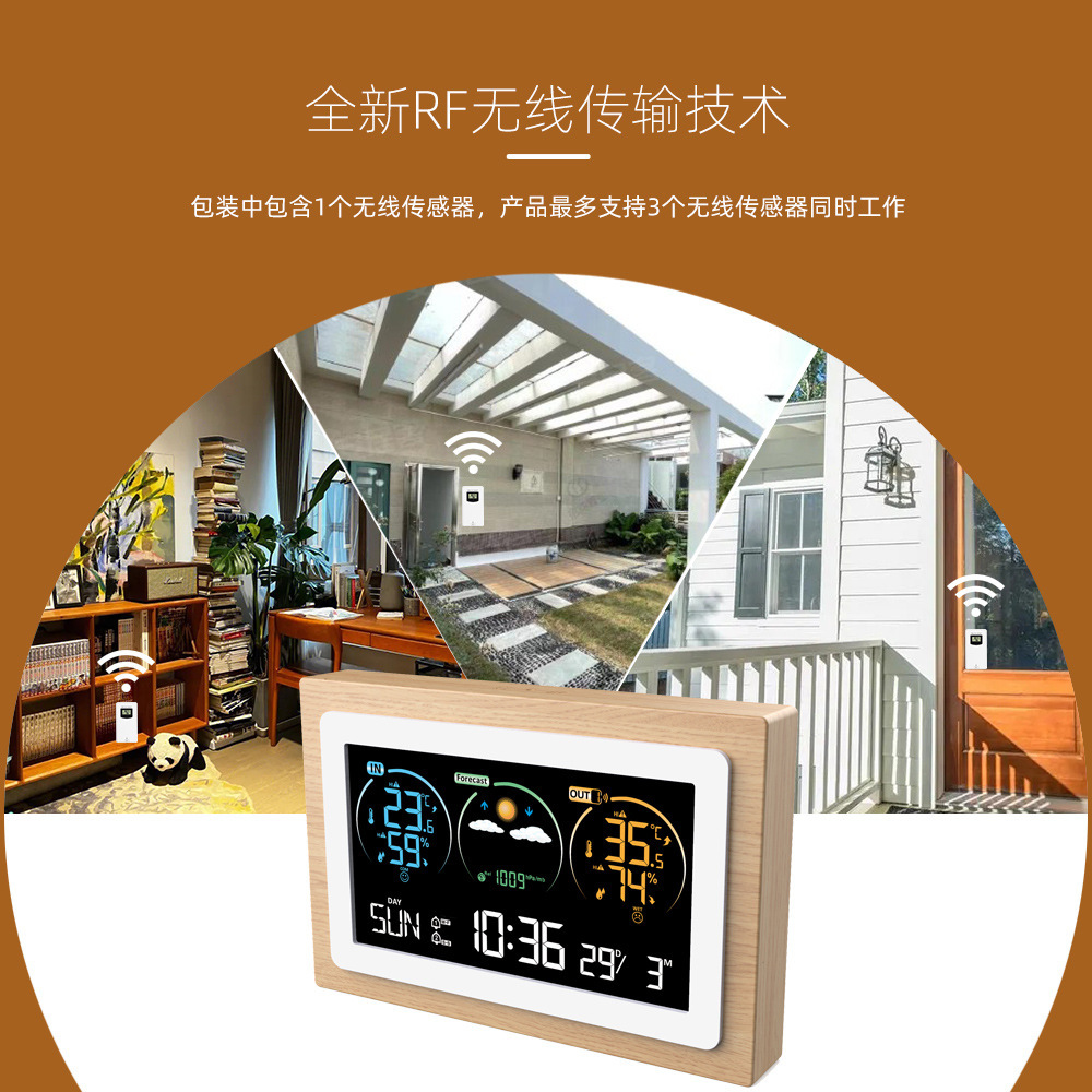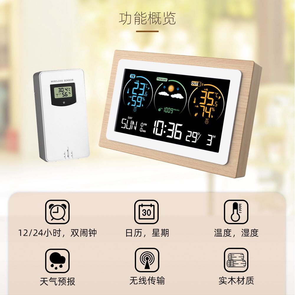 국경 간 VA 컬러 스크린 기상 관측소 실내 및 실외 온도 및 습도 측정기 목재 무선 일기 예보 알람 시계 더블 스누즈 새로운스토어 가기