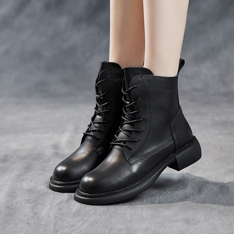 첫 번째 레이어 소 가죽 두꺼운 힐 플랫 캐주얼 세련된 얇은 측면 지퍼 여성용 마틴 부츠