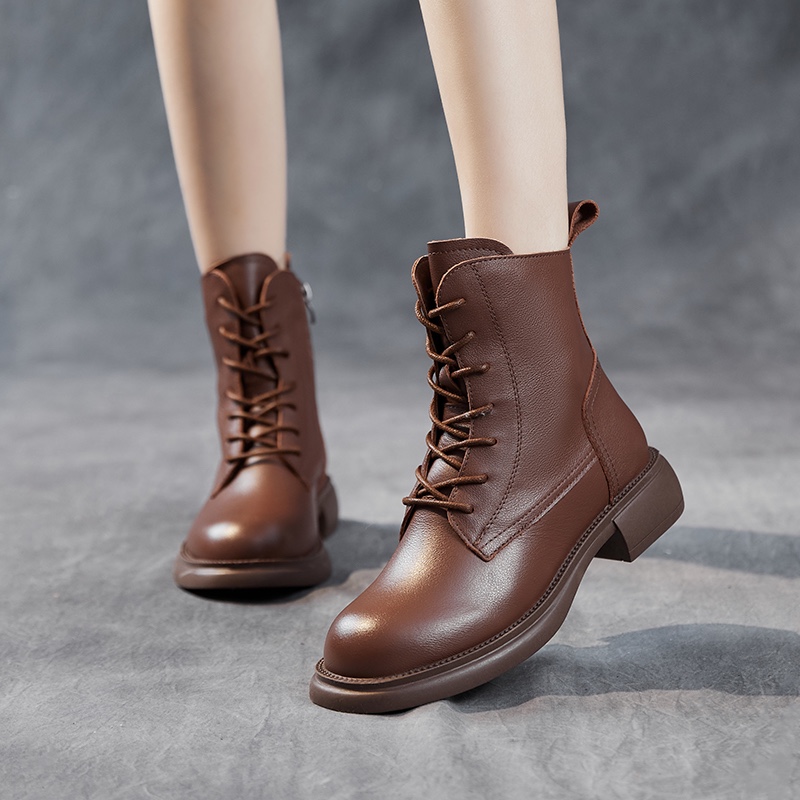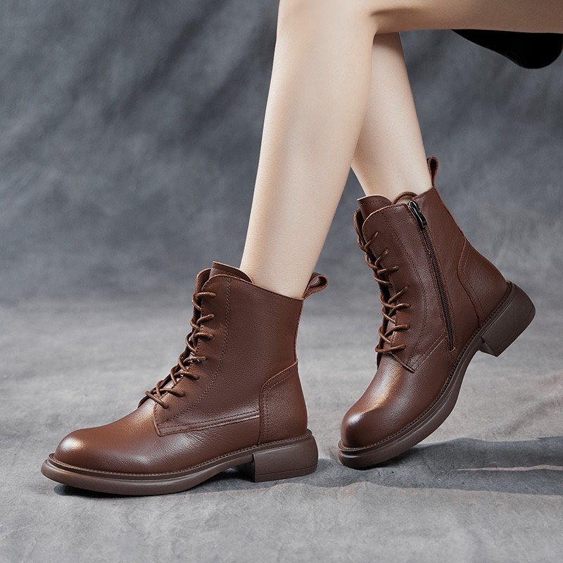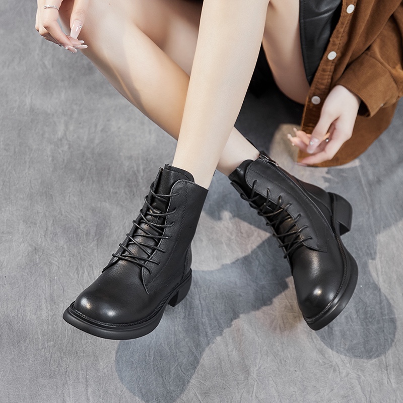 첫 번째 레이어 소 가죽 두꺼운 힐 플랫 캐주얼 세련된 얇은 측면 지퍼 여성용 마틴 부츠스토어 가기