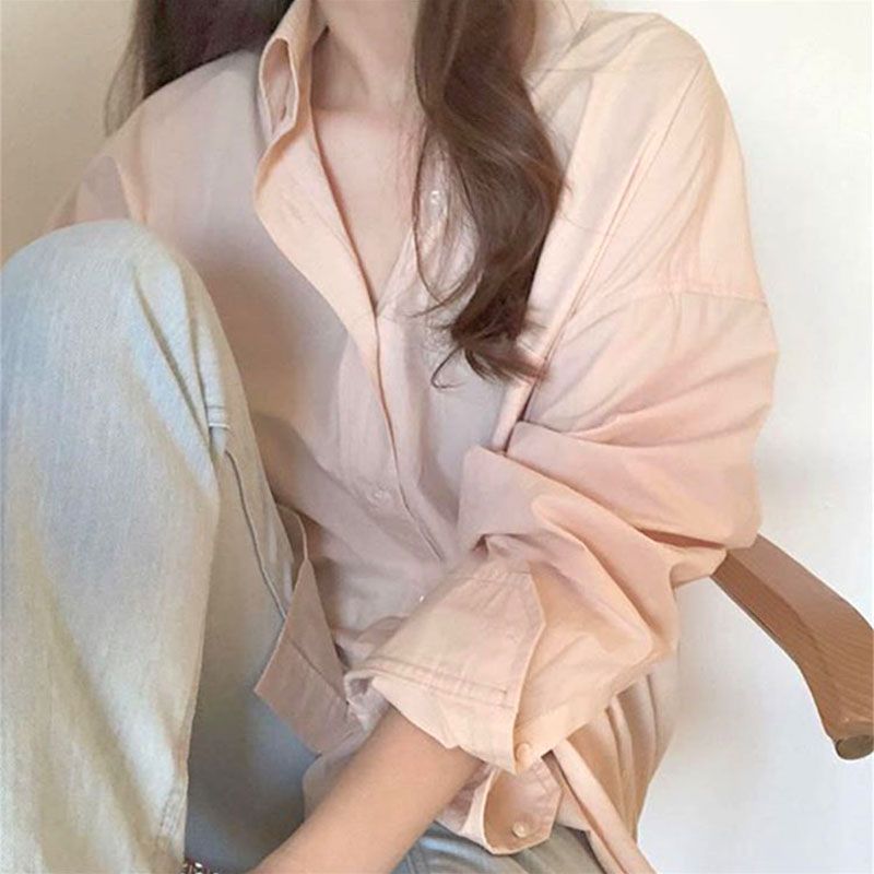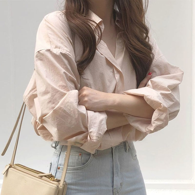 한국식 봄과 가을 화이트 허니 파우더 간단한 빈티지 레이저 싱글 브레스트 캐주얼 긴팔 셔츠 탑