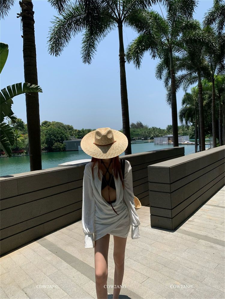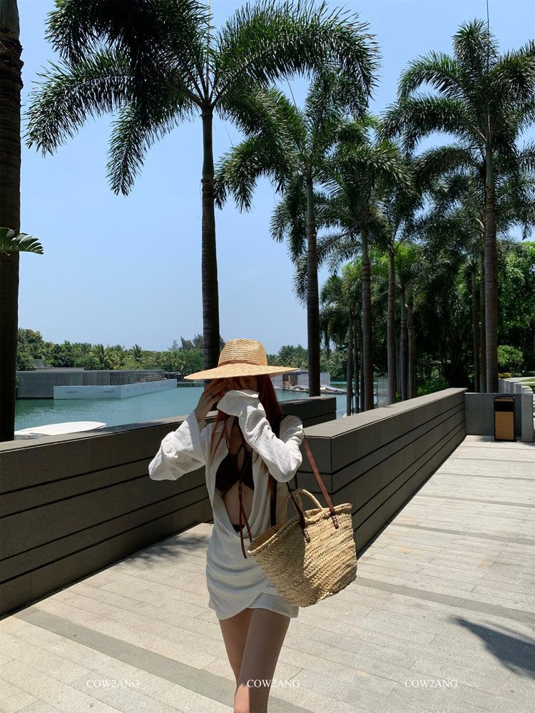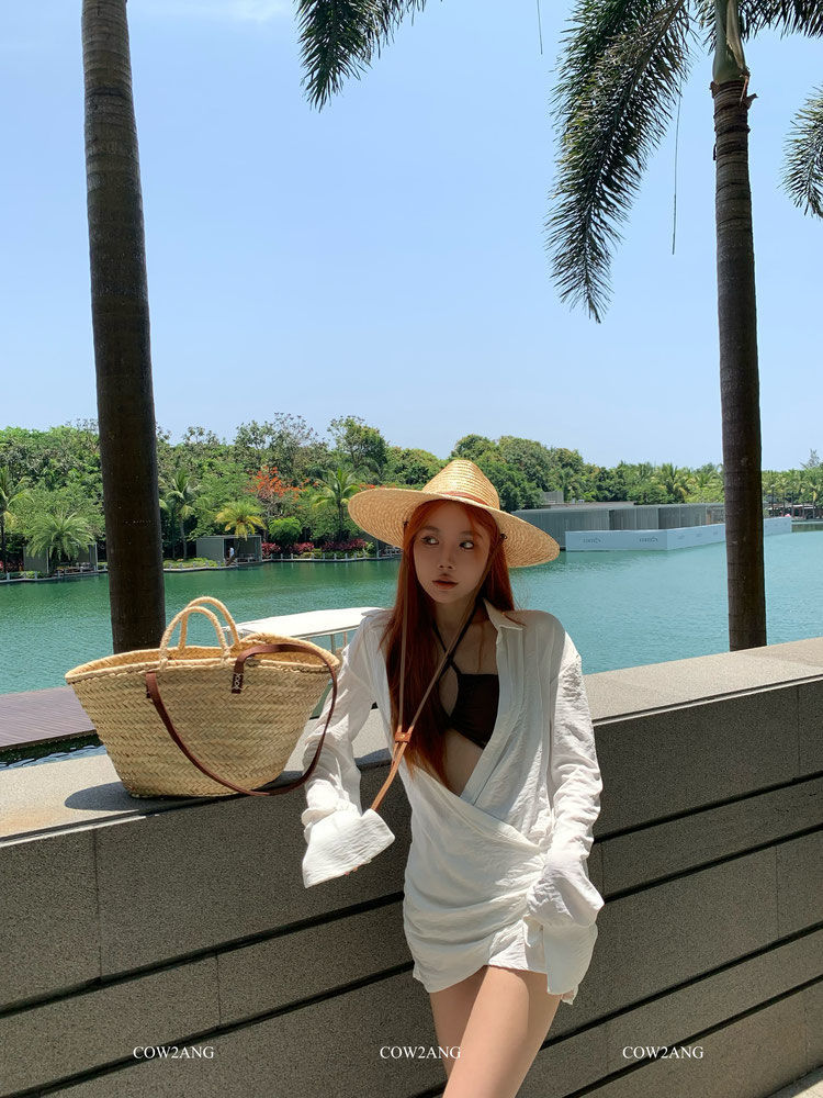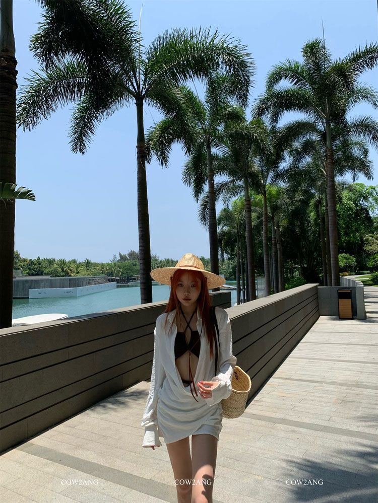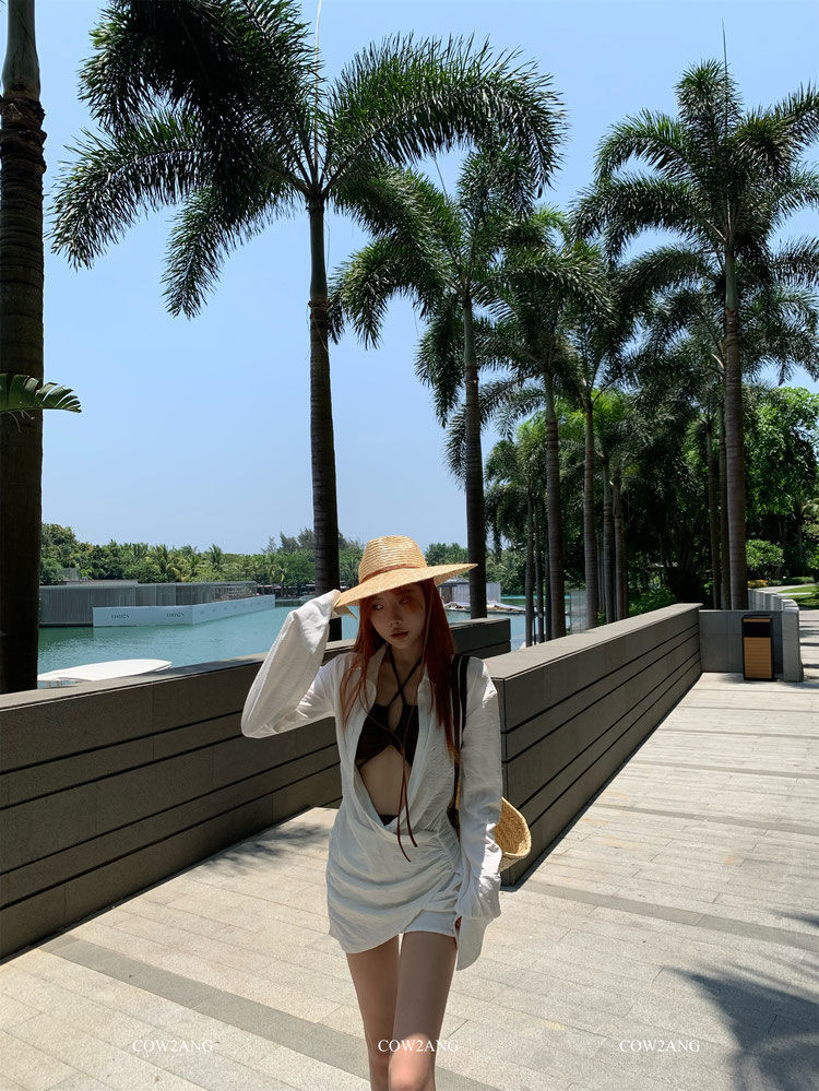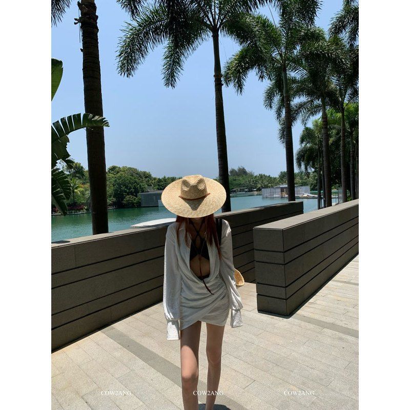 에 해변 해변 휴가 비키니 셔츠 스커트 수영복 여성 3 피스 세트 배꼽 덮음 인터넷 유명인 작은 가슴 더운 여름스토어 가기