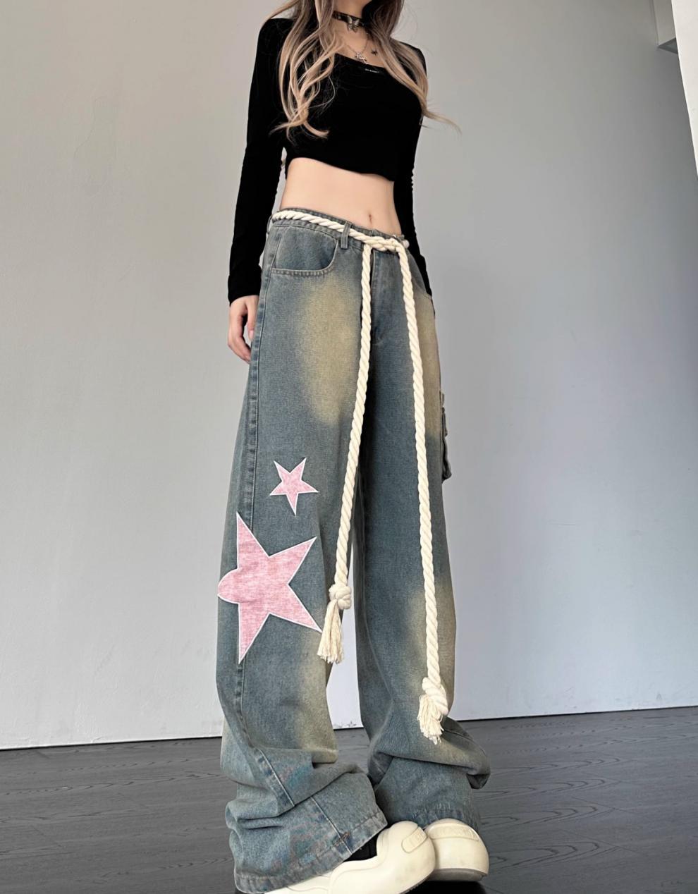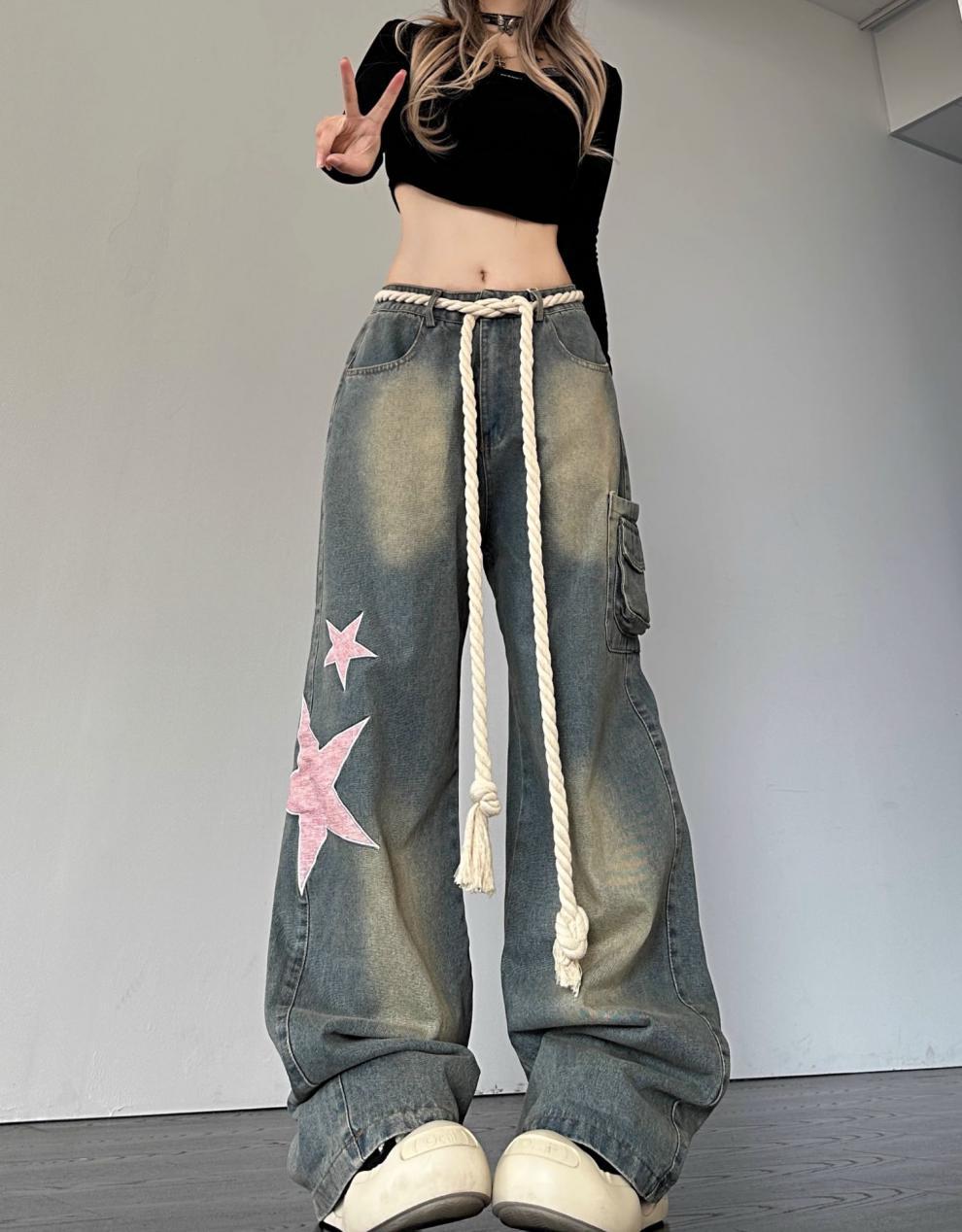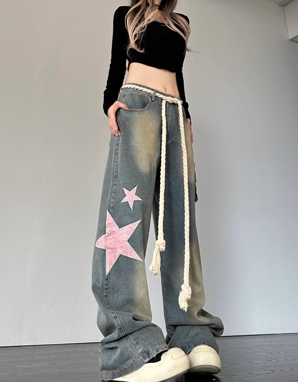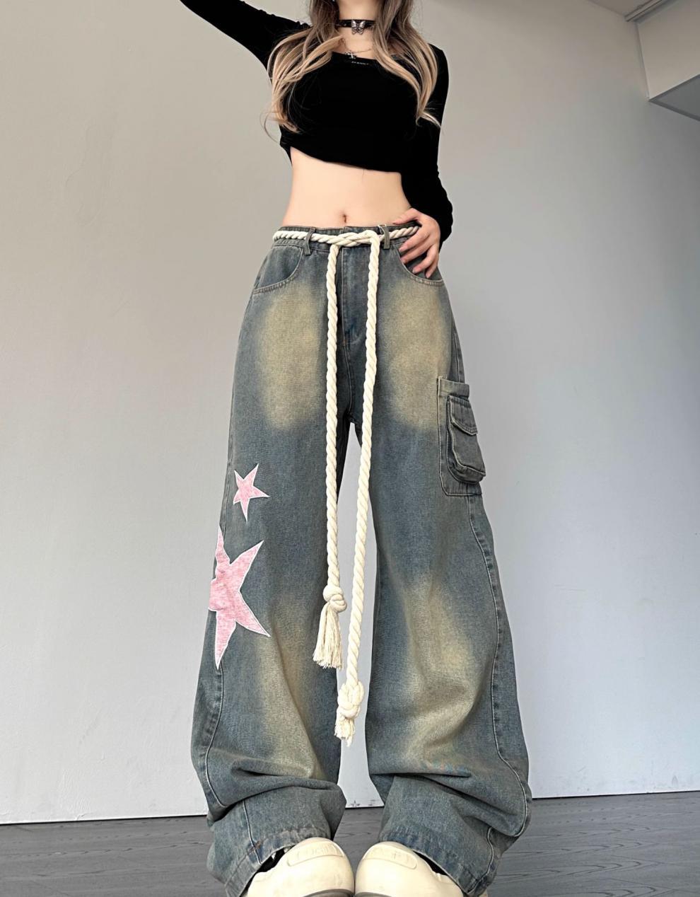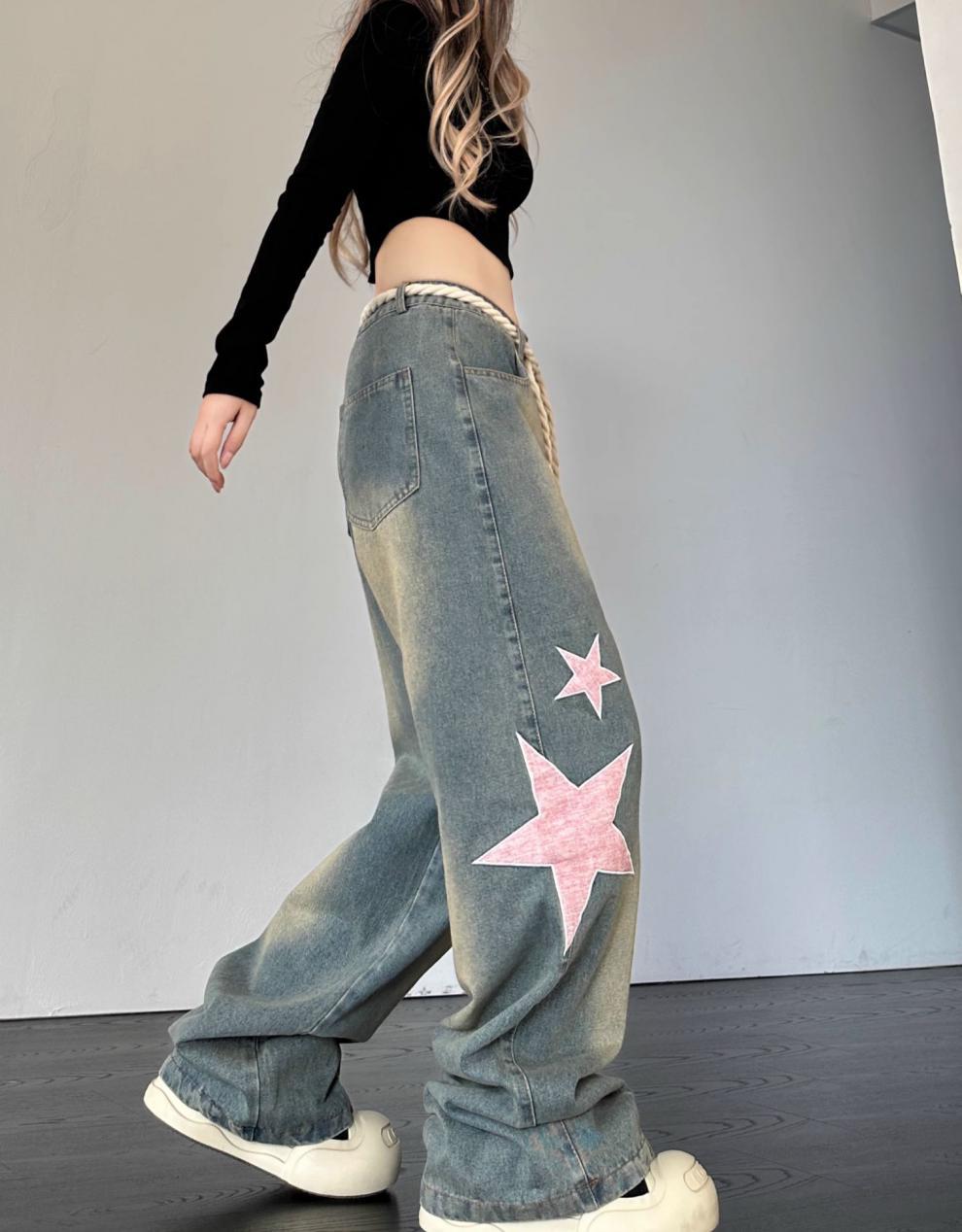 크로스 보더 아메리칸 레트로 스타 패치 디자인 청바지 여성 도파민 스트레이트 느슨한 슬리밍 틈새 바지스토어 가기