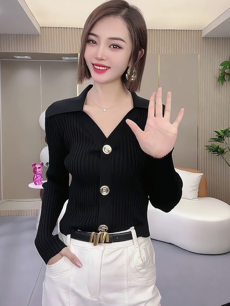 2023 봄과 가을 새로운 대형 여성용 우아한 V-목 순수한 욕망 스타일 슬림 핏 올 매치 풀오버 탑 여성의 Mercerized Cotton스토어 가기