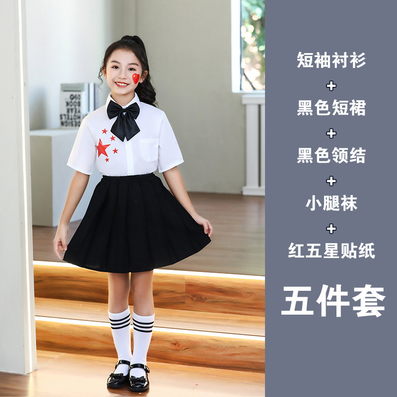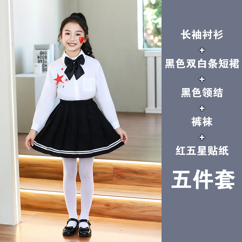 • 어린이 여아 흰색 긴팔 상의 + 검정색 미니스커트 + 검정 나비넥타이 + 스타킹 + 빨간색 별 다섯 개