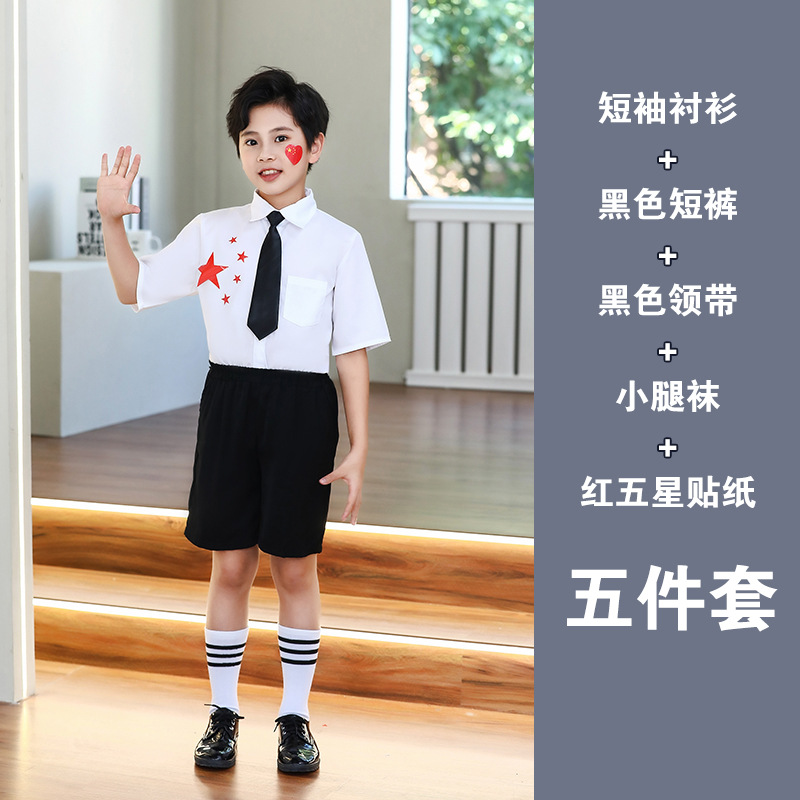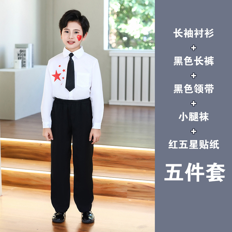 • 남성용 흰색 긴팔 셔츠 + 검정색 긴 바지 + 검정색 넥타이 + 종아리 양말 + 빨간색 별 다섯 개