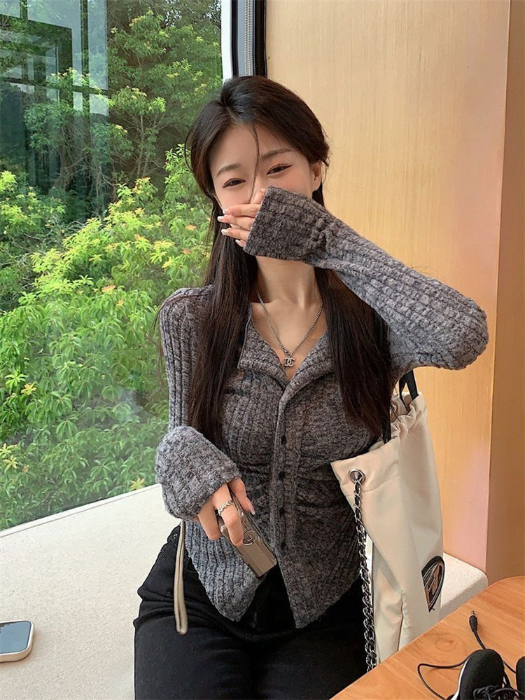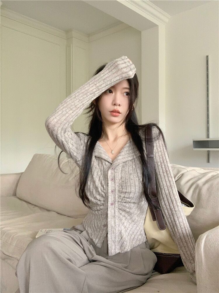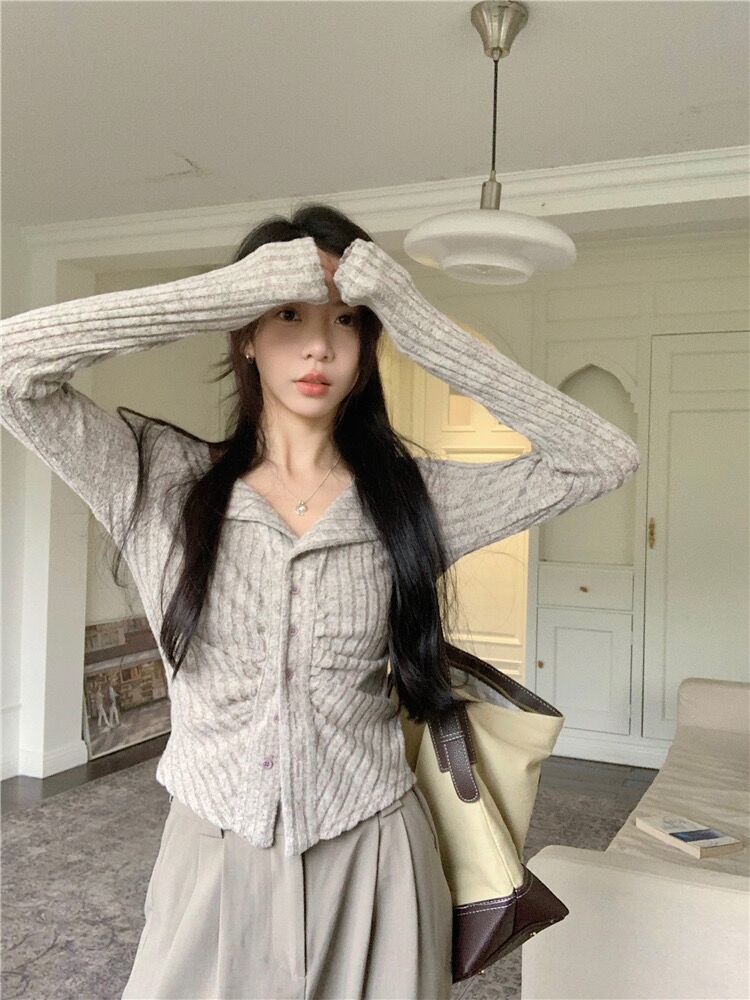 라펠 주름 긴팔 니트 여성 티셔츠 초가을 신상 슬림핏 디자인 독특한 블라우스 상의